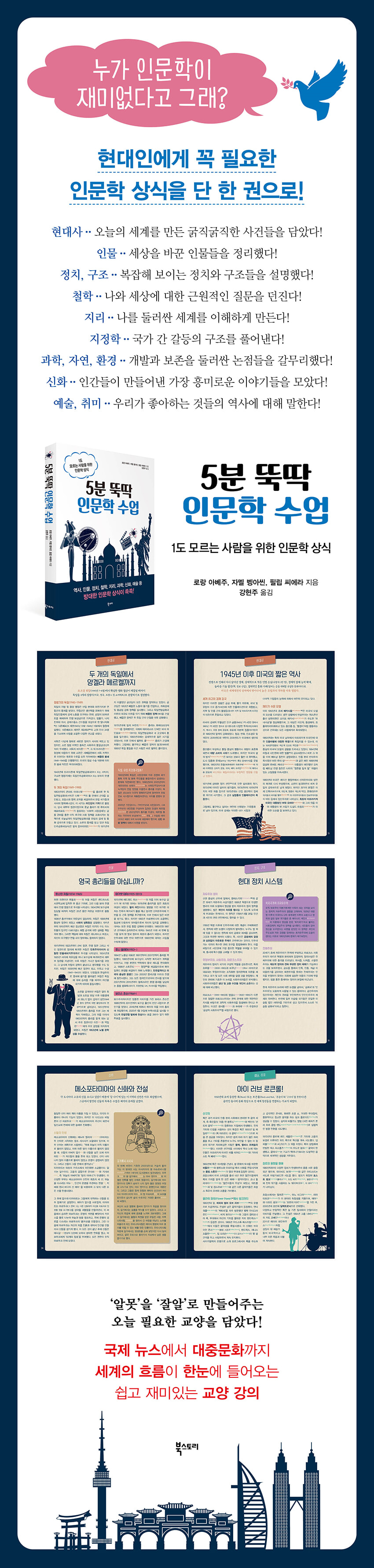 현 인류 5만 년의 역사를 통튼 것보다 격렬한 변화의 도가니였던 20세기 100년의 현대사를 통해 21세기 남은 80년, 가까운 미래를 내다본다! 매주 30개씩 다양한 주제의 상식을 읽으면서 지식의 깊이를 더하고, 그런 다음 한주 분량이 마무리될 때마다 객관식 문제 형식의 퀴즈를 통해 새롭게 습득한 지식을 확인해볼 수 있다. 첫째 주는 1990년에 베를린 장벽이 무너지면서 통일된 독일, 보통선거로 당선된 러시아 최초의 대통령 보리스 옐친, 고대 그리스에서 시작된 지도제작법, 최초의 지리학자 중 한 명인 헤로도토스, 혈통의 순수성을 유지하기 위해서 자신의 여동생과 결혼해야만 했던 이집트 파라오 등을 주제로 다루었다. 둘째 주는 우주에 간 최초의 인간 유리 가가린, 미군 네트워크용으로 만들어진 인터넷, 전 세계에서 통용되는 언어는 6천 개, 지표면의 70퍼센트를 차지하는 대양, 세계에서 가장 긴 현수교 샌프란시스코의 골든게이트 브리지 등을 주제로 다루었다. 셋째 주는 1948년에 국가로 선포된 이스라엘, 1990년에 발발한 첫 번째 걸프전, 세계에서 인구가 가장 많은 나라 중국, 지구 역사상 새로운 지질학적 시대인 인류세, 전쟁의 신 아레스의 아들로서 로마를 건설했다고 알려진 쌍둥이 형제 로물루스와 레무스, 루이 14세 때 처음 등장한 오페라 등을 주제로 다루었다. 넷째 주는 1962년부터 1990년까지 28년간 투옥된 넬슨 만델라, 1947년에 독립을 선포한 인도와 파키스탄, 50만 종의 다양한 식물 가운데 재배되고 있는 건 3천여 종, 전 세계 군사 지출비의 36퍼센트를 차지하는 미국 국방 예산, 뤼미에르 형제 및 조르주 멜리에와 더불어 19세기 말 프랑스에서 탄생한 영화 등을 주제로 다루었다. 다섯째 주는 변호사였던 간디, 1995년에 발효된 솅겐 협정, 1523년 이후 처음으로 이탈리아 출신이 아닌 교황 요한 바오로 2세, 거의 100퍼센트 아이슬란드와 노르웨이에서 생산되는 재생 가능한 전력, 그르넬 협정의 타결과 대학 개혁을 끌어낸 68운동, 1905년에 시행된 프랑스 정교 분리법 등을 주제로 다루었다. 이렇게 일주일에 30개의 주제, 모두 150개의 주제를 통해 세계 현대사와 지구 현실의 맥을 짚어낸다. 그런 예리한 진단과 분석을 통해 우리 지구 환경의 미래까지도 내다보게 한다. 가령, 환경은 국경이 없는데, 정치가 국경에 갇혀 저마다 이기적으로 돌아간다면 환경도 미래가 없다는 걸 분명하게 보여준다. |