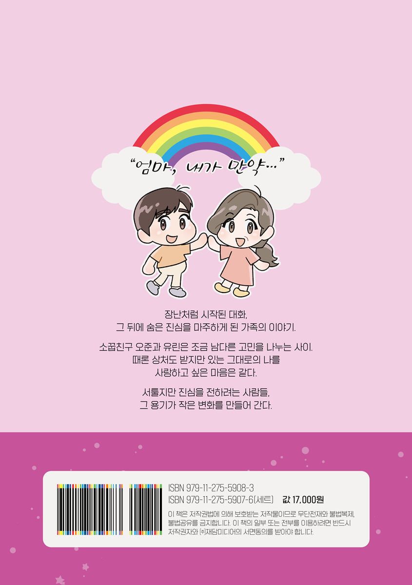 "작가님의 시선에서 우리의 이야기를 만났습니다. 아이의 커밍아웃을 마주했던 날의 혼란과 눈물, 그리고 사랑을 배워간 시간들이 이 이야기 속에 고스란히 담겨 있습니다. 『내 자식의 사생활』이 새로운 가족들에게 작은 빛이 되기를 진심으로 바랍니다." 〈내 자식의 사생활〉은 자녀의 동성애를 마주하게 된 두 엄마와 그 가족들의 갈등과 변화, 그리고 서로를 향한 이해와 화해의 과정을 그려낸 이야기다. 보름 작가는 작품 기획 단계에서 '성소수자부모모임'의 활동에 깊은 감명을 받았으며, 출간을 준비하며 해당 단체에 원고를 전달해 많은 공감과 추천을 받게 되었다. 게이인 아들과 레즈비언인 딸. 그 곁에 있는 가족들은 처음에는 혼란스럽고, 때로는 상처를 주기도 한다. 자녀의 동성애를 반대할 수밖에 없었던 엄마들 역시 각자의 삶과 사연을 안고 있다. 이 작품은 동성애를 그저 자극적인 흥미 요소가 아닌 현실적인 드라마로 진지하게 다루며, 성소수자와 가족이 함께 겪는 감정의 결을 섬세하고 따뜻하게 담아내며, 이해와 수용의 방향성을 제시한다. |