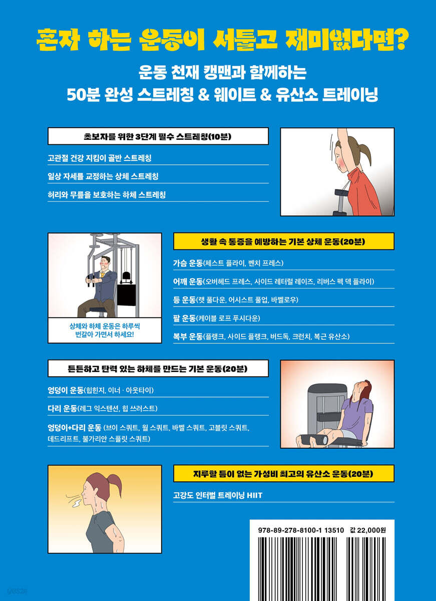 ■ 프롤로그 운동이 재미없고 어려웠던 당신, 이제는 캥맨과 함께! 16 PART 01 헬린이를 위한 3단계 필수 스트레칭 _스트레칭의 3단계 1단계 | 골반 스트레칭, 왜 중요할까? 01 네발 기기 스트레칭 1: 고관절을 풀어주는 스트레칭 28 | 02 네발 기기 스트레칭 2: 고관절을 풀어주는 스트레칭 29 | 03 비둘기 자세: 엉덩이 스트레칭 30 | 04 스쿼트 준비 자세: 허벅지 안쪽 스트레칭 31 | 05 벽 개구리 자세: 허벅지 안쪽 스트레칭 32 | 골반 스트레칭 총정리 34 2단계 | 자세를 교정하는 상체 스트레칭 01 가슴 활짝 스트레칭: 굽은 가슴을 펴주는 폼롤러 스트레칭 40 | 02 목 스트레칭: 경직된 목을 이완시키는 폼롤러 스트레칭 41 | 03 겨드랑이 스트레칭: 경직된 어깨를 이완시키는 폼롤러 스트레칭 42 | 04 가슴 이완 스트레칭: 가슴의 유연성이 향상되는 폼롤러 스트레칭 43 | 015 척추 가동 운동: 등 중앙과 가슴뼈 스트레칭 44 | 상체 스트레칭 총정리 48 3단계 | 허리와 무릎을 보호하는 하체 스트레칭 01 앞벅지 스트레칭: 하체 유연성을 개선하는 스트레칭 54 | 02 뒷벅지 스트레칭: 햄스트링을 풀어주는 스트레칭 55 | 03 종아리 스트레칭: 발목 통증을 줄여주는 스트레칭 56 | 04 발바닥 스트레칭: 족저근막염을 예방하는 스트레칭 57 | 하체 스트레칭 총정리 60 PART 02 웨이트 트레이닝을 위한 기본 도구 사용 설명서 _기본 도구 사용법만 알아도 근력 운동 혼자서 가능! 1단계 | 전신 운동과 스트레칭이 가능한 케틀벨과 밴드 01 케틀벨: 다양한 유산소 운동 70 | 02 밴드: 턱걸이와 스트레칭 71 | 03 케이블 머신 보조용품: 팔 운동에 필요한 로프, 숏바 72 | 04 랫 풀다운 보조용품: 등 운동에 필요한 와이드 바, 맥 그립 바 73 | 05 홈트에서 사용 가능한 다양한 소도구: 짐볼, 보수볼, AB 롤러 74 2단계 | 바벨 사용법 01 바벨을 이용한 운동: 대표 운동 3가지 82 | 02 바벨 종류 정리: 바벨의 형태와 클립 종류 83 | 03 바벨의 길이와 형태에 따라 가능한 운동: 다양한 바벨 운동 84 3단계 | 덤벨 사용법 01 전신 운동이 가능한 덤벨: 대표 운동 동작 89 | 02 덤벨의 모양과 무게: 한 쌍 일체형 소도구 90 PART 03 생활 속 통증을 예방하는 기본 상체 운동 _‘멋진 몸’보다 ‘잘 쓸 수 있는 몸’을 만드는 상체 운동 1단계 | 가슴 운동 체스트 플라이: 굽은 가슴을 교정하는 가슴 운동 98 01 체스트 플라이 핵심 포인트: 가슴 운동 102 | 02 체스트 플라이 기본 자세: 벌리기 103 | 03 체스트 플라이 기본 자세: 모으기 104 | 체스트 플라이 총정리 108 벤치 프레스: 탄탄하고 넓은 가슴을 위한 운동 110 01 바벨 잡는 법: 올바른 시작 자세 112 | 02 벤치 프레스 운동 방법: 내리기 115 | 03 벤치 프레스 운동 방법: 올리기 116 | 벤치 프레스 총정리 120 2단계 | 어깨 운동 오버헤드 프레스: 상체 정렬을 바로 잡는 어깨 운동 122 01 어깨 스트레칭: 밴드를 이용한 스트레칭 126 | 02 오버헤드 프레스 자세 잡기: 바벨 잡는 법 128 | 03 바벨을 들고 내리는 법: 밀고 내려오기 129 | 오버헤드 프레스 총정리 132 사이드 레터럴 레이즈: 탄탄한 어깨 만들기 기초 운동 134 01 사레레 기본: 올바른 자세와 동작 138 | 사레레 총정리 142 리버스 펙 덱 플라이: 굽을 등을 펴주는 최고의 운동 144 01 바른 자세 익히기: 리버스 펙 덱 플라이 147 | 02 벌리기: 리버스 펙 덱 플라이 148 03 모으기: 리버스 펙 덱 플라이 149 | 리버스 펙 덱 플라이 총정리 152 3단계 | 등 운동 랫 풀다운: ‘등’의 신이 되고 싶다면? 154 | 01 등에 제대로 된 자극 주기: 랫 풀다운 158 02 내리기와 올리기: 랫 풀다운 159 | 랫 풀다운 총정리 162 어시스트 풀업: 등 근육과 코어를 동시에 강화하는 운동 164 01 올바른 하체?상체 세팅법: 어시스트 풀업 168 | 02 올라가기와 내려가기: 어시스트 풀 업 169 | 어시스트 풀업 총정리 172 바벨로우: 등의 두께를 완성하는 운동 174 01 자세 세팅과 당기기: 바벨로우 178 | 02 내리기와 올바른 호흡: 바벨로우 179 | 바벨로 우 총정리 182 4단계 | 팔&복근 운동 케이블 로프 푸시다운: 늘어진 팔뚝살을 잡아주는 최고의 운동 184 01 잡기: 케이블 로프 푸시다운 188 | 02 내리기와 올리기: 케이블 로프 푸시다운 189 | 케이블 로프 푸시다운 총정리 192 효과적인 복근 운동 5: 뱃살 잡는 복근 운동 194 01 플랭크: 코어 운동 198 | 02 사이드 플랭크: 옆구리 운동 199 | 03 버드독: 코어 운동 200 | 04 크런치: 윗배 운동 201 | 05 복근 유산소: 아랫배 운동 202 | 복근 운동 총정리 206 PART 04 튼튼한 하체를 만드는 기본 운동 5 _우리 몸에서 가장 큰 근육이 존재하는 하체! 1단계 | 엉덩이 운동 힙힌지: 하체 운동의 기본, 힙힌지란? 212 01 힙힌지의 올바른 자세: 엉덩이 운동 216 | 02 힙힌지를 쉽게 하는 법: 줄 사용 217 | 힙 힌지 총정리 220 이너?아웃 타이: 생각보다 쉬운 하체 운동 222 01 엉덩이를 자극하는 아웃 타이: 엉덩이와 허벅지 226 | 02 엉덩이를 자극하는 이너 타이: 엉덩이와 허벅지 227 | 이너?아웃 타이 총정리 230 힙쓰러스트: 최고의 엉덩이 운동 242 01 올바른 자세 세팅: 힙쓰러스트 246 | 02 발바닥 사용법: 힙쓰러스트 247 | 03 올바른 호흡법: 힙쓰러스트 248 | 힙쓰러스트 총정리 250 브이 스쿼트: 하체 근육을 전반적으로 단련하는 운동 252 01 브이 스쿼트 기본 자세: 내려갈 때와 올라갈 때 256 | 