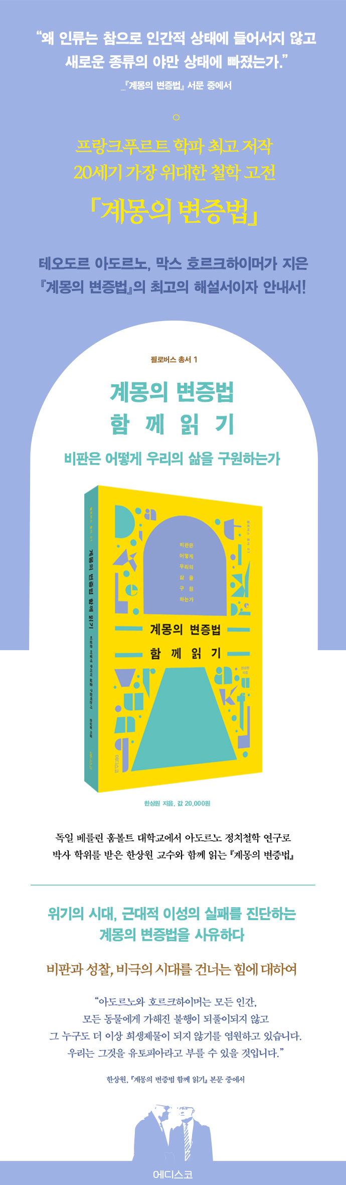 비판과 성찰의 힘에 대하여 독일 베를린 훔볼트 대학교에서 아도르노 정치철학 연구로 박사 학위를 받은 한상원 교수와 함께 읽는 『계몽의 변증법』 위기의 시대, 근대적 이성의 실패를 진단하는 계몽의 변증법을 사유하다 과학 기술이 발전하고, 경제가 성장하고, 교육 수준은 높아졌지만, 우리의 삶은 더 나아진 것 같지 않다. 높은 자살률과 직장 내 스트레스 지수 등 다양한 지표가 한국 사회의 어두운 현실을 보여준다. 모든 걸 자기 책임으로 여기게 만드는 신자유주의 논리 속에서 현대인들은 번아웃에 시달리고, 타인에 대한 혐오 나아가 자기 자신에 대한 혐오 감정 속에서 고립되어 가고 있다. 각자도생과 무한경쟁의 논리가 만들어 내는 불안정성과 불평등에 우리는 병들어가고 있다. 또 환경 파괴로 인한 기후 변화로 인해 지금 전 세계가 심각한 위기 속에 놓여 있다. 우리의 삶은 왜 이토록 위태로워진 것일까. 지금으로부터 100년 전, 1923년에 만들어진 프랑크푸르트 사회조사연구소의 사상가들, 이른바 프랑크푸르트 학파(비판이론) 지식인들도 이와 똑같은 질문을 던졌다. “왜 인류는 참으로 인간적 상태에 들어서지 않고 새로운 종류의 야만 상태에 빠졌는가.” _아도르노, 호르크하이머, 『계몽의 변증법』 서문 중에서 프랑크푸르트 학파 1세대를 대표하는 사상가인 아도르노와 호르크하이머가 공동 집필한 『계몽의 변증법』은 위와 같은 질문에서 시작한다. 그들은 묻는다. 근대 철학이 발흥하고, 칸트, 헤겔, 마르크스 등을 거치면서 철학이 구현하려고 했던 계몽, 즉 합리성, 지성, 이성을 토대로 인간의 자유와 해방을 달성하려고 했던 사유 운동은 왜 이상적 상태가 아니라 파시즘과 세계대전이라는 파국으로 귀결되었는가. 인간이 기대하던 진보는 왜 비극을 맞이했는가. 한상원 저자에 따르면 프랑크푸르트 학파 1세대 지식인들은 바이마르 공화국에 대한 희망과 좌절을 경험했고, 나치즘의 위기와 세계대전, 아우슈비츠 학살을 겪었다. 따라서 이들의 이론에는 바로 그러한 시대 경험이 응축되어 있고, 이렇게 비극으로 귀결된 역사를 해명하고자 하는 철학적 소명이 자리 잡고 있다. 사회조사연구소의 소장으로 프랑크푸르트 학파의 전성기를 이끌었던 호르크하이머를 비롯해 아도르노, 에리히 프롬, 헤르베르트 마르쿠제 등 연구소 지식인들은 나치 정권의 탄압을 피해 기나긴 망명 생활을 해야 했다. 이 망명 생활 중에 아도르노와 호르크하이머가 1944년 할리우드가 있는 미국 캘리포니아에서 함께 집필한 책이 바로 『계몽의 변증법』이다. 한상원 저자는 『계몽의 변증법』은 1940년대, 전체주의의 폐해가 극에 달한 상황에서 전체주의의 피해 당사자이기도 한 두 유대인 지식인들이 발행한 최초의 철학적인 전체주의 분석이라고 소개한다. 아도르노와 호르크하이머는 이 책에서 ‘계몽과 계몽이 대변하려고 했던 근대적 이성이 어째서 실패했는가’를 주로 규명하면서 전체주의 분석을 이성 비판과 연결하는 철학적 작업을 수행한다. 그들은 계몽이 대변하려고 했던 이성을 도구화된 이성이라고 비판하고, 이런 근대적 이성이 만들어 낸 세계는 “보편타당한 도덕법칙이 아니라, 인간이 다른 인간을 능력의 이름으로, 성과와 효율의 이름으로 차별하는 것이 ‘공정’하다고 받아들여지는 탈도덕화된 세계”(한상원, 99쪽)라는 걸 밝힌다. 한상원 저자는 이런 논의는 1940년대뿐만 아니라 21세기에도 여전히 유용하다고 역설한다. “아도르노와 호르크하이머의 사유가 오늘날 여전히 우리에게 주는 의미는 민주주의의 위기에 대한 진단, 그리고 민주주의라는 ‘정상성’에 내재한 파시즘의 ‘야만’에 관한 냉철한 시선에 있다고 할 수 있다. 나아가 ‘탈진실’과 ‘반지성주의’라는 이름으로 오늘날 출현하고 있는 일련의 징후적인 흐름들과 정치의 권위주의화라는 추세는 저자들이 분석하는 ‘계몽의 실패’ 혹은 ‘계몽의 신화로의 전도’라는 명제들과 어떤 연관성이 있는지 추적해 볼 수 있을 것이다. 또 기후위기와 기후재난의 시대에, 이 저작이 제출하고 있는 자연 지배 비판과 ‘자연과의 화해’에 관한 전망이 지닌 의미 역시 재사유될 필요가 있을 것이다.” _한상원, 『계몽의 변증법 함께 읽기』, 12쪽 계몽, 이성, 합리성, 진보와 같은 개념들의 한계를 지적하는 아도르노와 호르크하이머 사상에서 ‘부정성’, 다른 말로 ‘비판’은 매우 중요하다. 이들은 계몽과 이성을 비판함으로써 역설적으로 그것의 본래 역할을 되찾아야 한다고 보았다. 비판과 성찰, 비극의 시대를 건너는 힘 『계몽의 변증법』에서 아도르노와 호르크하이머는 비판을 거치지 않은 계몽이 신화로 퇴보하고, 인간과 자연을 지배하는 원리가 되면서 파국적인 인류 역사가 나타났다고 보았다. 그리고 아도르노와 호르크하이머는 인간을 해방시켜 준다고 믿었던 주체의 사유가 인간 지배의 원리가 되고, 인간을 예속으로부터 자유롭게 해준다고 믿었던 계몽의 합리성이 지배로 전도된 과정을 해명한다. 또 아도르노와 호르크하이머는 자기반성과 성찰 없는 계몽의 퇴보가 정신의 사물화와 연결되고 그것