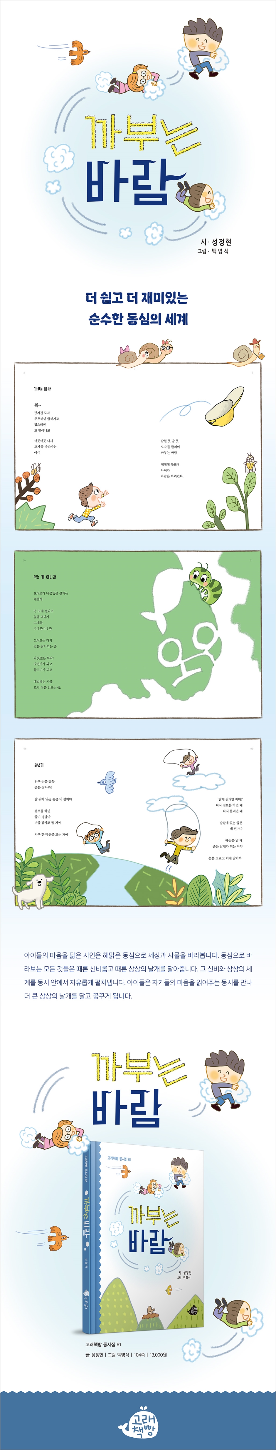 1부 색종이 얼굴 까부는 바람 / TV와 리모컨 / 옷걸이 / 장래 희망 / 놀기 교과서 / 학교 가는 달팽이 / 칭찬 거품 / 바다 사막 / 색종이 얼굴 / 그림자처럼 / 오로라 꿈길 / 단짝 / 창문 틈으로 / 행복 페이지 / 산 가득 / 휘파람새 / 하얀 운동장 2부 선인장 이사 가는 날 까만 새 / 싶은 마음 / 봄이 날아가요 / 실내화 / 스테인드글라스 / 장난치다가 / 선인장 이사 가는 날 / 놀자골목 / 그럴 때는 / 가로수 / 꿈 / 빨리빨리 / 엄마의 꽃구경 / 바퀴 / 오렌지 달리기 / 기찻길 / 그림자 색깔 / 궁금하기 시작했다 3부 안경의 비밀 집게야, 근데 / 물들어서 / 나비 / 먹는 게 아니라 / 합창 / 책장 넘길 때 / 터널 / 나뭇잎 튀김 / 안경의 비밀 / 몰래 탄 엘리베이터 / 민들레 / 새똥 놀이 / 양산 / 아이스크림 / 꼬리로 말해요 / 연필깎이 / 이름 꽃 4부 솜사탕 나무 잡았다, 연필 / 기다리는 시간 / 깍두기 구름 / 생선 가시 / 인형 뽑기 / 손과 발 / 여름 빼고 / 코피 / 지우개 / 솜사탕 나무 / 단풍잎 / 치 / 눈발 / 밥솥 / 줄넘기 / 다시 만나면 / 다리는 / 열려라! 바다 마트 |