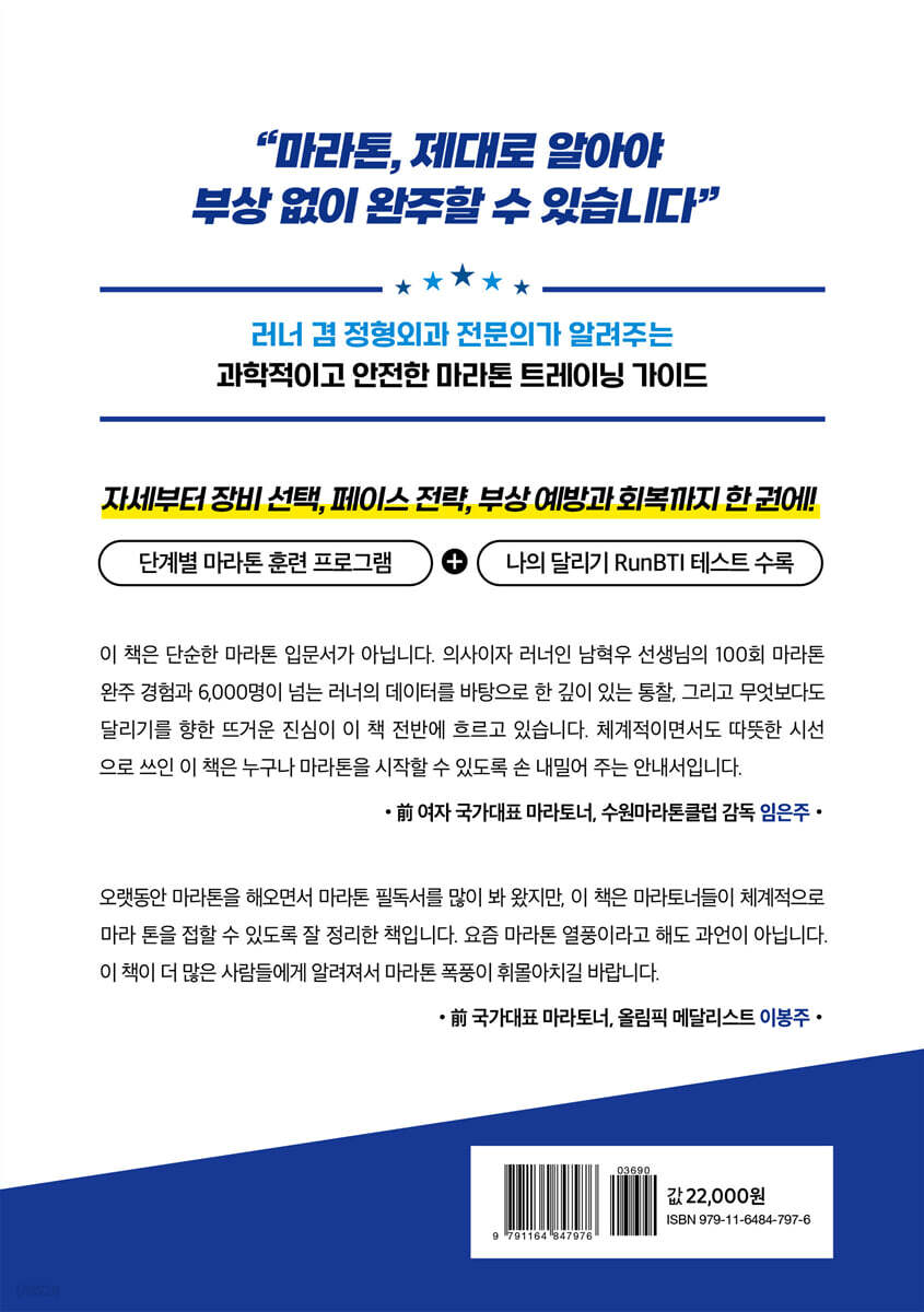 저는 1980년대 대한민국 여자 마라톤 1세대로 뛰며, 수많은 트랙과 도로를 달려왔습니다. (…) 저 역시 오랜 운동선수로서 부상을 두려워했고, 많은 러너가 잘못된 훈련으로 달리기를 중단하는 안타까운 현실을 보아왔습니다. 그러나 이 책은 부상 예방과 회복에 대한 실질적 조언은 물론, 훈련 계획과 정신적인 준비까지 촘촘히 짚어 줍니다. 체계적이면서도 따뜻한 시선으로 쓰인 이 책은, 마치 오랜 코치이자 친구가 옆에서 함께 달려주는 듯한 느낌을 줍니다. (…) 남혁우 작가님의 글을 따라가다 보면 어느 순간 두려움보다 기대가 커지고, 망설임보다 용기가 앞설 것입니다. - 임은주 (전 국가대표 마라토너, 수원 마라톤클럽 감독)
