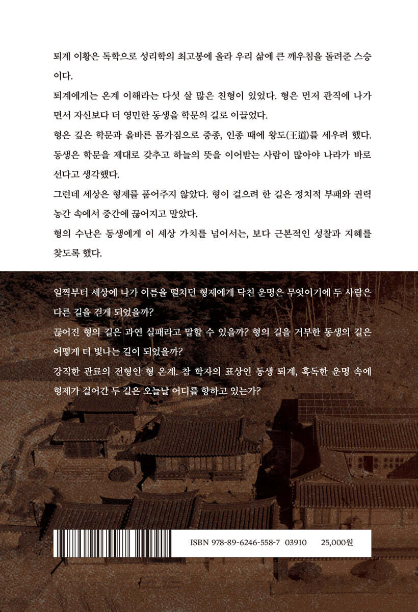 형은 호를 온계(溫溪)라 했다. 사람들은 두 형제를 금곤옥제(金昆玉弟: 금쪽같은 형, 옥쪽같은 동생)라 불렀다. 앞서 나가는 형은 동생의 학문과 처세에 길을 열어주었다. 조선 중종(中宗) 시대에 두 형제는 세상에 빛을 드러냈고, 실제로 밝은 빛이 났다. 그러나 세상은 그 형제를 감싸주지 못했다. 너무 거칠고 혼탁했다. 그래도 형은 세상을 바로 세워보려고 했고, 동생은 사람 마음을 올바로 잡으려고 했다. 급기야 세상을 바로 세워보려 했던 형이 진애(塵埃)의 풍파 속에 험한 바람을 맞고 그만 중도에 쓰러졌다. 동생은 이런 참혹한 일을 당하고는 더욱 학문과 수양과 교육에 전념했다. 인간이 바로 되어야 나라가 바로 선다. 형의 이름은 세상의 기억에서 멀어졌지만, 동생은 학문과 덕행과 몸가짐으로 우리 역사에서 지성(知性)을 밝히는 큰 별이 되었다. 온계라는 형은 동생의 힘든 삶의 길을 비춰준 등불이었다. 『조선왕조실록(朝鮮王朝實錄)』에 잠자고 있는 도승지(都承旨), 대사헌(大司憲), 대사간(大司諫) 등을 거쳐 간 그의 발자취는 우리가 퇴계의 형 온계를 얼마나 모르고 있는지를 일깨워주기도 한다. 두 형제가 주고받은 시들은 형제가 얼마나 서로 의지하고 기쁨과 슬픔을 나누었는지 형제애를 진하게 느끼게 해준다. 퇴계가 형에게 보낸 편지들에서 많은 시간 동안 형이 동생에게 큰 버팀목이 되었음을 발견하게 된다. 형이 걸어간 길은 어쩌면 동생에게서 잘 드러나지 않은 선비의 다른 모습일지도 모른다. 방송 기자요 언론인이었던 저자가 역사 속에 가려진 퇴계의 형 온계(溫溪) 이해(李瀣)와 동생 퇴계(退溪) 이황(李滉)의 숨은 역사를 찾아 그 실상(實相)을 처음으로 드러내 보여주는 노작(勞作)을 세상에 내놓았다. 저자는 일찍이 KBS에서 아메리카 대륙을 국산 자동차로 넉 달 동안 달리며 21세기 문명의 길을 탐색했고, 방송 사상 처음으로 실크로드 5천 킬로미터를 답사하며 동양 역사를 종횡으로 조명했다. 백남준을 비롯한 윤이상, 이우환 등 예술인들을 만나 인터뷰했고, 탈북자 문제를 처음 취재, 보도해 우리 사회에 큰 메시지를 던지는 등 방송의 영역을 넓힌 공로로 은관문화훈장(銀冠文化勳章)을 받기도 했다. 젊은 날 대학에서 영어영문학을 공부했던 솜씨로 20권이 넘는 책을 펴내기도 했다. 그때의 문제의식과 열정을 그대로 가지고 있는 저자가 이번에는 역사의 창고 속에 잠자는 실록과 한문(漢文) 자료들을 열어 온계라는 인물을 다시 살려내고, 거기서 퇴계의 위대함을 새로 보게 해준다. 우리 속담에 ‘그 형에 그 동생’이라는 말이 있다. ‘형보다 나은 아우는 없다’라는 말도 있다. 두 말이 다 맞는 말임을 저자는 이번 작업으로 증언한다. 동생 퇴계 이황이 가지 않은 길, 그 길을 묵묵히 걸어간 온계 이해라는 형, 두 형제의 서로 다른 길은 세상 도덕이 혼탁하고 정신적 좌표가 사라진 오늘날 우리 사회와 지금의 우리에게 던지는 바가 실로 크다고 하겠다. 필자가 책임자로 있는 한국국학진흥원이 얼마 전 온계 이해의 유고집인 『온계일고(溫溪逸稿)』를 우리말로 번역, 출간한 것이 저자의 이번 작업에 기여한 것도 기쁘게 생각한다. 탐구는 고독하고 힘든 길이다. 마침내 우리 역사 속의 이 두 형제의 삶을 통해 정신사(精神史)의 새 지평을 열어 보여준 저자의 식지 않는 열정에 큰 박수를 함께 보낸다. 감히 추천의 말로 일독을 권한다. - 정종섭 (한국국학진흥원장) |