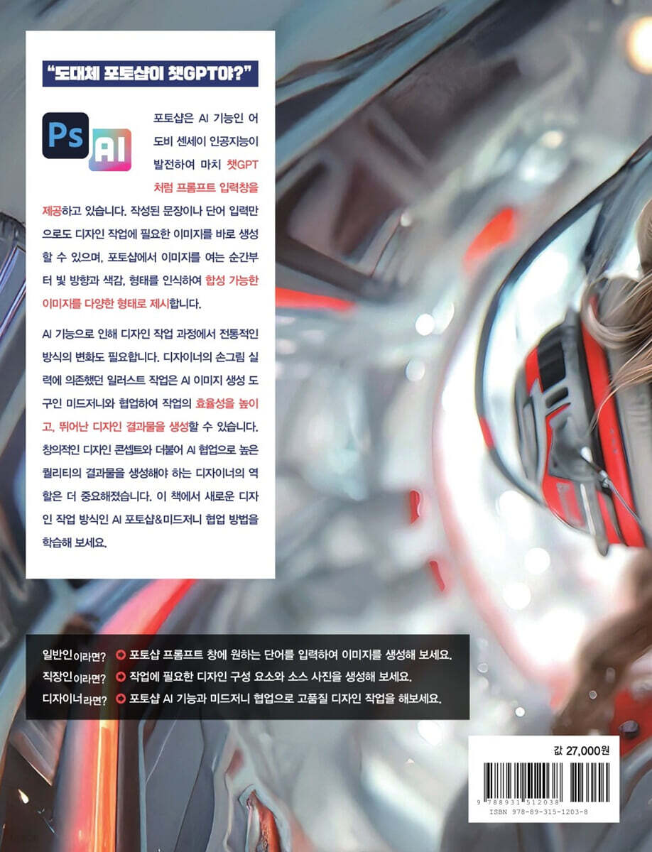 이 책의 예제 미리보기 이 책의 구성 PART 1. 챗GPT 닮아가는 포토샵! 쉽고 빠르게 포토샵 AI 배우기 01. 프롬프트 입력으로 이미지 생성과 합성이 가능한 포토샵 AI __전통적인 포토샵 작업 과정의 변화 02. 프롬프트 창에서 이미지 생성하기 __프롬프트 입력 방법으로 이미지 생성하기 03. 간결하게 프롬프트 입력을 잘하는 노하우! __작업 과정을 예측하여 제안한 도구 사용하기 04. AI 이미지 생성을 위한 포토샵 설치하기 __포토샵 무료 설치하기 __기존 포토샵 사용자의 포토샵 베타 앱 설치하기 __포토샵 실행하기 05. 포토샵 인터페이스 살펴보기 06. 명령어를 아이콘화한 포토샵 도구 알아보기 07. 문자로 이미지를 생성하는 〔Contextual Task Bar〕 알아보기 08. 디테일한 이미지 생성을 위한 프롬프트 입력창 알아보기 PART 2. 꼭 알아야 할 기능만 픽! 텍스트로 작업하는 포토샵 AI 기능 마스터 01. 프롬프트 입력창으로 인물을 생성하려면? 02. 외부 참조 이미지로 동일한 스타일 이미지를 생성하려면? 03. 디자인 스타일에 맞게 문자와 로고를 생성하려면? 04. 포즈에 맞게 인물의 옷을 변경하려면? __변경하려는 의상 영역 지정하기 __프롬프트 창에서 발레복으로 변경하기 __문장으로 섬세하게 의상 변경하기 05. New! 감쪽 같이 없애는 리무브 도구를 사용하려면? __인물과 서프보드 지우기 __인물만 지워 서프보드 복원하기 06. 인물을 제외한 배경 이미지를 바꾸려면? __선택 영역 지정과 반전하기 __배경 이미지 합성하기 07. 불필요한 요소가 있는 공간을 자연스럽게 채우려면? __하늘 영역에 구름 이미지 합성하기 __불필요한 영역 채우기 __호숫가 이미지로 영역 채우기 08. 원하는 아이템 장착! 이미지 구성 요소를 생성하려면? __데크 위의 강아지 생성하기 __호숫가의 보트 생성하기 __불켜진 가로등 생성하기 09. 보정 스타일을 보면서 이미지를 보정하려면? __보정 스타일 선택하기 __사용자 보정하기 10. 인물과 겹쳐져 있는 피사체를 변경하려면? __피사체 변경하기 11. 이미지를 생성하여 배경 이미지를 확장하려면? __이미지 확장하기 __연결 이미지 생성하기 12. 반복 없이 한 번에 그러데이션 효과를 적용하려면? __안내선으로 그레이디언트 범위 지정하기 __그레이디언트 효과 변경하기 13. 피부 보정과 표정을 한번에 변경하려면? __피부 보정하기 __표정 변화시키기 PART 3. 필수 예제로 배운다! 현장에서 사용하는 포토샵 AI 실무 실습 01. New! 그레이디언트를 이용한 리플릿 디자인 __3단 접지 리플릿 판형 만들기 __밋밋한 동물 이미지에 텍스처 적용하기 __그레이디언트 만들어 이미지와 레이아웃하기 __동물 이름과 본문 내용 디자인하기 __QR 코드 생성하여 디자인하기 __리플릿 표지 디자인하기 __프롬프트를 이용하여 꿀단지와 풀꽃 이미지 생성하기 __리플릿 안쪽 면 디자인하기 02. 이미지 확장으로 만든 벽걸이 캘린더 디자인 __이미지 확장하여 생성형 채우기 __펜 도구로 콜라주 기법의 면 그리기 __패스를 이용하여 면에 색상 적용하기 __점과 선 패턴 만들어 등록하기 __점과 선 패턴 적용하여 콜라주 기법 만들기 __도형 추가하여 그림자 만들기 __벽걸이 캘린더 숫자판 디자인하기 03. 디자인 요소 생성과 타이포그래피의 결합, 책 표지 디자인 __책 표지 판형에 맞게 레이아웃하기 __레이어 마스크를 이용하여 한글과 영문 타이포그래피 디자인하기 __영문 타이포그래피에 꽃 이미지 합성하기 __프롬프트를 이용하여 꽃과 나비 생성하기 __책 제목과 출판사 심볼 레이아웃하기 __패턴을 만들어 타이포그래피에 적용하기 04. AI로 만든 아트적인 일러스트를 이용한 패키지 디자인 __지기 구조와 AI 생성 이미지 가져오기 __이미지 확장하여 생성형 채우기 __패키지 앞면 디자인하기 __패키지 뒷면 디자인하기 __패키지 측면 디자인하기 __패키지 윗면과 아랫면 디자인하기 PART 4. 일러스트레이터? 이젠 AI로 그린다! 포토샵과 미드저니로 실무 디자인하기 01. 텍스트로 그리는 마법, 이미지 생성 인공지능 미드저니 __글 하나로 그려지는 미드저니 활용하기 __미드저니 첫 스텝, 프롬프트 작성하기 02. 미드저니 설치하기 __미드저니 가입하기 __미드저니 구독하기 __나만의 서버를 만들어 작업하기 03. 미드저니 인터페이스 살펴보기 04. 꼭 알아두어야 할 미드저니 명령어 __같은 분위기, 다른 형태로 발전시키는 명령어 ‘V’ __선택한 이미지를 크게, 명령어 ‘U’ __미드저니 봇 채널 명령어 05. 환상적인 상업 포스터 광고 제작하기 __미드저니에서 비현실적인 광고 이미지 시안 생성하기 __프롬프트 삽입하여 심플한 이미지로 수정하기 __참고 이미지 제공하여 의도하는 형태 잡기 __프롬프트 수정하여 환상적인 분위기 강조하기 __비현실적인 이미지를 만들어 메인 비주얼로 강조하기 __초현실주의적 느낌으로 화풍 변경하기 __포토샵에서 캔버스 크기 늘리고 이미지 채우기 __구름과 멀리 날아가는 새 이미지 삽입하기 __브랜드 로고 삽입 후 전체적인 색감 조정하기 06. 입체감이 살아있는 3D 브랜드 심볼 디자인 __도넛과 시계가 합성된 심볼 제작하기 __프롬프트 수정하여 입체 심볼 이미지 추출하기 __포토샵에서 배경 삭제하기 __브랜드 로고 타입 삽입하기 