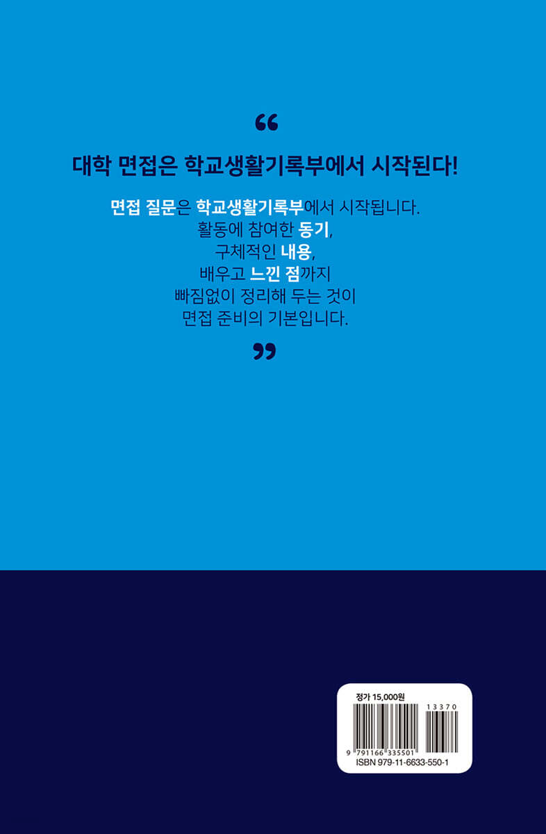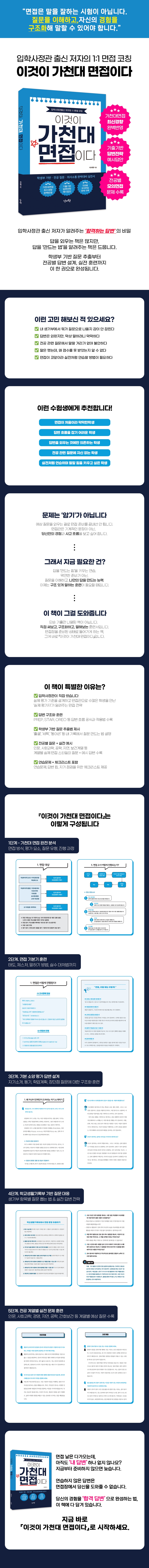 ※ 2026학년도 수시 모집전형 ※ 2026학년도 주요 변경사항 ※ 수시 모집인원 1. 면접 대상 2. 면접 방식 3. 면접 평가 요소 및 평가 목표 4. 면접에서 평가하는 질문 유형 5. 면접 고사 어떻게 진행되는가 6. 가천대 면접 고사, 그것이 알고 싶다! Ⅱ. 면접의 기본기 1. 면접은 이렇게 진행된다! 2. 면접 시 이런 점에 유의하자! 3. 고득점을 위한 면접 노하우! ※ 면접, 이럴 때는 이렇게! ※ 면접 고사를 위한 체크리스트 Ⅲ-1. 기본 소양을 평가하는 질문 1. 왜 자신이 인재인지 드러내는 자기 소개하기 2. 지원 동기와 학업 계획 말하기 3. 자신의 장단점 소개하기 4. 좋아하는 과목과 싫어하는 과목 말하기 5. 기억에 남는 책 언급하기 Ⅲ-2. 기본 소양 질문 연습 문제 Ⅳ. 학교생활기록부 기반 질문 ※ 학교생활기록부에서 면접 문항 추출하기 1. ‘출결 상황’은 ‘미인정’의 경우를 주의하라 2. 자율·자치 활동은 본인이 수행한 역할과 특성에 주목하라 3. 동아리 활동에서는 전공과 관련된 활동 중심의 질문들이 많다 4. 봉사 활동은 참여동기, 성장 여부 등에 주목하라 5. 진로 활동은 전공 관심도와 진로 탐색 노력을 주목하라 6. 교과학습 발달상황에서는 교과를 주도적으로 선택해 이수했는지 주목하라 7. 세부능력 및 특기사항에서는 자기주도적 학습과정과 성장의 모습에 주목하라 8. 행동특성 및 종합의견에서는 교사 평가의 근거에 주목하라 Ⅴ. 전공 계열별 연습 문제 인문계열 사회과학계열 경영, 경제계열 자연계열 공학계열 간호보건계열 |
