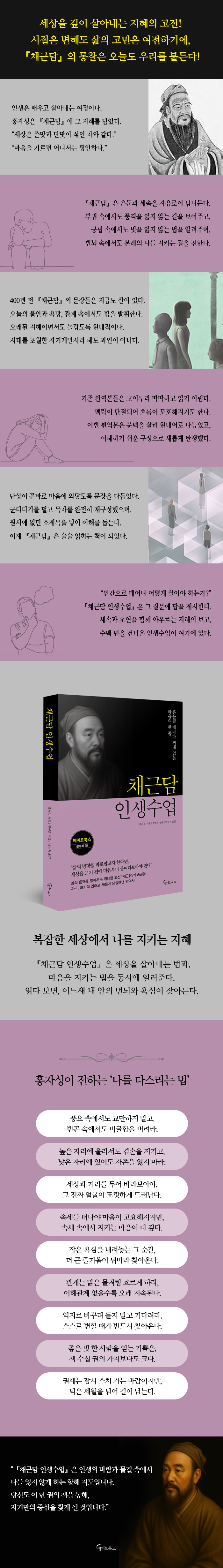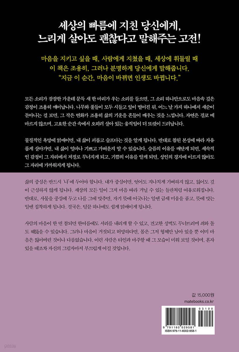 1장 마음이 바뀌면 인생이 달라집니다 마음이 밝으면 빛이 되고, 어두우면 그림자가 드리웁니다 | 괴로움 속에서도 기쁨을 찾고, 뜻을 이룬 뒤엔 슬픔이 옵니다 | 병은 깊은 곳에서 시작되니 겉보다 속을 먼저 살펴야 합니다 | 조급한 성질은 불길 같고, 차가운 마음은 얼음 같습니다 | 마음을 비워야 의리가 머물고, 마음을 채워야 욕심이 들어오지 않습니다 | 귀와 눈은 외부의 도적이고, 본심은 집안의 지킴이입니다 | 고요할 때 마음은 맑아지고, 담담할 때 참맛을 알게 됩니다 | 고요함은 움직임 속에서도, 즐거움은 괴로움 중에도 옵니다 | 마음을 늘 원만히 살피면 세상은 결함 없이 빛납니다 | 참된 마음은 큰일도 해내고, 거짓 마음은 부끄러움뿐입니다 | 말이 자연스러우면 인품도 본연의 빛을 냅니다 | 사소한 일도 허투루 말고, 어두움 속에도 진실해야 합니다 | 분노와 욕심이 치밀어도 마음만 바꾸면 달라집니다 | 마음이 어둡고 산만할 때는 스스로를 맑고 밝게 해야 합니다 | 마음은 우주의 운행처럼 막힘없이 흘러야 합니다 | 욕심을 이기는 길은 앎과 힘을 함께 갖추는 일입니다 | 몸은 작은 우주 같아서 감정이 균형을 이뤄야 합니다 | 진실한 마음이 없다면 모든 일은 헛되기 마련입니다 | 올바른 마음이 기초이고, 기초가 튼튼해야 오래갑니다 | 마음을 비우면 본성이 드러나고, 생각이 맑아야 마음도 밝아집니다 | 마음은 하늘의 모습을 닮아 기쁨과 성냄 모두 자연입니다 | 일이 없을 땐 마음을 고요히 하고, 일이 있을 땐 중심을 잡으십시오 | 한결같이 자상한 마음은 천지에 온기를 전합니다 | 자연의 소리와 빛도 마음을 전하는 표현입니다 | 사물 속 정취를 깨닫고 세상을 마음에 담으십시오 | 가난은 막기 어려워도 걱정은 다스릴 수 있습니다 | 산과 샘물을 따라 걷다 보면 마음도 점점 맑아집니다 | 욕심 가득한 마음은 파도치고, 비운 마음은 평온을 느낍니다 | 냉정한 눈으로 바라보면 괴로움도 줄어듭니다 | 마음에 바람과 파도가 없으면 세상도 고요해집니다 | 잡념을 내려놓고 지금에만 머무르면 됩니다 | 세속의 눈은 어지럽고 이치의 눈은 단순합니다 | 마음이 깨어 있으면 다 극락이고, 깨닫지 못하면 절도 세속입니다 | 마음이 맑고 고요하면 모든 순간이 진실입니다 | 몸은 일 안에 있어도 마음은 항상 일 밖에 둡니다 | 마귀를 물리치려면 자기 마음부터 다스려야 합니다 | 마음속 얼음과 숯불은 없애기가 매우 어렵습니다 2장 사람과의 관계는 태도에서 갈립니다 남의 허물은 덮고, 내 마음은 덕으로 채웁니다 | 덕을 베풀되 흔적 없이, 은혜를 주되 기대 없이 | 지나친 호의보다는 작은 정성이 감동을 줄 수 있습니다 | 스스로를 앞세우지 말고, 한쪽 말에 휘둘리지 마십시오 | 남의 허물은 감싸고, 완고함은 부드럽게 다스리세요 | 과묵한 사람에겐 조심하고 성급한 사람 앞에선 말을 아낍니다 | 속은 줄 알아도 드러내지 말고, 모욕받아도 흔들리지 마십시오 | 경계는 하되 해치지 말고, 의심은 줄이고 살핌은 더하십시오 | 칭찬은 조심스럽게 시작하고, 말은 신중하게 꺼내야 합니다 | 가까운 사이일수록 질투가 더 깊을 수 있습니다 | 공로는 드러나게 베풀고, 은혜는 조용히 베풉니다 | 쥐구멍은 남겨두고, 너무 몰아붙이지 마십시오 | 공은 나누지 말고, 환난만 함께하십시오 | 반성은 길을 열고, 원망은 뿌리를 내립니다 | 성실함은 믿음에서, 의심은 내 마음에서 시작됩니다 | 따뜻한 마음은 살리고, 각박한 마음은 시들게 합니다 | 오랜 인연일수록 새로운 마음으로 대합니다 | 자기 자신에겐 엄격하고, 남에게는 너그러워야 합니다 | 은혜는 점차 후하게, 위엄은 점차 너그러워야 합니다 | 속이는 이는 감동시키고, 사나운 이는 온화함으로 대합니다 | 몸가짐은 너무 깔끔하게 유지하지 말고, 착함과 나쁨 모두 품으십시오 | 속 좁은 자와는 거리를 두고, 덕 있는 자에겐 아첨하지 마십시오 | 은혜는 잊어도 원한은 갚고, 타인의 좋은 점은 의심하지 마십시오 | 비방은 구름처럼 가리고, 아첨은 바람처럼 스며듭니다 | 나쁜 소문에 흔들리지 말고, 착한 척에도 속지 마십시오 | 사람을 쓸 땐 너그러워야 하고, 벗을 사귈 땐 신중해야 합니다 | 최고 경지에 오른 사람은 걱정도, 의심도 없습니다 | 남을 꾸짖을 땐 적은 허물을, 자신은 더 깊이 꾸짖으십시오 | ‘나’라는 생각이 가장 크니, 욕심과 괴로움도 깊어집니다 | 좁은 길에서는 한 걸음 물러서고, 좋은 음식은 나눠 먹으십시오 | 한 걸음 물러섬이 앞으로 나아가는 발걸음입니다 | 나쁜 점은 부드럽게 말하고, 좋은 점은 쉽게 가르치십시오 | 덕은 작은 일부터 지키고, 은혜는 보답 없는 사람에게 | 세속과 너무 같지도, 너무 다르지도 않아야 합니다 | 숲속에서의 삶은 영예 없이 도리만 지키면 충분합니다 | 열 마디 중 아홉이 맞아도 한 마디 틀리면 허물이 됩니다 | 가족 허물은 거칠게 말하지 말고 은근히 일깨워야 합니다 | 삶은 꼭두각시놀이 같으니 조종간은 내가 쥐어야 합니다 | 마음은 변하기 쉽고, 양보하는 지혜가 필요합니다 | 마음이 바르면 말과 행동이 편안해집니다 | 선행은 마음에 담지 말고, 허물은 잊지 말아야 합니다 | 환경은 늘 변하기 마련