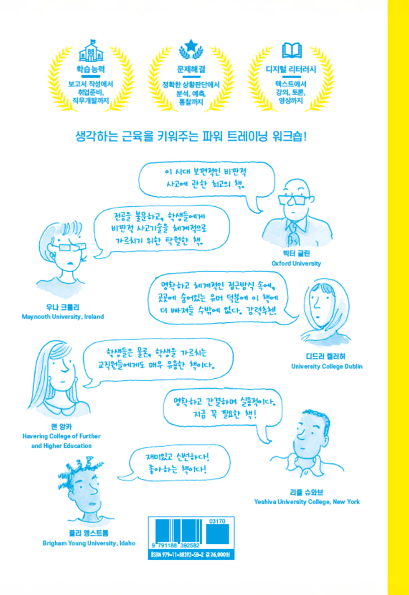 - 빅터 글린 Victor Glynn, 옥스퍼드대학 Oxford University 《Education Bookseller》 2011 전공을 불문하고, 학생들에게 비판적 사고기술을 체계적으로 가르치기 위한 매우 탁월한 책. - 우나 크롤리 Una Crowley, 메이누스대학 Maynooth U., Ireland 《All Ireland Journal of Higher Education》 2015 명확하고 체계적인 접근방식 속에, 곳곳에 숨어있는 유머 덕분에 이 책에 더 빠져들 수밖에 없다. 강력추천! - 디드러 켈러허 Deidre Kelleher, 유니버시티칼리지 더블린 University College Dublin, Ireland 명확하고 간결하며 실용적이다. 지금 꼭 필요한 책! - 리즐 슈와브 Liesl Schwabe, 예시바대학 Yeshiva University College, New York 학생들은 물론, 학생을 가르치는 교직원들에게도 매우 유용한 책이다. 특히 이 책에 수록된 다양한 액티비티들은 이제 막 강의를 시작한 초보강사들에게 강의를 더욱 흥미진진하게 만들어주는 가이드 역할을 한다. - 앤 앙카 Ann Anka, 하버링고등교육대학 Havering College of Further and Higher Education , London 재미있고 신선하다! 내가 좋아하는 책! - 쥴리 엥스트롬 Julie Engstrom, 브리검영대학 Brigham Young University-Idaho |
