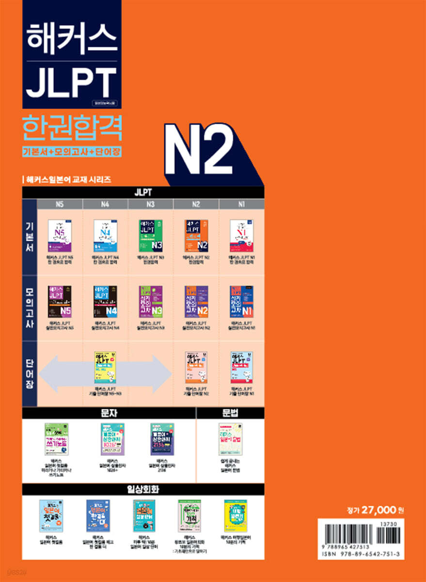 A부터 Z까지 알려주는 JLPT 소개 JLPT N2 합격을 위한 학습 플랜 언어지식 문자/어휘 문제 1 한자읽기 문제 2 표기 문제 3 단어형성 문제 4 문맥규정 문제 5 유의표현 문제 6 용법 언어지식 문법 N2 빈출 문법 01 명사 뒤에 접속하는 문형 02 동사 뒤에 접속하는 문형 03 명사와 동사 모두에 접속하는 문형 04 여러 품사 뒤에 접속하는 문형 05 조사 06 부사 07 접속사 08 수동/사역/사역 수동 표현 09 경어 표현 10 수수 표현 11 추측/전언 표현 문제 7 문법형식 판단 문제 8 문장만들기 문제 9 글의 문법 독해 문제 10 내용이해(단문) 문제 11 내용이해(중문) 문제 12 통합이해 문제 13 주장이해(장문) 문제 14 정보검색 청해 문제 1 과제이해 문제 2 포인트이해 문제 3 개요이해 문제 4 즉시응답 문제 5 통합이해 실전모의고사 실전모의고사 1 실전모의고사 2 실전모의고사 3 해설집 [책 속의 책] 시험 D-20 빈출 단어/문형 암기장 [별책] |