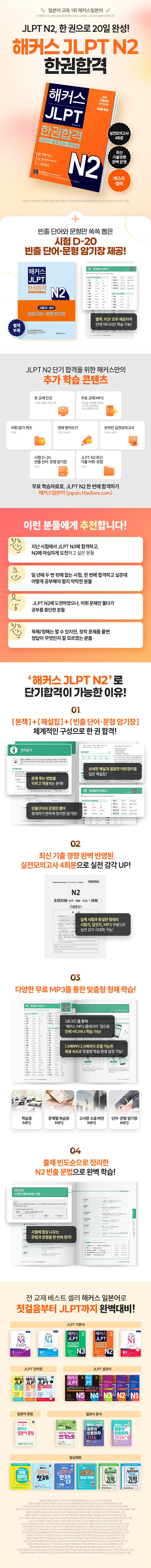 한경비즈니스 선정 2020 한국브랜드선호도 교육(온·오프라인 일본어) 부문 1위 최신 기출경향(2025년 시험) 완벽 반영! JLPT N2, 한 권으로 20일 완성! [이런 분들에게 추천합니다] 1. 지난 시험에서 JLPT N3에 합격하고, N2에 야심차게 도전하고 싶은 분들 2. 일 년에 두 번 밖에 없는 시험, 한 번에 합격하고 싶은데 어떻게 공부해야 할지 막막한 분들 3. JLPT N2에 도전하였으나, 어휘 문제만 풀다가 공부를 중단한 분들 4. 독해/청해는 할 수 있지만, 정작 문제를 풀면 정답이 무엇인지 잘 모르겠는 분들 [해커스 교재만의 특장점] 1. [본책]+[해설집]+[시험 D-20 빈출 단어·문형 암기장] 3가지 구성으로 한 권 합격! 문제 푸는 방법을 익히고 적용하는 ‘본책’, 상세한 해설과 정확한 해석, 꼼꼼한 어휘정리를 담은 ‘해설집’, JLPT N2 시험에 자주 출제되는 빈출 단어와 문형만 쏙쏙 뽑아 휴대하기 편하게 정리한 ‘시험 D-20 빈출 단어·문형 암기장’을 구성하여, 한 권만으로 학습을 완성할 수 있습니다. 2. [실전모의고사 4회분]을 통해 합격을 위한 실전 감각 향상! 실제 시험과 동일한 형태의 시험지, 답안지, MP3로 구성되어 있어 시험장에서 긴장하지 않고 시험에 응할 수 있습니다. 3. 학습용, 복습용 [교재 MP3] 무료 제공! 1) [학습용 MP3] 문자어휘·청해 과목과 ‘실전모의고사’를 학습할 수 있습니다. 2) [문제별 복습용 MP3] 잘 듣지 못한 청해 문제를 무한 반복하며 학습할 수 있습니다. 3) [고사장 소음 버전 MP3] 실제 시험장 환경에 미리 적응할 수 있습니다. 4) [단어·문형 암기장 MP3] 매일 지하철이나 버스에서 틈틈이 학습하며 실력을 향상시킬 수 있습니다. 4. 해커스 음원 서비스들을 통해 맞춤형 청해 학습! 교재의 QR코드를 스캔하거나 ‘해커스 MP3 플레이어’ 앱을 설치하여, 언제 어디서나 모바일 음원 스트리밍을 통한 학습을 할 수 있습니다. 또한, 1.0배부터 2.0배까지 조절 가능한 재생 속도로 나만의 맞춤형 학습 환경을 만들 수 있습니다. 5. 출제 빈도순으로 정리한 [N2 빈출 문법]으로 N2 문법 완벽 학습! ‘N2 빈출 문법’을 통해 시험에 항상 나오는 빈출 문법과 문형을 한 번에 정리할 수 있습니다. [JLPT N2 단기 합격을 위한 해커스만의 추가 학습 콘텐츠 - 해커스일본어(japan.Hackers.com)] 1. 본 교재 인강(교재 내 할인쿠폰 수록) 2. 무료 교재 MP3 ① 학습용 MP3 - 문자 어휘 핵심 표현 및 필수 어휘 학습용/청해 문제 풀이 학습용/실전모의고사용 ② 문제별 복습용 MP3 - 청해 복습용/실전모의고사 복습용 ③ 고사장 소음 버전 MP3 - 실전모의고사 시험장 적응용 ④ 단어/문형 암기장 MP3 - 별책부록 학습용 3. 어휘 암기 퀴즈(PDF) 4. 청해 받아쓰기(PDF+MP3) 5. 온라인 실전모의고사(PDF+MP3) 6. 시험 D-20 빈출 단어·문형 암기장(PDF) 7. JLPT N2 최신 기출 어휘·문형(PDF) 수록 1. [중철북] 시험 D-20 빈출 단어·문형 암기장 2. [책속책] 해설집 |