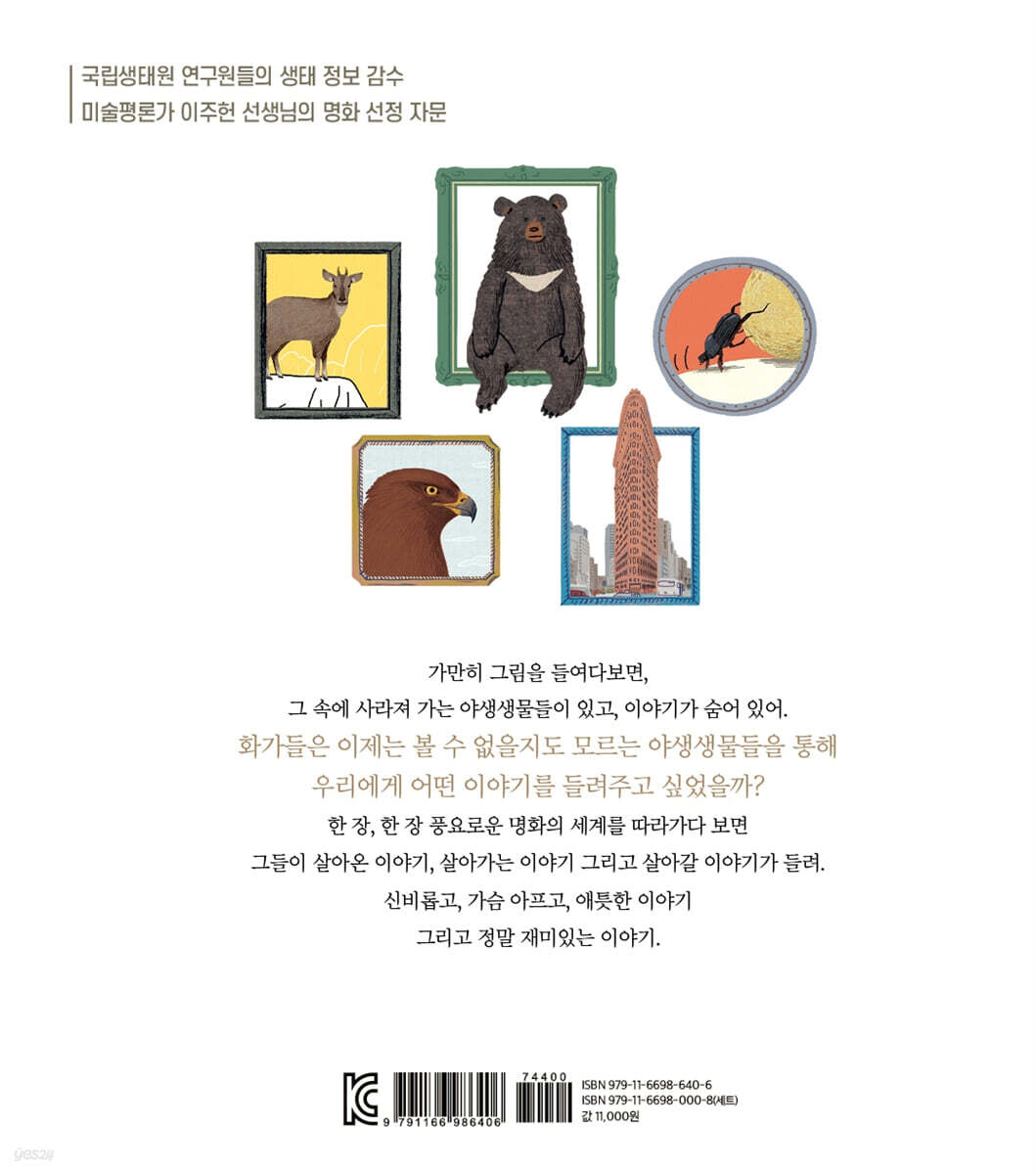 원숭이야, 괜찮아? 〈그랑자트섬의 일요일 오후〉, 조르주 쇠라 / 8 호랑이는 세상에서 가장 아름다운 동물이야 〈호랑이와 물소의 싸움〉, 앙리 루소 / 18 수사자 세실의 죽음 〈잠자는 집시〉, 앙리 루소 / 28 표범이 다 어디로 갔을까? 〈두마리의 표범〉, 윌리엄 허긴스 / 34 나는 삵이야, 고양이가 아니라고! 〈텍사스 삵, 오실롯〉, 존 우드하우스 오듀본 / 44 옛날에는 우리나라에도 여우가 많이 살았어 〈왜가리를 방문한 여우〉, 프란스 스나이더스 / 52 곰의 쓸개즙을 뽑지 말아 주세요! 〈곰〉, 바실리 칸딘스키 / 60 산양을 본 적 있어? 〈샤무아가 있는 고산 풍경〉, 아놀드 뵈클린 / 70 수달은 강물 생태계의 핵심종이야 〈물고기를 잡은 수달〉, 헨리 레오니다스 롤프/ 78 양비둘기를 알아? 〈성 엘리자베스, 성 요한, 비둘기와 함께 있는 성가족〉, 페테르 파울 루벤스 / 86 검독수리는 독수리가 아니야! 〈유피테르에게 간청하는 큐피드〉, 페테르 파울 루벤스 / 94 저어새가 돌아왔어! 〈시편의 필사본 삽화〉 / 102 검은머리갈매기 구출 작전 〈갈매기〉, 모세 스투펜달 / 112 금개구리를 도와줘! 〈두 마리의 아기 고양이와 개구리〉, 존 헨리 돌프 / 122 소똥구리야, 돌아와! 〈멘드라미와 쇠똥벌레(초충도_부분)〉, 신사임당 / 130 민물고기는 구불구불 강이 필요해! 〈어해도(부분)〉 / 138 바나나의 조상을 찾아라! 〈이아 오라나 마리아〉, 폴 고갱 / 146 나도풍란이 다시 살 수 있을까? 〈목란도축〉, 민영익 / 154 멸종의 생물학 〈플랫아이론 빌딩〉, 콜린 캠벨 쿠퍼 / 162 시간이 별로 없어! 〈강산무진도(부분)〉, 이인문 / 170 찾아보기 / 178 참고 도서 / 180 |