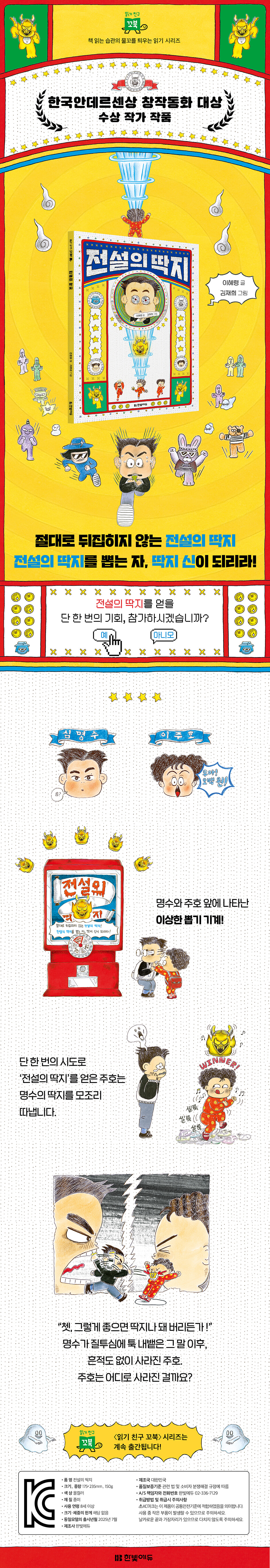 절대로 뒤집히지 않는 전설의 딱지,전설의 딱지를 뽑는 자, 딱지 신이 되리라!딱지치기는 예나 지금이나 변함없이 아이들에게 인기 있는 놀이입니다. 지금은 다양한 캐릭터 모양을 본뜬 알록달록 고무 딱지로 모습이 바뀌었지만 여전히 아이들은 딱지치기에 열광합니다. 힘껏 내리쳐서 딱지를 뒤집으면 승리하는 동시에 상대방의 딱지를 차지하는 단순한 놀이 규칙은 가진 딱지가 다 없어질 때까지 대결을 멈추지 못하게 만들지요. 《전설의 딱지》 속 주인공인 명수도 평소 ‘딱지의 신’으로 불릴 만큼 딱지치기에 진심입니다. 단짝 주호와 함께 길을 가다 주운 오백 원으로 당장 딱지를 사야 한다고 주장할 만큼이요. 그런 명수의 눈앞에 ‘전설의 딱지’를 뽑을 수 있다는 딱지 기계가 나타난 것입니다. 하지만 먼저 달려가서 오백 원을 주운 사람은 주호였기에 전설의 딱지는 결국 주호 손에 들어갑니다.딱지의 신 명수 vs 전설의 딱지를 가진 주호두 친구가 펼치는 불꽃 튀는 대결의 결말은?수업 시간에도 명수의 머릿속에는 ‘전설의 딱지’를 따고 싶다는 생각뿐입니다. 그래서 쉬는 시간이 되자 마자 주호에게 딱지 대결을 신청하지요. 평소 실력대로라면 주호는 명수와 상대가 되지 않습니다. 그런데 어찌 된 일인지 주호가 명수의 딱지를 모조리 따냅니다. 정말로 주호가 전설의 딱지를 가졌기 때문일까요? 명수는 비뚤어진 마음에 지우개로 주호가 숙제해 둔 페이지를 몽땅 지워 버리고, 우유 팩이 들어 있는 가방을 주호가 의자에 앉기 직전에 올리는 못된 장난을 연달아 칩니다. 그것도 모자라 명수는 마지막 승부수를 던집니다. 형에게 물려받아 아끼고 아끼던 ‘절대 딱지’로 ‘전설의 딱지’와 승부를 가려 보자는 것이었지요. 하지만 결과는 전설의 딱지를 가진 주호의 압승. 명수는 질투심에 못 이긴 나머지 주호에게 이렇게 내뱉습니다. “쳇, 그렇게 좋으면 딱지나 돼 버리든가!” 그런데 그날 이후, 주호가 학교에 오지 않습니다. 선생님도, 친구들도, 아무도 기억하지 못하는 주호. 주호는 어디로 사라진 걸까요?딱지 괴물을 물리칠 힘은 친구를 소중하게 생각하는 마음으로부터아이들은 신나게 놀이를 하다가도 종종 다툼을 벌이곤 합니다. 다툼이 생기면 친구끼리 서운한 마음도 생기고, 단짝을 딱지처럼 납작하게 만들어 버리고 싶은 순간도 생길 수 있습니다. 이 책의 저자 이혜령 작가는 그런 아이들의 순간적인 마음을 포착해 한 편의 흥미진진한 이야기로 만들어 냈습니다. 명수와 주호가 서로에게 툭툭 내뱉는 말과 행동에는 평범한 초등학생 아이들의 일상이 꾸밈 없이 드러납니다. 서로 ‘전설의 딱지’를 차지하고 싶어서 나란히 딱지를 붙잡고 등교하는 모습이나 함께 지각한 벌로 봉사 활동하는 단골 ‘봉벤저스’ 신세라고 한탄하는 장면에서는 쿡쿡 웃음이 납니다. 가볍게 시작한 둘의 ‘딱지 대결’이 ‘딱지 전쟁’으로 치닫는 장면에서는 안타까운 마음이 들기도 하고요. 그럼에도 괴물을 물리쳐야 하는 최후의 한판 승부에서 용기 내는 명호를 보며 마음이 뭉클해지기도 합니다. 책 읽는 습관의 물꼬를 틔우는 읽기 시리즈 〈읽기 친구 꼬북〉이 출발합니다 《전설의 딱지》는 아이들의 교실을 배경으로 하는 판타지의 재미, 마지막 페이지까지 긴장의 끈을 놓을 수 없는 장면들의 연속, 그 속에서 독자의 마음을 말랑말랑하게 하는 우정의 힘까지 골고루 담아낸 작품입니다. 아직 읽기 독립에 도달하기에는 이른 초등 저학년이 책 읽는 재미를 알게 하는 데 더없이 적절한 책으로 추천할 만합니다. 한빛에듀에서 출간하는 〈읽기 친구 꼬북〉은 책 읽는 습관의 물꼬를 틔우는 읽기 시리즈입니다. 한 손에 쉽게 잡히면서 글과 그림이 시원하게 앉힐 수 있는 판형을 선택하고, 긴 시간을 들이지 않고도 완독이 가능하도록 100쪽 내외의 분량으로 구성하였습니다. 앞으로도 초등학생이 스스로 골라서 읽고 싶은, 책 읽는 재미를 깨닫고 읽는 습관을 들이는 데 도움이 될 수 있는 책을 꾸준히 내놓을 예정입니다.