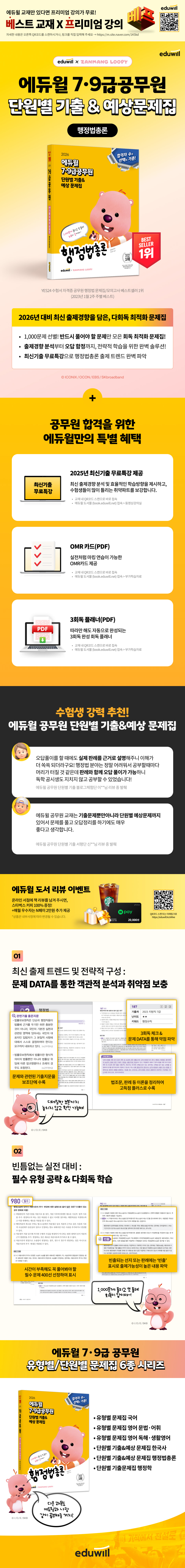 1) 회독에 최적화된 구성 - 관련기출 옳은지문을 통해 한번에 다회독 효과 - 효율적인 문제 회독을 위해 문제 바로 아래 해설 배치 - 시간이 부족한 수험생도 전략적으로 회독할 수 있도록 필수 문제 400선 선정 2) 오답 선지까지 완벽하게 분석한 정답과 해설 - 모든 문제의 문항별 난이도를 통해 객관적인 실력 체크 - 빈출 & 지엽 & 신규 표시로 반복 출제되거나 향후 출제가능성이 높은 내용을 빠르게 알 수 있도록 구성 |