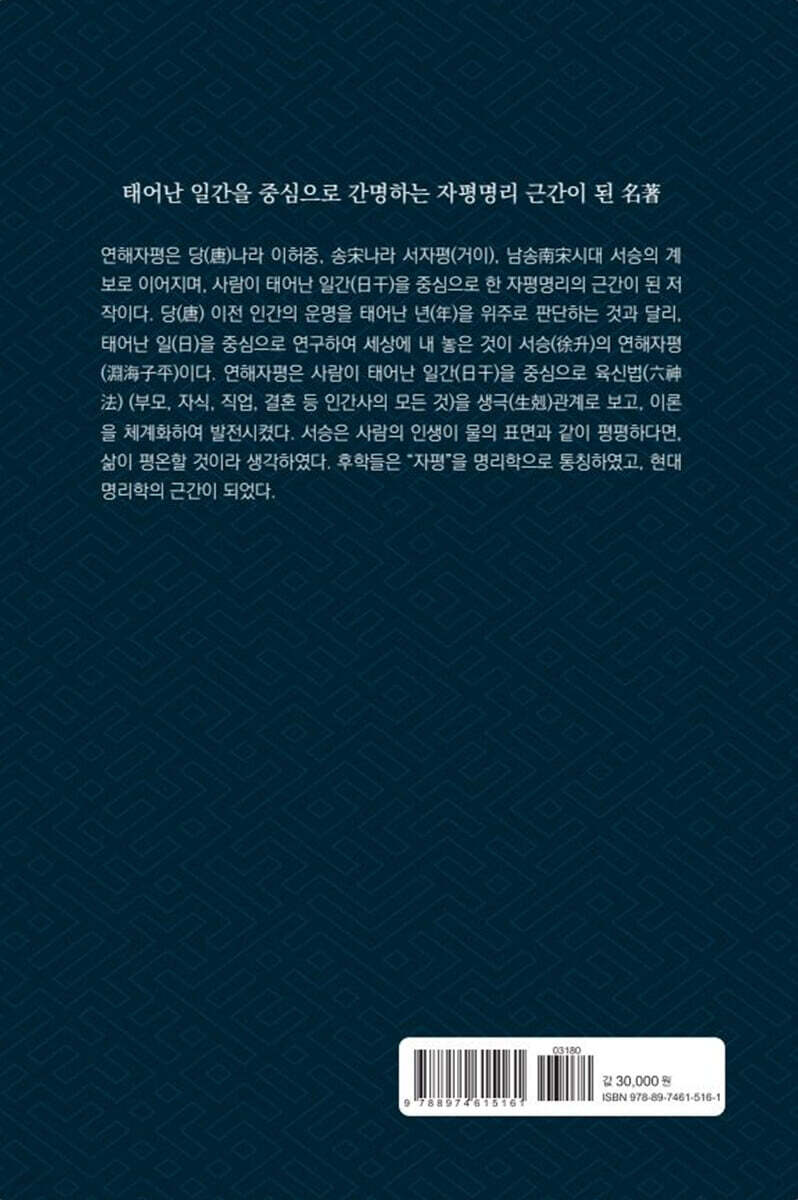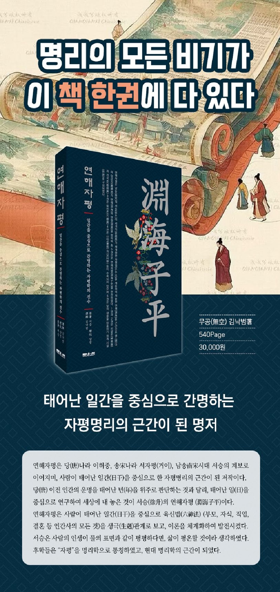 合倂評註淵海子平引 합병평주연해자평인 第一篇 기초개론基礎槪論 1. 論五行所生之始 논오행소생지시 2. 論天干地支所出 논천간지지소출 3. 天干相合 천간상합 4. 十干所屬方位十二支所屬論 십간소속방위십이지소속론 5. 論十二支陰陽所屬刑沖會合 논십이지음양소속형충회합 1) 論十二支陰陽所屬 논십이지음양소속 2) 論十二支六合 논십이지 육합 3) 論十二支三合 논십이지삼합 4) 論十二支相沖 논십이지상충 5) 論十二支相穿 논십이지상천 6) 論十二支相刑 논십이지상형 6. 論干支字義 논간지자의 7. 論十二支生肖 논십이지생초 8. 論六十花甲子納音 논육십화갑자납음 9. 論天干生旺死絶 논천간생왕사절 10. 五行發用定例 오행발용정례 1) 陰陽順逆生旺死絶 음양순역생왕사절 2) 月律分野之圖 월률분야지도 3)天干五陰陽通變 천간오음양통변 11. 論起法例 논기법례 1) 論年上起月例 논년상기월례(월두법) 2) 論日上起時例 논일상기월례(시두법) 3) 論起胎起息起變起通法 논기태기식기변기통법 5) 論起變法 논기변법 6) 論起通法 논기통법 12. 論起大運法 논기대운법 13. 論行小運法 논행소운법 14. 論五行相生相剋 논오행상생상극 15. 論節侯歌 논절후가 16. 論天地干支暗藏總訣 논천지간지암장총결 1) 지장간 총정리 2) 論節氣歌 논절기가 3) 地支藏遁歌 지지장둔가 17. 四季節사계절 절기 1) 論四季大節訣논사계대절결 2) 論未來月朔節氣奧歌논미래월삭절오가 3) 論截流年節氣日時刻數要訣 논절류년절기일시각수요결 18. 論日爲主 논일위주 19. 論月令 논월령 20. 論生旺 논생왕 21. 論五行生旺衰絶吉凶 논오행생왕쇠절길흉 22. 論五行墓庫財印 논오행묘고재인 23. 論官殺混雜要制伏 논관살혼잡요제복 24. 論五行生剋制化各有所喜所害例 논오행생극제화각유소희소해례 25. 二至陰陽相生理 이지음양상생리 26. 神殺論 신살론 1) 길신 (1) 論起玉堂天乙貴人 논기옥당천을귀인 (2) 論起天官貴人 논기천관귀인 (3) 論太極貴人 논태극귀인 (4) 論三奇貴人 논삼기귀인 (5) 論月德貴人 논월덕귀인 (6) 論月德合 논월덕합 (7) 論天德貴人 논천덕귀인 (8) 論天廚貴人 논천주귀인 (9) 論福星貴人 논복성귀인 (10) 論三元 논삼원 (11) 論十干祿 논십간록 (12) 論驛馬 논역마 (13) 論天赦 논천사 (14) 論華蓋 논화개 (15) 論十干學堂 논십간학당 (16) 論十干食祿 논십간식록 (17) 論金輿祿 논금여록 (18) 論拱祿 논공록 (19) 論交祿 논교록 (20) 論暗祿 논암록 (21) 夾祿 논협록 (22) 垣城 논원성 (23) 論帝座 논제좌 2) 악살 (1) 論六甲空亡 논육갑공망 (2) 論截路空亡 논절로공망 (3) 論四大空亡 논사대공망 (4) 論十惡大敗日 논십악대패일 (5) 論四廢日 논사폐일 (6) 論天地轉殺 논천지전살 (7) 論天羅地網 논천라지망 (8) 論羊刃 논양인 第二篇 격국론格局論 1. 격국 용어 해설 1) 論正官 논정관 2) 論偏官 논편관 3) 論七殺 논칠살 4) 論印綬 논인수 5) 論正財 논정재 6) 論偏財 논편재 7) 論食神 논식신 8) 論倒食 논도식 9) 論傷官 논상관 10) 論劫財 논겁재 11) 論羊刃 논양인 12) 論刑合 논형합 13) 論福德秀氣 논복덕수기 14) 論雜氣 논잡기 15) 論日貴 논일귀 16) 論日德 논일덕 17) 論日刃 논일인 18) 論魁? 논괴강 19) 論金神 논금신 20) 論時墓 논시묘 2. 內十八格 내십팔격 1) 正官格 정관격 2) 雜氣財官格 잡기재관격 3) 月上偏官格 월상편관격4) 時上偏財格 시상편재격 5) 時上一位貴格 시상일위귀격 6) 飛天祿馬格 비천록마격7) 倒?格 도충격 8) 乙巳鼠貴格 을사서귀격 9) 六乙鼠貴格 육을서귀격 10) 合祿格 합록격 11) 子遙巳格 자요사격 12) 丑遙巳格 축요사격 13) 壬騎龍背格 임기용배격 14) 井欄叉格 정란차격 15) 歸祿格 귀록격 16) 六陰朝陽格 육음조양격 17) 刑合格 형합격 18) 拱祿格 공록격 19) 拱貴格 공귀격 20) 印綬格 인수격 3. 外十八格 외십팔격 1) 六壬趨艮格 육임추간격 2) 六甲趨乾格 육갑추건격 3) 勾陳得位格 구진득위격 4) 玄武當權格 현무당권격 5) 炎上格 염상격 6) 潤下格 윤하격 7) 從革格 종혁격 8) 稼穡格 가색격 9) 曲直格 곡직격 10) 日德秀氣格 일덕수기격 11) 福德格 복덕격 12) 棄命從財格 기명종재격 13) 傷官生財格 상관생재격 14) 棄命從殺格 기명종살격 15) 傷官帶殺格 상관대살격 16) 歲德扶殺格 세덕부살격 17) 歲德扶財格 세덕부재격 18) 夾丘格 협구격 19) 兩干不雜格 양간부잡격 20) 五行俱足格 오행구족격 21) 干支一氣格 간지일기격 第三篇 육친론六親論 1. 六親論 육친론 1) 六親總論 육친총론 2) 六親捷要歌 육친첩요가 3) 論父 논부 4) 論母 논모 5) 論妻妾 논처첩 6) 論兄弟?妹 논형제자매 7) 論子息 논자식 2. 婦人小兒論 부인소아론 1) 論婦人總訣 논부인총결 2) 陰命賦 음명부 3) 女命富貴貧賤篇 여명부귀빈천편 4) 女命貴賤格 여명귀천격 5) 滾浪桃花 곤랑도화 6) 女命總斷歌 여명총단가 7) 論小兒 논소아 8) 論小兒關殺例 논소아관살예 3. 性情疾病論 성정질병론 1) 論性情 논성정, 2) 論疾病 논질병 第四篇 통변론通辯論 1. 看命入式 간명입식 2. 子平擧要歌 자평거요가 3. 詳解定眞論 상해정진론 4. 喜忌篇 희기편 5. 繼善篇 계선편 6. 大歲運論 대세운론 1) 論大運 논대운 2) 論太歲吉凶 논태세길흉 3) 論征太歲 논정태세 7. 論運化氣 논운화기 8. 化氣十段錦 화기십단금 9. 神趣八法 