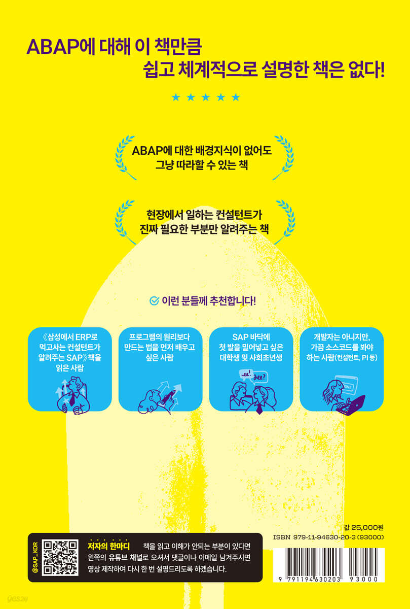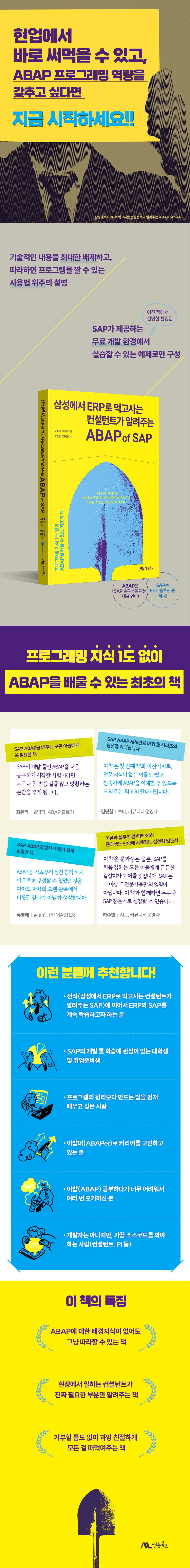 이 책은 첫 번째 책과 마찬가지로, 전문 지식이 없는 이들도 쉽고 친숙하게 ABAP을 이해할 수 있도록 도와주는 최고의 안내서입니다. 시스템 접속부터 실전 프로그래밍에 이르기까지 단계별로 접근하며, 실무에 직접 도움이 되는 설명과 팁들을 폭넓게 담고 있어 SAP ABAP을 처음 접하는 사람들에게 든든한 동반자가 되어줄 것입니다. - 김민철 (보나, 커뮤니티 운영자)