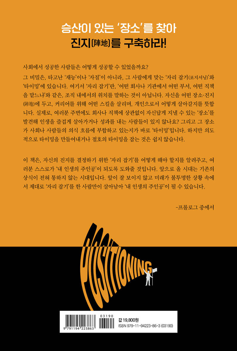 ‘자리 잡기’에 있다 이 책은, 자신의 진지를 결정하기 위한 ‘자리 잡기’를 어떻게 해야 할지를 알려주고, 독자 스스로가 ‘내 인생의 주인공’이 되도록 도와줄 것이다. 먼저, CHAPTER 1에서는 지금 우리가 살아가고 있는 사회의 문제점을 밝혀낸다. 우리가 자신의 인생의 주인공으로 살아가는 데 이 사회의 구조가 어떻게 방해하고 있는지를 알아본다. 이 구조에서 벗어나지 못하면 우리는 스스로 자기 인생의 오너가 될 수 없다. CHAPTER 2는 ‘자리 잡기’ 기본 편이다. 승산이 있는 장소를 찾아, 자신만의 진지를 구축하는 방법을 소개한다. 자신에게 에너지가 흘러들어올 수 있는 장소를 찾고, 스킬과 커리어를 조합해서 그 진지를 견고하게 다진다. CHAPTER 3에서 ‘자리 잡기’ 응용 편으로, 저자가 실제로 실행했던 것들을 구체적인 사례와 함께 소개한다. CHAPTER 4에서는 자신의 ‘그릇’을 키우는 방법에 대해 다룬다. 인간의 그릇은 다이아몬드와 같은 모양을 하고 있으며, 인생의 전반부에는 바닥 면적을 넓히고, 후반부에는 높이와 깊이를 만들어간다. CHAPTER 5는 지금까지 제 책에서 다루지 않았던 ‘운을 아군으로 만드는 방법’에 대해 이야기한다. 앞으로 다가올 AI 로봇 사회는 시스템이 인간의 삶의 방식을 기계적으로 결정하는 세상이다. 그렇기에 우연한 만남과 같은 ‘인간에게만 일어나는 일’이 오히려 큰 효과를 발휘할 수 있다. 이것을 기르는 방법을 저자의 경험을 통해 이야기한다. CHAPTER 6에서는 50세부터의 삶의 방식을 제안한다. 이 시기에 무엇을 익히고 어떤 능력을 갈고닦는지에 따라 60세 혹은 65세 이후의 인생이 달라진다. 늦어도 55세까지는 모드를 전환하지 않으면 위험하다. CHAPTER 7에서는 60세 이후의 경제적 상황에 관해서 이야기하며 이것에 대한 구체적인 대책을 설명한다. 앞으로 올 시대는 기존의 상식이 전혀 통하지 않는 시대다. 앞이 잘 보이지 않고 미래가 불투명한 상황 속에서 제대로 ‘자리 잡기’를 한 사람만이 살아남아 ‘내 인생의 주인공’이 될 수 있다. 이 책을 통해 불투명한 미래를 제대로 준비해보자. - 감수자의 말 이 책은 단순한 인생론을 담은 책이 아닙니다. 자기답게 살아가기 위한 현실적 전략서이며, 지금 당신이 서 있는 ‘자리’를 어떻게 인식하고, 앞으로 어디에 깃발을 꽂을 것인지에 대한 본질적 물음을 던집니다. 이 책은, 내 자리와 방향을 찾지 못한 사람에게는 나침반이 되고, 직장에만 의지해온 사람에게는 긴장감을 주며, 인생 후반을 새롭게 설계하고 싶은 사람에게는 구체적인 방법을 줍니다. 지금 당신이 어디에 있든 어떤 나이에 있든, 당신만의 자리를 새로 설정할 수 있습니다. 인생을 정답이 아니라 납득해(納得解)로 살아가는 방법. 그 정제된 메시지가 이 책 안에 응축되어 있습니다. 서승범 |