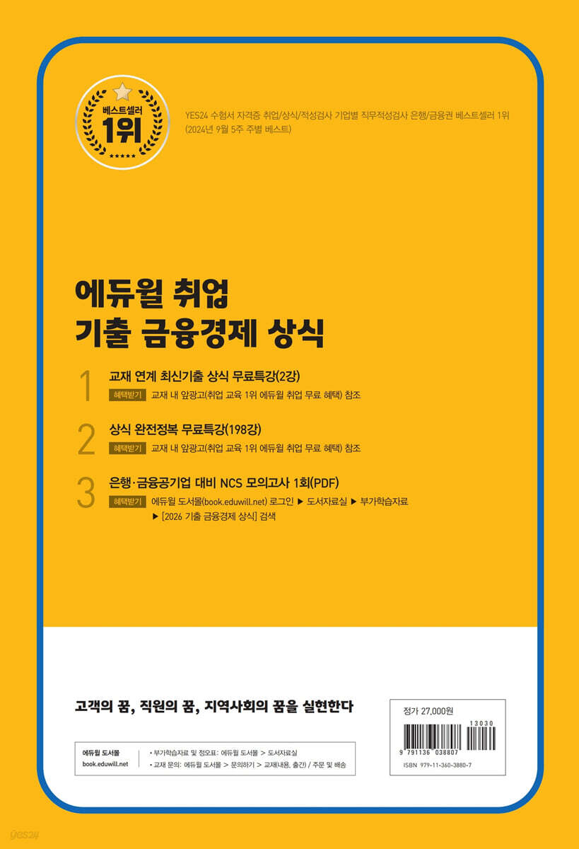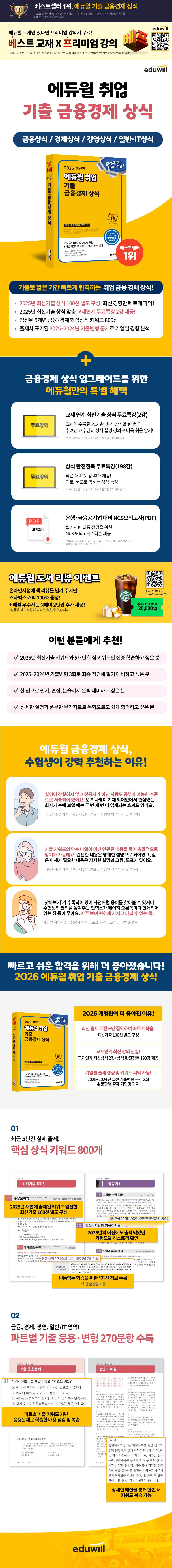 - 키워드 별 상세설명과 간결한 한 줄 설명으로 학습 방향, 기간에 맞는 전략적 학습이 가능하다. - 혼자서도 독학 가능하도록 교재연계 2025년 기출 상식 무료특강 2강을 제공한다. - 2025년 출제 키워드를 포함한 총 270문항의 응용문항 + 2025년~2024년 기출변형 모의고사 3회분을 수록하여 학습내용을 충분히 점검, 입사 희망기업의 완벽한 대비를 할 수 있다! [구매자 특별혜택] (구매혜택1) 교재 연계 최신기출 상식 무료특강(2강) : 교재 내 앞 광고(취업 교육 1위 에듀윌 취업 무료 혜택) 참조 (구매혜택2) 상식 완전정복 무료특강(198강) : 교재 내 앞 광고(취업 교육 1위 에듀윌 취업 무료 혜택) 참조 (구매혜택3) 은행·금융공기업 대비 NCS 모의고사 1회(PDF) : 에듀윌 도서몰(book.eduwill.net) 로그인 〉 도서자료실 〉 부가학습자료 〉 [2026 기출 금융경제 상식] 검색 |