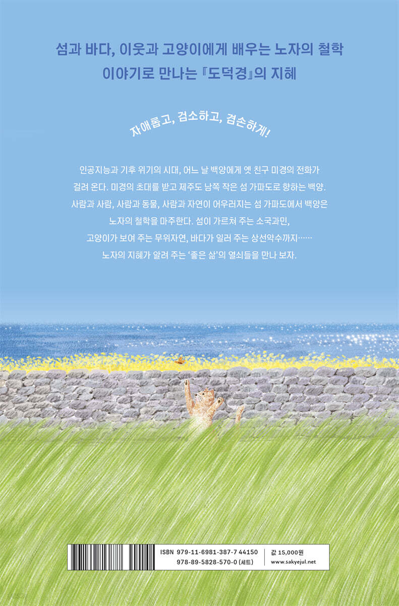 노자의 철학을 소설로 만난다! 2028년, 인공지능과 디지털 교육이 보편화되고 종이책의 자리가 사라지며 도서관장 백양은 이제 자신의 시간이 끝났음을 직감한다. 은퇴 후 책에만 파묻혀 지내던 어느 날, 백양에게 옛 친구 미경의 전화가 걸려 온다. 백양은 미경의 초대를 받아 제주도 남쪽 작은 섬 가파도로 뜻밖의 여행을 떠난다. 그렇게 도착한 제주도 남쪽의 작은 섬 가파도. 사람과 사람, 사람과 동물, 사람과 자연이 어우러지는 그곳에서 백양은 고양이를 돌보고, 자동차를 타는 대신 걷거나 자전거를 타며 삶의 속도를 늦추고, 친구를 떠나보내고, 쓰레기를 줍고, 매표소에서 일하고, 작은 도서관을 차리고, 『도덕경』을 읽고 이야기하며 노자의 철학을 삶 속에 담아낸다. 섬이 가르쳐주는 소국과민, 고양이가 보여주는 무위자연, 바다가 일러주는 상선약수까지…… 서쪽이 아닌 남쪽으로 간 노자가 발견한 삶의 지혜를 만나 보자. 시공간을 뛰어넘어 ‘지금, 여기’와 호흡하는 『도덕경』 노자는 주나라가 쇠퇴하면서 여러 제후국이 중원의 패권을 차지하기 위해 다투던 춘추 전국 시대(기원전 770~기원전 221)에 살았던 철학자로, 도가(道家) 사상의 시조이다. 전쟁이 끊이지 않고, 사람들의 삶은 피폐해져만 가던 난세 속에 인간과 사회의 새로운 길을 모색한 사상가들이 등장했으니, 이들이 바로 공자, 맹자, 묵자, 한비자, 장자 등을 아우르는 제자백가다. 그중에서도 노자는 평화로운 삶과 사회에 이르기 위해서는 인위적인 노력이 아니라, 만물의 질서인 ‘도(道)’를 따르는 ‘덕(德)’을 실천해야 한다고 역설했다. 이런 노자의 사상이 집약된 말이 바로 ‘무위자연(無爲自然)’이었다. 주나라가 쇠퇴하자, 노자는 마침내 은둔하기로 결심하고 서쪽으로 떠났고, 이후 자취를 감췄다고 전해진다. 세상을 향해 나서지 않고 은둔했던 탓에 오랫동안 노자의 철학은 소극적이고 현실 도피적인 것으로 여겨졌다. 그러나 노자는 누구보다도 평화로운 세상을 꿈꾸며, 자연의 근본 원리를 현실에 적용할 방법을 치열하게 고민한 선구적인 사상가였다. 그의 유일한 저서이자 불과 5천 자 남짓한 짧은 글인 『도덕경』이 2500년이 넘는 세월을 뛰어넘어 끊임없이 사랑받고, 동서의 장벽을 넘어 서양에서 가장 많이 읽히는 동양 고전으로 자리 잡은 것은 바로 그 때문일 것이다. 나아가 기후 위기와 전쟁이 뭇 생명을 위협하고, 부와 지위를 향한 욕망과 경쟁이 극에 달한 오늘날은, 노자가 살았던 혼돈의 시기와 많은 부분 닮아 있다. 기원전 6세기경 노자가 제시한 삶과 우주에 대한 통찰이 지금 이곳의 우리에게 변함없이 깊은 울림을 주는 까닭이다. 이 책은 제주도와 마라도 사이에 있는 가파도로 향한 백양이 섬에서 이웃, 자연, 고양이와 관계 맺으며 노자의 철학을 마주하고, 노자의 사상을 삶으로 실천해 내는 모습을 그린다. 그런 점에서 백양은 오늘날 우리 곁에 살아 돌아온 노자와 다름 아니다. 소국과민小國寡民 * 가파도에서 만난 노자의 이상향 “나라를 작게 하고 인구를 적게 하십시오. 아무리 좋은 무기가 있더라도 쓰지 마십시오.” -『도덕경』 80장 중에서 미경의 초대를 받고 가파도로 향한 백양은 낮은 돌담과 작은 집들, 푸른 청보리밭이 펼쳐지는 풍경을 바라보며 노자의 이상향을 떠올린다. 나라는 작고 사람은 적은 소국과민의 땅. 사람을 죽이는 무기도 없고 이사 가는 사람도 거의 없는 곳. 간결하게 말하고, 소박하게 살아가는 곳. 풍속이 즐거워 이웃 나라를 탐하지 않는 곳. 자신이 태어난 곳에서 안전하고 편안하게 살다가 죽을 수 있는 곳. 노자는 이런 나라라면 사람들이 몸과 마음을 다치지 않고, 평화롭게 살아갈 수 있다고 생각했다. 그래서 노자에게 ‘부국강병’은 평화의 반대편에 있는 말이었다. 그리고 노자는 한 사람, 한 사람의 삶도 마찬가지라고 말했다. 노자는 ‘채움’이 아니라 ‘비움’을, ‘높임’이 아니라 ‘낮춤’을 이야기했다. 노자는 집 안을 금은보화로 가득 채우면 행복이 가득 차는 게 아니라, 금은보화를 지키려고 불안이 가득 찬다고 생각했다. 나아가, 권력을 탐하고 부귀영화를 누리려는 사람들에 의해 사회가 어지러워지고 나라가 쇠퇴한다고 보았다. 그래서 노자는 자신의 보배로 ‘자애로움’과 ‘검소함’과 ‘나서지 않음’(겸손)을 꼽았다. 백양은 가파도의 평화로운 일상 속에서 느린 속도로, 천천히 살아가며 노자가 말한 소국과민의 이상향을 생각한다. 그리고 더 많은 부와 높은 지위를 차지하기 위해 바쁘고 치열하게 경쟁하는 현대인의 삶을 성찰한다. 무위자연無爲自然 * 살아 있는 노자, 고양이의 말 없는 가르침 “세상의 지극한 부드러움이 세상의 지극한 단단함을 이기는 법. 자신을 없애야 틈 없는 곳도 들어갈 수 있습니다. 그래서 나는 함 없음의 유익함을 압니다.” -『도덕경』 43장 중에서 친구들이 가파도를 떠나면서, 백양은 홀로 지내게 된다. 아니, 사실 뜻밖의 식구들이 생긴다. 바로 미경이 돌보던 고양이들의 집사가 된 것. 난생처음 고양이들을 돌보면서 백양은 의문을 갖는다. 개를 키우는 사람은 ‘주인’인데, 왜 고양이를 키우는 사람은 