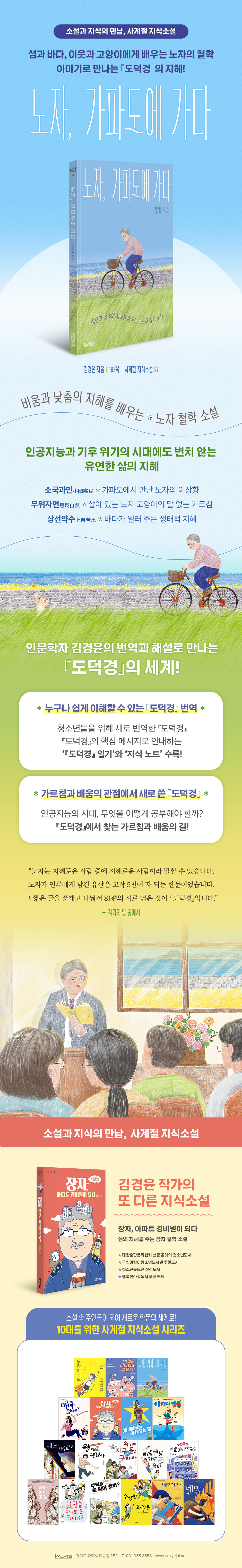 1장 가파도로 가다 『도덕경』 일기 1 소국과민(小國寡民), 작은 나라 적은 인구 2장 고양이의 가르침 『도덕경』 일기 2 불언지교 무위지익(不言之敎 無爲之益), 말 없는 가르침과 함 없음의 유익함 3장 천천히 살다 『도덕경』 일기 3 천리지행 시어족하(千里之行 始於足下), 천 리 길도 한 걸음부터 4장 무지개다리를 건너다 『도덕경』 일기 4 출생입사(出生入死), 누구나 태어나 죽는다 5장 고양이 청년을 만나다 『도덕경』 일기 5 지족불욕(知足不辱), 만족을 알아야 욕되지 않는다 6장 쓰레기를 줍다 『도덕경』 일기 6 상선약수(上善若水), 최고의 선은 물과 같다 7장 고양이도서관을 만들다 『도덕경』 일기 7 공수신퇴(功遂身退), 공을 세우면 물러나라 8장 노자를 강의하다 『도덕경』 일기 8 지인자지 자지자명(知人者智 自知者明), 남을 아는 것은 지혜, 자신을 아는 것은 밝음 9장 사랑하며, 아끼며, 물러나며 『도덕경』 일기 9 부유불거 시이불거(夫唯不居 是以不去), 머물지 않으니 떠남도 없다 10장 마지막 수업 『도덕경』 일기 10 아유삼보(我有三寶), 나는 세 가지 보물을 지니고 있다 에필로그 지식 노트 작가의 말 |
