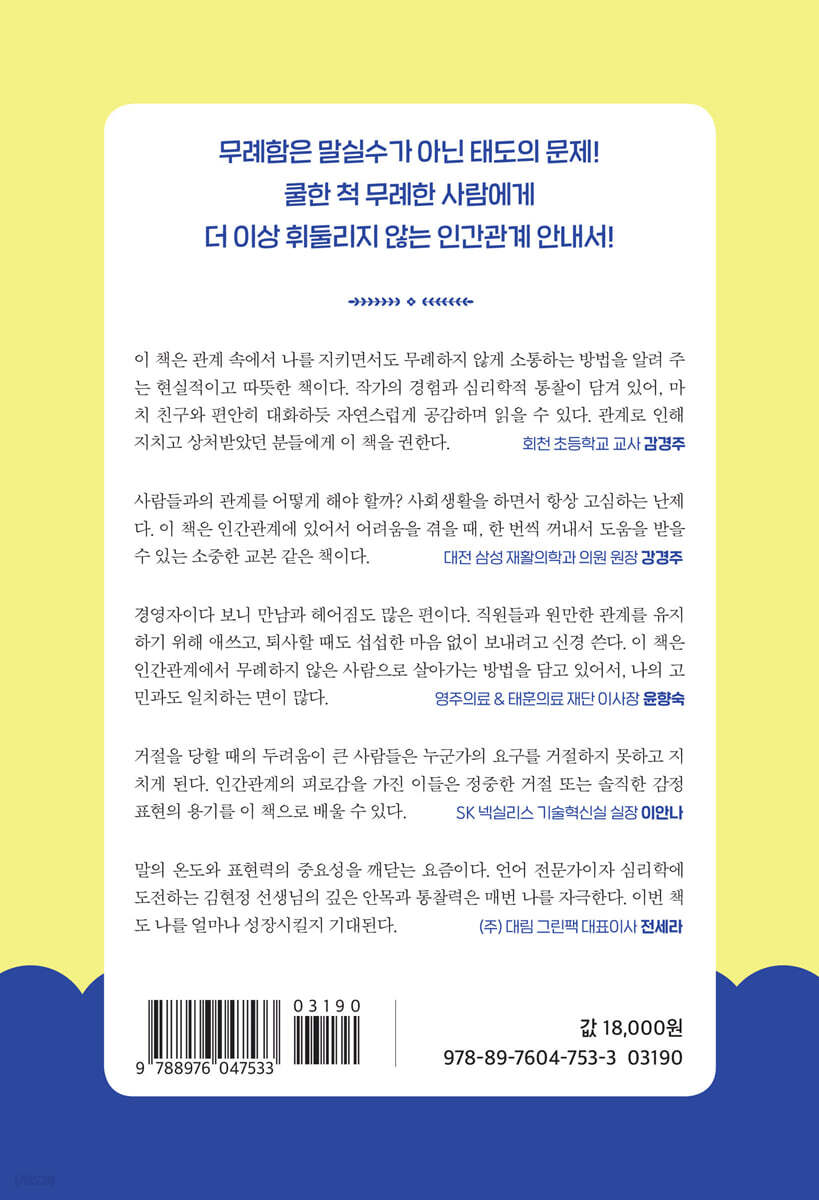 이 책은 관계 속에서 나를 지키면서도 무례하지 않게 소통하는 방법을 알려 주는 현실적이고 따뜻한 책이다. 작가의 경험과 심리학적 통찰이 담겨 있어, 마치 친구와 편안히 대화하듯 자연스럽게 공감하며 읽을 수 있다. 관계로 인해 지치고 상처받았던 분들에게 이 책을 권한다. - 감경주 (회천 초등학교 교사)