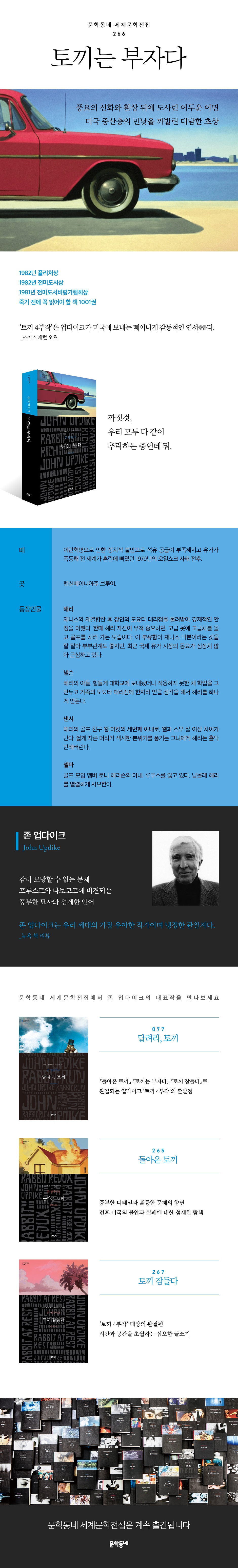 풍요의 신화와 환상 뒤에 도사린 어두운 이면미국 중산층의 민낯을 까발린 대담한 초상1979년의 오일쇼크 사태를 배경으로 한 『토끼는 부자다』는 아내와 재결합한 후 장인의 도요타 대리점을 물려받아 경제적 안정을 이룬 중년의 해리가 여전히 과거의 그림자에 시달리며 느끼는 감정적 격변을 그린 작품으로, 호화로운 번영을 누리면서도 과거의 ‘악몽’에 시달리는 미국의 현실을 소환하는 수작이다.업다이크가 “나의 형제이자 나의 친한 친구”라고 애정을 표현한 래빗은 계속해서 현실에서 달아나려고 하지만 결국 현실과 마주해야 한다. 래빗의 성(姓)인 ‘앵스트롬(Angstrom)’ 자체에 불안을 뜻하는 독일어 ‘앙스트(angst)’가 들어 있는 것이 그에 대한 은유인 듯하다.래빗의 불안은 미국의 불안이기도 하고, 격동하는 시대의 좌절이기도 하다. 누구나 공감할 만한 고민을 가진 평범한 인물의 이십대부터 시작해 노년의 죽음에 이르는 과정을 통해 미국의 번영과 몰락을 설득력 있게 그려내었기에, 대중적 인기와 평단의 찬사를 모두 얻은 명작이 되었다.