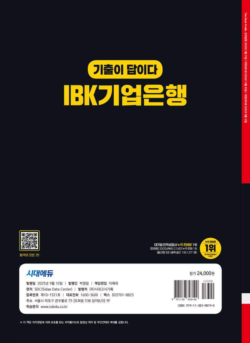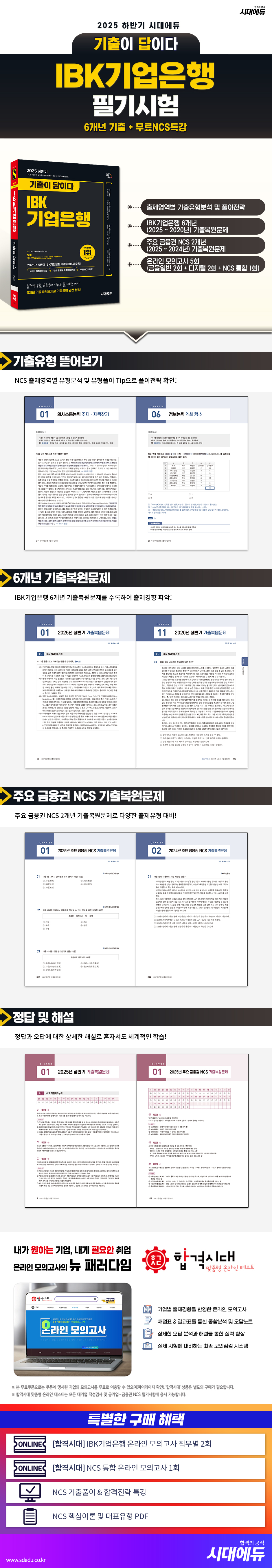 IBK기업은행은 인재를 채용하기 위해 필기시험을 시행하여 지원자가 업무에 필요한 역량을 갖추고 있는지 평가한다. 이에 시대에듀는 수험생들이 출제경향을 파악하고 시험에 효과적으로 대비할 수 있도록 『2025 하반기 시대에듀 기출이 답이다 IBK기업은행 필기시험』을 출간하였다.
