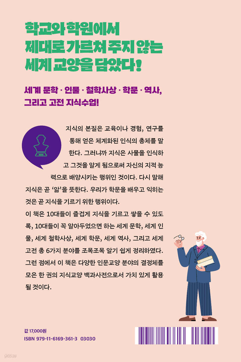 10대를 위한 지식수업 CHAPTER 1 명쾌하고 감동적인 글 _ 세계 문학 변신 | 적과 흙 | 좁은 문 | 잃어버린 시간을 찾아서 | 수레바퀴 밑에서 | 베니스의 상인 | 아버지와 아들 | 폭풍의 언덕 | 인간의 굴레 | 동물농장 |천로역정 | 주홍 글씨 | 백경 | 톰 아저씨의 오두막 | 마지막 잎새 | 테스 | 욕망이라는 이름의 전차 | 양철북 | 부활 | 가보지 못한 길 | 이런 사랑 | 노인과 바다 | 돈키호테 | 젊은 베르테르의 슬픔 | 별 | 크리스마스 캐럴 | 목걸이 | 미운 오리 새끼 | 기탄잘리 | 작은 아씨들 | 고리오 영감 | 왕자와 거지 CHAPTER 2 세상의 중심에 선 사람들 _ 세계 인물 버락 오바마 | 이사도라 던컨 | 앨버트 아인슈타인 | 윈스턴 처칠 | 제인 구달 | 마가릿 대처 | 조지 워싱턴 | 윌리엄 오슬러 | 구스타브 에펠 | 스티븐 스필버그 | 조지 소로스 | 프랭클린 | 루스벨트 | 존 F. 케네디 | 엔리코 카루소 | 알프레드 노벨 | 벤저민 프랭클린 | 오프라 윈프리 | 플로렌스 나이팅게일 | 스티븐 호킹 | 헨리 키신저 | 벤저민 디즈레일리 | 조지 마셜 | 오드리 헵번 | 마더 테레사 | 허레이쇼 넬슨 | 마르쿠스 아우렐리우스 | 마르틴 루터 | 김구 | 이순신 | 안중근 CHAPTER 3 생각의 근육을 키우다 _ 세계 철학사상 자연주의 철학 | 스토아 학파 | 스콜라 철학 | 그리스도 사상 | 헬레니즘 | 헤브라이즘 | 고전주의 | 낭만주의 | 형이상학과 형이하학 | 초월주의 | 톨스토이즘 | 모더니즘 | 페미니즘 | 사회주의 | 자본주의 | 실존주의 | 포스트모더니즘 | 무위자연 | 공자 | 맹자 | 탈레스 | 아우구스티누스 | 르네 데카르트 | 프랜시스 베이컨 | 임마누엘 칸트 | 쇼펜하우어 | 프리드리히 니체 | 마르틴 하이데거 | 랠프 왈도 에머슨 | 칼 마르크스 | 헨리 데이비드 소로 | 장 폴 사르트르 | CHAPTER 4 배움의 가치를 높이다 _ 세계 학문 하부루타 | 절대주의 사회교육 | 계몽주의 교육 | 자연주의 교육 | 바제도의 교육사상 | 교육이론 | 존 로크의 교육사상 | 루소의 교육사상 | 교육심리학 | 본질주위 교육 | 진보주의 교육 | 역진행 수업 | 페스탈로치의 교육사상 | 계발주의 교육 | 실학주의 | 인문학 | 사회학 | 미학 | 수사학 | 논리학 | 마리아 몬테소리 | 스승과 제자 | 프리드리히 프뢰벨 | 학행일치 | 참된 배움의 자세 | 랍비 힐렐 | 문단법 | 멘토링 | 보편지식 | 평생학습 CHAPTER 5 격변의 동양사와 서양사 _ 세계 역사 역사란 무엇인가 | 세계 4대 문명의 발상지 | 춘추전국시대 | 실크로드 | 몽골제국의 탄생과 영화 | 만리장성 | 아편전쟁 | 문화대혁명 | 종교개혁 | 프랑스혁명 | 미국 남북전쟁 | 간디의 비폭력 무저항주의 | 베르사유 조약 | 뉴딜 정책 | 태평양 전쟁 | 제2차 세계대전 | 홀로 코스트 | 국제연합 | 철의 장막 | 나토 창설 | 미국의 민권운동 | 베트남 전쟁 | 핑퐁 외교 | 레이거노믹스 | 베를린 장벽 붕괴 | 을파소와 진대법 | 삼국통일은 어떻게 이뤄졌을까 | 강감찬과 거란전쟁 | 영조의 탕평책 | 기묘사화와 주초위왕의 계략 CHAPTER 6 고문(古文)은 보석과 같다 _ 세계 고전 도덕경 | 논어 | 춘추좌씨전 | 사기 | 자치통감 | 맹자 | 대학 | 회남자 | 예기 | 장자 | 효경 | 명심보감 | 근사록 | 한비자 | 열자 | 채근담 | 삼국지 | 정치학 | 군주론 | 사회계약론 | 자유론 | 법의 정신 | 팡세 | 순수이성비판 | 죽음에 이르는 병 | 차라투스트라는 이렇게 말했다 | 존재와 시간 | 민주주의와 교육 | 영웅전 | 난중일기 | 갈리아전기 |