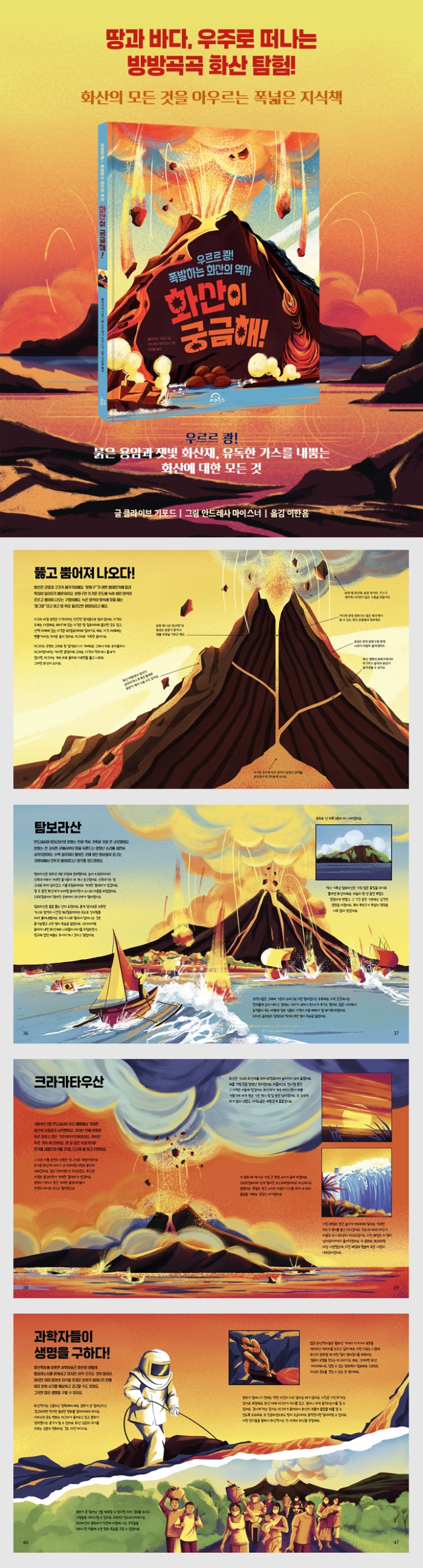 우르르 쾅!_8 뚫고 뿜어져 나오다!_10 사화산?휴화산?활화산_12 불의 고리_14 분화!_16 다양한 용암_18 화산의 종류_20 가장 강력한 화산!_22 VEI 1과 VEI 2_24 VEI 3과 VEI 4__26 VEI 5와 VEI 6__28 VEI 7과 VEI 8__30 악명 높은 화산들_32 베수비오산_34 탐보라산_36 크라카타우산_38 세인트헬렌스산과 에이야퍄들라이외퀴들산_40 화산과 함께 살아가기_42 화산이 만든 지형_44 과학자들이 생명을 구하다!_46 태양계의 수많은 화산_48 뜻풀이_50