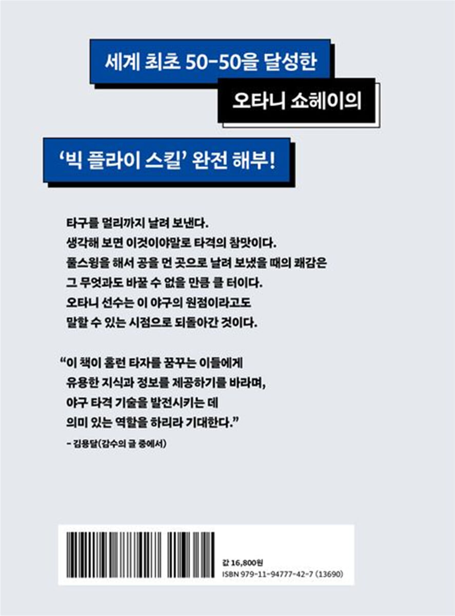 오타니 쇼헤이가 진화할 수 있었던 첫 번째 요인은 가장 큰 힘을 낼 수 있는 동시에 가장 재빠르게 이동할 수 있는 ‘파워 포지션’ 자세를 확립한 것이다. 두 번째 요인은 상반신을 원활하게 움직일 수 있도록 견갑골의 운동성과 안정성을 향상시킨 것이다. 세 번째 요인은 웨이트 트레이닝을 반복적으로 꾸준히 실시해 근육량을 증가시킨 것이다. 네 번째 요인은 타격의 중심 운동을 수평 회전 중심에서 수직 회전 중심으로 전환하여 올바른 어퍼 스윙을 할 수 있게 된 것이다. 오타니 선수는 첫 번째, 두 번째, 세 번째 요인을 통해 타격의 기초가 되는 몸을 만들고, 그 기반 위에서 네 번째 타격의 방법론을 크게 전환시켜 홈런 타자로 진화할 수 있었다. 오타니 쇼헤이 타격 메커니즘의 15가지 포인트 오타니 쇼헤이의 타격 메커니즘을 구체적으로 살펴보면, 먼저 토 스텝을 활용한 힙 퍼스트로 체중 이동과 엉덩이 꼬임을 만들고 톱 핸드 플라잉 엘보를 구축한다. 그리고 가장 크게 비거리를 증가시키는 19도로 타격할 수 있도록 수직 회전을 활용해 컨택트 구역을 넓히고 스윙의 궤적을 크게 가져간다. 저자는 이처럼 오타니 선수의 타격 자세 메커니즘을 15가지 포인트로 정리해 단계별로 자세히 분석함으로써 타구를 멀리 보내 홈런을 만들어내는 방법론에 최대한 과학적으로 접근하고 있다. 오타니 쇼헤이 같은 홈런 타자가 되기 위해서는 어떻게 훈련해야 할까? 이 책에는 타격 메커니즘의 이해를 돕는 300점 이상의 친절한 일러스트와 훈련법 동영상을 시청할 수 있는 QR코드, 오타니의 타격 자세를 생생하게 확인할 수 있는 플립북 애니메이션 등을 함께 수록해 실제로 따라할 수 있도록 활용도를 높였다. 또한 오타니 쇼헤이의 컨디션 관리 방법과 독특한 루틴도 소개해 그의 실력에 가까워지기 위한 이들에게 다각도로 도움을 주고자 했다. 오타니 선수처럼 타구를 최대한 멀리 날려 보내고 싶은 선수는 물론, 제자들을 장타자로 만들고 싶은 코치, 오타니 쇼헤이 팬들이 반드시 읽어야 할 책이다. 감수의 글 스포츠 의학을 전공한 저자는 오타니의 타격 메커니즘을 분석하여 홈런을 만들어내는 기술에 과학적으로 접근하고 있다. 근육량, 견갑골의 운동성과 안정성, 골반·대요근·고관절의 활용 능력 등과 홈런의 상관관계를 밝힌 부분이 흥미롭고 인상적이다. _김용달(현 중국 장쑤성 야구 대표팀 총괄 코치 겸 타격 코치) |