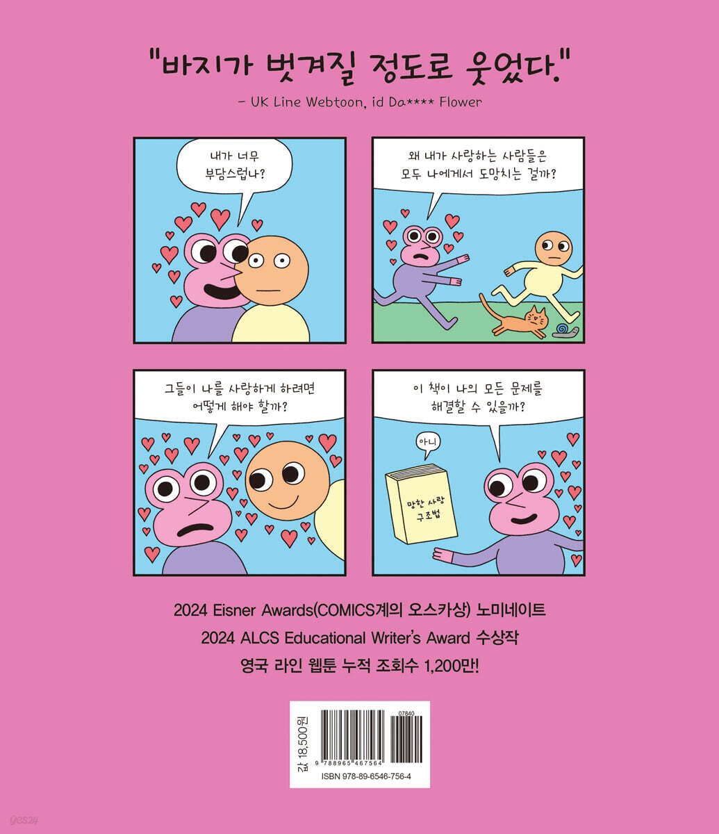 앨릭스 노리스의 화제의 그래픽노블! 누적 조회수 1,200만을 기록하며 수많은 독자들의 공감을 불러일으킨 저자 앨릭스 노리스는 웹툰으로 연재했던 『망한 사랑 구조법』을 정리하여 출간하였다. 저자는 사람들의 삶에 의미있는 영향을 줄 수 있도록 좀 더 근본적인 내용을 이 책에 담고 싶었다고 말한다. 그는 정형화된 조언 대신 ‘내가 어떤 사람이고 어떤 사랑을 할 수 있는지’ 내면을 성찰 할 수 있는 질문을 던지며 독자가 관계의 본질을 다시 바라보도록 이끈다. 그 결과 이 책은 “다양한 형태의 사랑에 폭넓게 접근하는 따뜻하고 재치 있는 작품”이라는 심사위원의 찬사를 받으며, 영국에서 가장 권위 있는 교육 논픽션상인 2024 ALCS 교육 작가상을 수상했다. 또한 유머와 통찰을 모두 담아낸 작품성으로, 코믹스계의 오스카상이라 불리는 “Eisner Awards” 최종 후보작에 이름을 올리며 국제적인 주목을 받았다. 몇 번을 넘어져도 사랑을 포기하지 않는 이들을 위한 가장 발칙하고 유쾌한 연애 지침서 수많은 책과 매체가 사랑을 다루고 있음에도 우리는 왜 여전히 답을 찾지 못할까? 저자는 그 이유를, ‘사랑의 정답을 외부에서만 구하기 때문’이라고 짚는다. 결국 다른 사람을 사랑하기 위해서는 먼저 나 자신을 이해하고 사랑해야 한다는 점을 이 책은 환기한다. 이 책은 크게 네 가지 상황으로 구성된다. 혼자일 때와 사랑에 빠지는 시기, 그리고 함께하고 있을 때와 마지막으로 이별과 재출발의 순간에 따른 이야기를 다루고 있다. 혼자일 때는 ‘사랑은 꼭 필요한가?’, ‘외로워지면 어떡하지?’ 같은 고민의 상황을 다룬다. 사랑에 빠지면 ‘왜 마음에 드는 사람 앞에서 더 어색해질까?’, ‘상대방이 나를 헷갈리게 한다면?’ 같은 혼란에 대해서 폭넓게 다룬다. 함께할 때면 ‘질투는 좋은 걸까?, 나쁜 걸까?’, ‘왜 사람들은 연인이 생기면 우정을 버릴까?’ 같은 갈등 요소까지 다루고 있다. 마지막으로 ‘상처 주지 않고 헤어질 수 있을까?’, ‘헤어진 후에도 친구로 남을 수 있을까?’ 같은 이별과 재출발의 순간까지 이 책에는 담겨 있다. 목차 하나하나는 연애의 상황을 나열하는 것이 아니라, 각 단계마다 놓치기 쉬운 문제를 짚어내 독자가 사랑을 새롭게 바라보게 하는 실질적 프레임을 제공한다. ‘망한 사랑’을 넘어 망한 사랑 속에서 방황하는 ‘나’를 구조하는 책. “이 책은 ‘어떻게 사랑하라’가 아닌 ‘당신답게 사랑하라’고 말한다.” 위의 말은 이 책을 읽었던 한 독자가 쓴 서평이다. 사랑은 누구에게나 익숙하지만, 동시에 가장 풀기 어려운 문제 중 하나다. 어쩌면 연애가 자꾸 꼬이는 이유는 누군가의 잘못된 행동이 아니라 스스로를 충분히 알지 못하기 때문일지도 모른다. 『망한 사랑 구조법』은 그 빈틈을 메워주는 책이다. 이 책에서 제시하는 질문들을 따라가다 보면 독자는 자연스럽게 자신의 관계를 되돌아보고, 무심코 지나쳤던 내 감정들을 마주하게 된다. 책장을 덮는 순간, 우리는 더 이상 ‘망한 사랑’에 머무르지 않고, 나다운 사랑을 향해 나아갈 준비를 마치게 된다. 무엇보다 중요한 것은, 이 책이 독자에게 단순한 연애 지침서가 아니라 삶의 태도를 바꾼다는 것이다. 연애라는 한정된 관계를 넘어, 나 자신을 이해하고 타인과 건강하게 연결되는 법까지 배울 수 있다. 그 과정에서 독자는 혼란을 성찰로, 실패를 새로운 출발로 전환할 수 있는 힘을 얻게 된다. 『망한 사랑 구조법』은 결국 망한 ‘사랑’만을 구조하는 책이 아니라 망한 사랑 속에서 방황하는 ‘나’를 구조하는 책이다. |