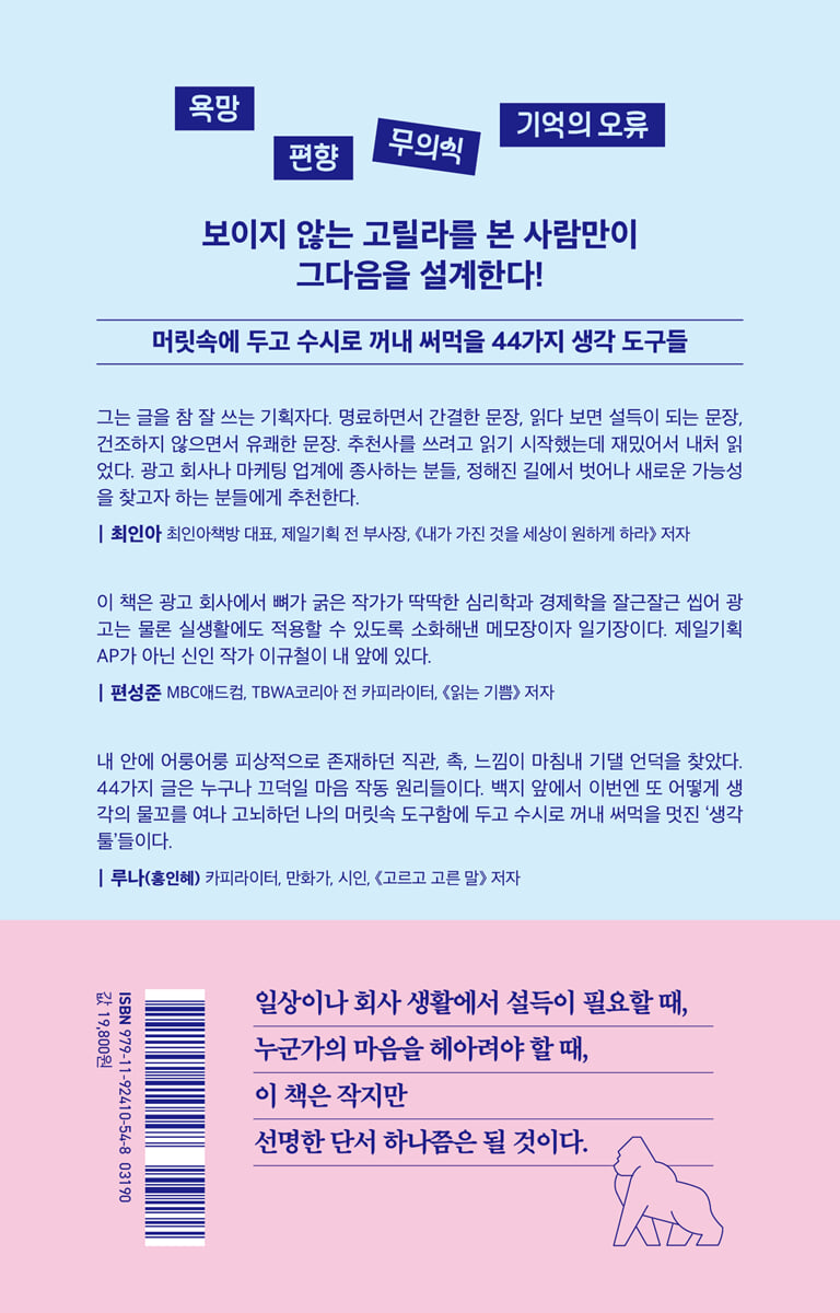 “제일기획 AP가 아닌 신인 작가 이규철이 내 앞에 있다.” _편성준(MBC애드컴 전 카피라이터) “직관, 촉, 느낌이 마침내 기댈 언덕을 찾았다.” _루나(홍인혜)(카피라이터, 만화가, 시인) 심리학과 경제학에서 찾은 설득과 주목의 솔루션 예리한 감각과 언어, 판단의 틈을 채워주는 기획자의 사고법 욕망, 편향, 무의식, 기억의 오류... 보이지 않는 고릴라를 본 사람만이 그다음을 설계한다! 사람들은 자신이 보고 싶은 것만 본다. 이 단순한 진실은 회사에서 전략을 짜는 사람, 기획자들에겐 절박한 문제다. 아무리 데이터를 쌓고 설득의 논리를 다듬어도, 정작 핵심을 놓치는 순간은 언제나 무의식에서 시작된다. 심리학계의 고전으로 불리는 ‘보이지 않는 고릴라’ 실험은 그 점을 명확히 보여준다. 참가자들은 화면 속에서 흰옷을 입은 사람들이 주고받는 공의 개수를 세느라 중간에 고릴라 분장을 한 사람이 등장한 사실조차 알아차리지 못했다. 우리의 뇌는 보고 싶은 것만 보고, 듣고 싶은 것만 듣는다. 그렇게 놓친 것들 사이에는 반드시 사람의 마음을 움직이는 진짜 단서가 숨어 있다. 기획자는 바로 그 ‘놓친 것들’을 포착해내는 사람이다. 익숙한 생각의 틀을 의심하고, 보이지 않는 욕망과 편향, 감정의 결을 읽어내는 사람. 이 책은 그런 기획자의 시선과 언어, 생각의 과정을 담았다. 『욕망하는 기획자와 보이지 않는 고릴라』는 광고 회사에서 15년 넘게 기획자로 일해온 저자 이규철이 일상과 업무에서 아이디어를 얻고 문제를 해결하는 과정을 심리학과 경제학 이론 위에 정리한 책이다. 확증 편향, 손실 회피, 칵테일파티 효과, 스트라이샌드 효과, 붉은 여왕 가설 등 일상과 마케팅 현장에 숨어 있는 다양한 심리 기제를 44가지 ‘생각 도구’로 풀어낸다. 이 책은 이론을 나열하거나 개념을 설명하는 데 그치지 않는다. 기획자라는 직업인의 눈으로 일상의 작은 순간들을 해석하며, 각 이론을 살아 있는 사례와 연결해 실용적인 사고 도구로 재구성한다. 헬스장에서 사람들의 행동을 관찰하며 ‘호손 효과’를 떠올리고, 친구의 은밀한 취미를 통해 ‘인지적 구두쇠’를 설명하며, 조직 생활 속에서 창의성과 자기검열 사이의 긴장을 ‘요나 콤플렉스’라는 심리 개념으로 풀어내는 식이다. 각각의 이론은 회의실, 경쟁 PT, 브랜드 캠페인, 조직 생활 같은 실제 기획 현장에서 어떻게 작동하는지를 구체적으로 보여준다. 이렇게 연결된 ‘생각 도구’는 단편적인 지식이 아니라 기획자가 생각을 꺼내고, 설득을 설계하고, 심리를 해석하기 위해 사용하는 실전적인 언어가 된다. 한마디로 기획 이전에 ‘생각의 뿌리’를 짚어보는 작업으로 전략의 씨앗을 찾아내는 과정이다. ‘생각은 어디서 시작되고, 사람의 마음은 어떻게 움직이는가’에 대한 본질적인 질문을 던지는 이 책은, 인간의 사고방식과 내면의 작동 원리를 들여다보는 인문적 탐구이기도 하다. 기획자, 마케터, 브랜드 실무자처럼 매일 설득과 선택 사이에 놓인 사람들에게는 물론, 콘텐츠를 만들고 메시지를 기획하는 크리에이터, 조직 안에서 설득과 회의, 감정을 오가는 직장인들에게도 깊은 공감을 준다. 생각이 막힐 때 꺼내어 볼 수 있는 정리된 개념들, 전략을 짤 때 영감을 주는 사례들, 때로는 감정의 실마리를 풀어주는 문장들까지 생각과 언어로 일하는 사람들의 곁에서 조용히 작동하는 ‘생각의 도구함’이자 내면의 리듬을 정돈하도록 도와주는 친절한 안내서다. 경쟁 PT를 앞두고, 회의실에서 설득의 논리를 고민하는 순간, 한 줄 카피가 떠오르지 않아 멈춰 있을 때, 가까운 누군가의 마음을 헤아리고 싶을 때마다 펼쳐볼 수 있는 책이다. 데이터와 논리를 넘어 인간의 본성과 감정의 결을 읽어내고 ‘생각하는 힘’을 길러주는 사유의 기술서라 하겠다. 소비자의 심리를 설계하는 어느 광고 기획자의 인사이트 노트 설득과 전략, 사람의 심리를 꿰뚫는 44가지 생각 도구들 『욕망하는 기획자와 보이지 않는 고릴라』는 일상과 업무 현장에서 마주친 순간들을 심리학과 경제학의 시선으로 읽어내며, 그 안에 숨은 전략과 사고의 원리를 쉽고 흥미롭게 풀어낸다. 각 장은 기획자의 생각이 어떻게 현실과 맞닿는지를 보여주는 구체적인 사례들로 가득 채워져 있다. 1장 ‘일상에서 인사이트를 낚아채는 방법’에서는 기획자의 관찰력과 사고의 방향을 보여준다. 매일 스쳐 지나가는 일상에서 무엇을 보고 어떻게 다르게 생각할지를 묻는다. 뉴스와 SNS에서 자신에게 유리한 정보만을 받아들이는 태도에서 ‘확증 편향’을 읽어낸다. 우리는 사실보다 믿고 싶은 것을 먼저 받아들이고, 이 선입견은 전략 수립에서도 무의식적 오류로 작동한다. 또 무수한 정보 속에서도 자기 이름은 곧잘 들리는 ‘칵테일파티 효과’를 통해 사람들의 감각이 무엇에 민감하게 반응하는지를 설명한다. 기획자는 감정과 주의의 결을 읽는 사람이라는 통찰이 드러나는 장이다. 2장 ‘심리학과 경제학의 쓸모’에서는 행동경제학의 주요 개념을 활용해 설득과 메시지의 조건을 짚는다. ‘어떤 콘텐츠가 오래 기억되는가?’라는 질문에서 출발한 저자는 ‘자