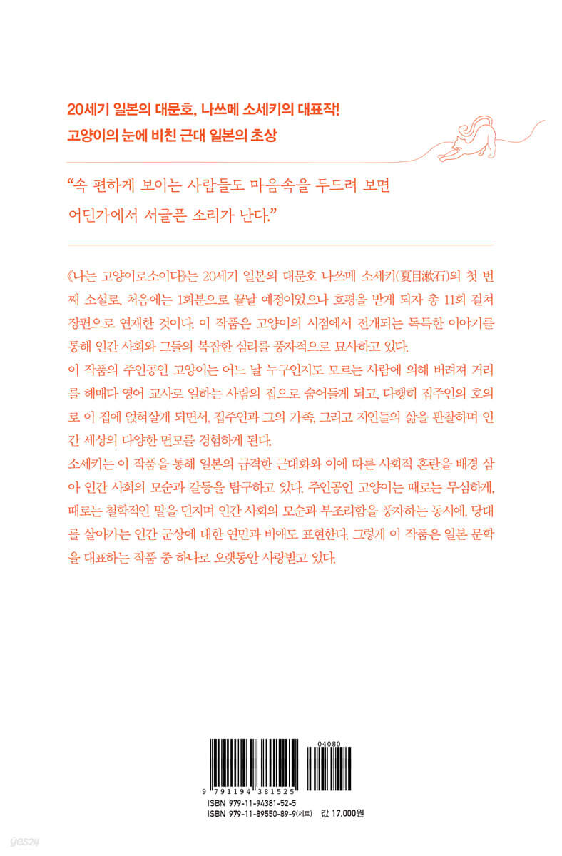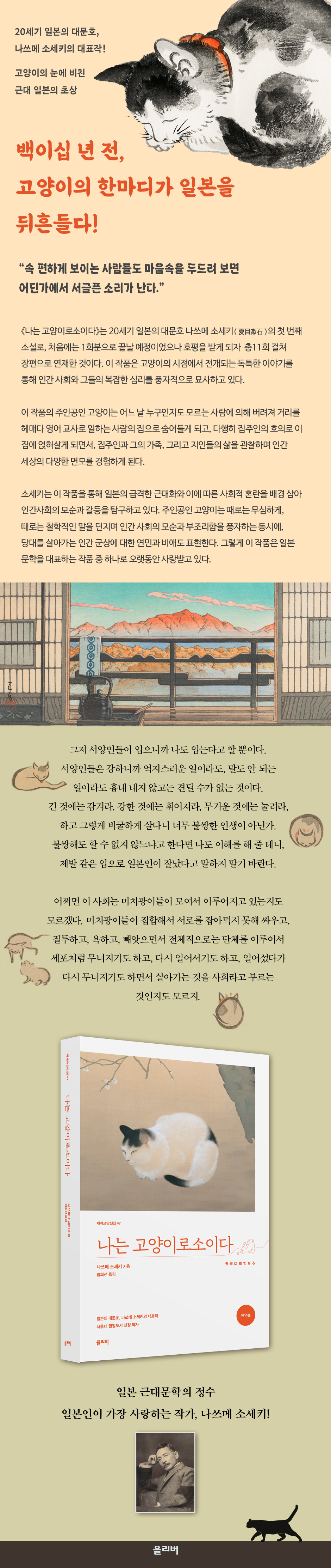 《나는 고양이로소이다》의 화자는 이름 없는 한 마리의 고양이다. 아주 우연한 기회로 교사의 집에 머물게 된 그는 인간 사회라는 복잡한 무대를, 객석의 맨 앞자리에서 관람하는 특권을 누리게 된다. 하지만 고양이의 시선은 결코 부드럽거나 따듯하지 않다. 그는 20세기 초, 급격한 근대화 속에 변해 가는 일본 사회의 모습을 무심한 눈길로 냉정하게 바라보며 그 속에서 살아가는 인간 군상들의 모순과 부조리를 철저하게 해부한다. 고양이의 눈에 비친 인간들은 지식과 품위를 과시하지만 그들의 영혼은 공허하고, 이런 공허를 채우기 위해 체면과 명예를 중시하며, 서로를 비교하며 남들보다 우위에 서기 위해 끝임없이 돈에 집착한다. 고양이는 이들의 모순과 부조리를 유머로 포장하여 보여 주지만, 그 웃음은 편하지 않다. 독자는 고양이의 말 한마디에 피식 웃다가도, 그 말 속에 담긴 날카로운 풍자에 얼굴이 굳는다. 이 과정에서 소세키는 급격한 근대화의 물결 속에서 무작정 서구를 추종하는 서구주의자들과 무조건 동양적인 것, 일본적인 것이 좋은 것이라고 여기는 국수주의자들에 대해 비판적 입장을 취한다. 그러면서 진정으로 독립적인 ‘나’를 정립하기 위해서는 어떻게 해야 하는지 치열하게 고민한다. 백이십 년 전, 고양이의 한마디가 일본을 뒤흔들다! 1905년, 《나는 고양이로소이다》가 처음 세상에 나왔을 때, 일본 문단은 전례 없는 충격에 휩싸였다. 전통적 서사 방식과 서구 문학의 모방이 뒤섞이며 방향을 잡지 못하던 시기에, 나쓰메 소세키는 고양이라는 특이한 화자를 앞세워 완전히 새로운 가능성을 제시했다. 그래서 이 작품은 기발함이 아니라 치밀한 문학 실험의 결과물이라고 할 수 있다. 서구 리얼리즘의 정밀한 관찰, 일본어 특유의 섬세하고 유연한 문체, 그리고 에도시대 해학의 전통이 절묘하게 결합되어 있다. 그렇게《나는 고양이로소이다》는 단순한 인기 소설을 넘어 일본 근대문학의 방향을 바꾼 기념비적 선언이 되었다. 고양이의 말투는 장난스럽지만, 그 속에는 사회 비판과 인간 탐구가 촘촘히 숨겨져 있고, 단순히 비판과 풍자만 있는 것이 아니라, 동시대 사람들에 대한 애정과 연민까지 담고 있어, 지금까지도 살아 숨 쉬는 ‘생명력 있는 고전’임을 확인시킨다. 웃음과 사색을 동시에 선사하는 이 작품은, 세대와 시대를 넘어 독자와 계속 대화하는 문학의 드문 예가 되고 있다. |