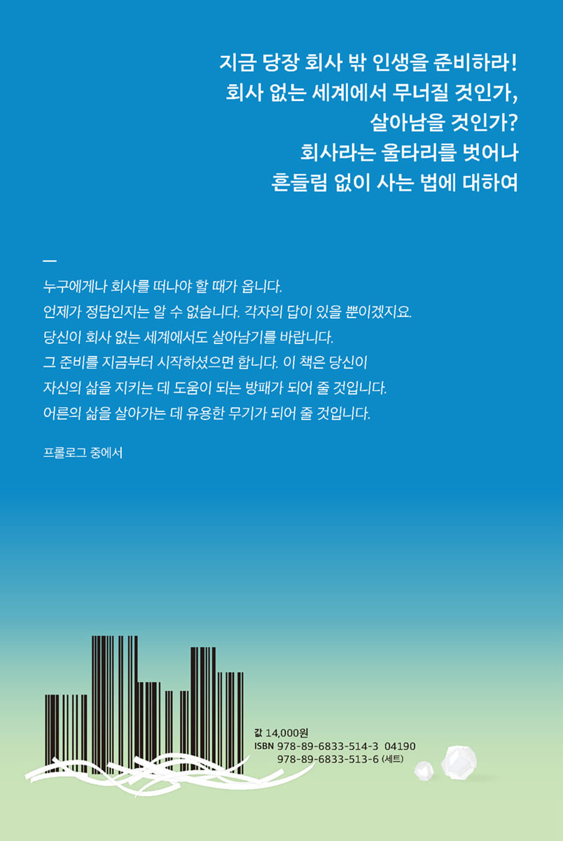 이 글을 읽는 당신이 30대라면 잘되었습니다. 20대면 더 좋습니다. 40대라도 괜찮습니다. 지금이라도 깨달으면 됩니다. 아니 사실은 이미 알고 있을지도 모릅니다. 미래를 위해 준비해야 한다는 것을요. 40대도 결코 늦은 나이가 아닙니다. 젊음이 곧 경쟁력입니다. 한 살이라도 어릴 때 나만의 경쟁력을 만들어야 합니다. 이것저것 도전하고 경험하고 준비하는 것은 반드시 필요한 일입니다. ---「40대 직장인이 하루빨리 깨달아야 하는 것」중에서 회사가 직원을 필요로 하지 않을지도 모르는 상황이 코앞에 있다면 우리는 무엇을 해야 할까요? 회사에 충성하는 것? 회사가 나의 전부라고 생각하는 것? 아닙니다. 그렇게 생각한다면 정신 차려야 합니다. ‘충성’이나 ‘전부’라는 말은 더는 오늘날의 일자리에 어울리는 단어가 아닙니다. 저는 직장인들이 이런 생각을 가졌으면 좋겠습니다. ‘영원히 다닐 것처럼 일하고, 내일 당장 그만둘 것처럼 준비하라.’ 우리는 언제든 해고의 대상이 될 수 있고, 우리가 그런 시대를 살고 있다는 말은 이제 지겨울 정도입니다. 그런데 당신은 준비가 되어 있나요? 나와 회사가 건전한 관계가 되려면 서로 같은 생각을 해야 합니다. 회사가 언제든 나를 버릴 수 있다면 나도 언제든 회사를 버릴 수 있다고 생각해야 합니다. 버릴 수 있으려면 무엇이 필요할까요? 회사에서 얻는 경제적인 부분을 나 스스로 만들어 낼 수 있어야죠. 하지만 그런 준비가 된 사람은 극소수에 불과합니다. 여러분이 바로 그런 사람이 되어야 합니다. ---「회사는 언제든 당신을 버릴 수 있다」중에서 저는 직장 생활을 하면서 직장인과 프리랜서를 병행하였고, 퇴사 후에는 프리랜서와 개인 사업자를 병행했으며, 현재는 프리랜서이면서 법인 사업자입니다. 직장에 다닐 때는 몰랐던 다양한 경제 활동 형태를 하나하나 알아 가고 있습니다. 개인 사업자나 법인 사업자가 되면 이제 내가 사업자 혹은 회사 대표입니다. 내가 기댈 곳이 없어진다는 점이 나를 불안하게 할 수 있습니다. 그러나 회사에 속하여 휘둘리지 않고, 사업자 혹은 회사 대표로서 내 운명을 스스로 개척해 나간다는 보람도 있습니다. 평생 직장 생활만 했다면 ‘과연 내가 할 수 있을까?’ 하는 생각이 들 수도 있습니다. 하지만 누구나 처음은 있습니다. 모든 직장인들은 언젠가 회사를 나와야 합니다. 그러니 직장인 외 다른 경제 활동 형태에 대해서도 관심을 가지길 바랍니다. 회사를 그만두고 새로운 일을 시작하면 경험도 실력도 부족할 것입니다. 그렇기 때문에 처음에는 프리랜서로 일을 경험해 보고 돈을 버는 업종과 구조, 소득 수준에 따라 유리한 형태를 선택하면 좋습니다. ---「회사를 그만두면 어떻게 살아야 할까? - 4가지 경제 활동 형태에 따라」중에서 |