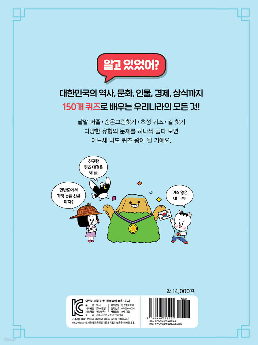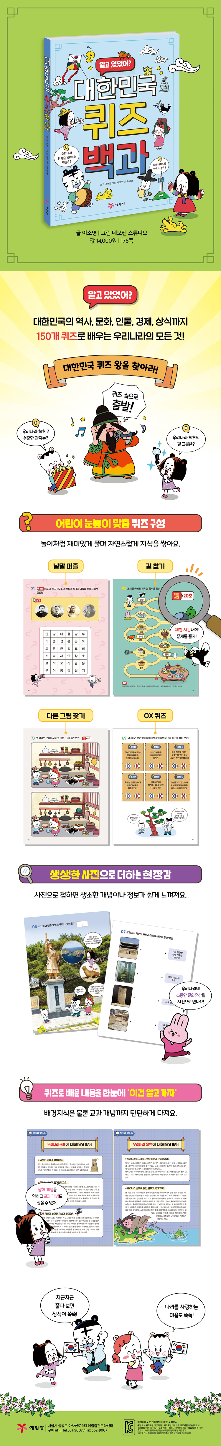 사다리 타기, 초성 퀴즈, ○× 퀴즈 등 어린이들이 재미있게 풀 수 있는 다양한 유형의 퀴즈를 150개 담았습니다. 역사, 인물 등의 분야를 놀이처럼 재미있게 풀며 자연스럽게 지식을 쌓을 수 있게 했지요. 이 한 권이면 우리나라에 대한 풍부한 배경지식을 쌓을 수 있을 거예요. 단순히 정답을 맞히는 것이 목표가 아니라 퀴즈를 통해 생각하고, 유추하는 과정을 자연스레 경험할 수 있으며, 지식은 물론 사고력을 키우고 풍부한 상식을 쌓을 수 있답니다. 교과 연계는 물론 상식까지 한 번에 『대한민국 퀴즈 백과』의 퀴즈는 초등학교 사회, 국어, 도덕 교과 연계를 기본으로 우리나라의 역사, 지리, 문화, 인물 등 핵심 내용을 익힐 수 있도록 했습니다. 나아가 교과서에서 다루진 않지만 꼭 알아 두면 좋은 정보를 더해 상식과 생활 속 교양을 쌓을 수 있도록 도와줍니다. 공부에 흥미가 없는 아이라도 게임하듯 가볍게 한 문제씩 풀어 보면 어느새 내용을 학습하는 경험을 하고, 우리나라에 대한 다양한 정보를 알 수 있을 거예요. 생생한 사진 자료로 더하는 현장감 우리나라에 대한 정보를 단순히 글로만 전달하는 것이 아니라 역사 속 인물, 문화 유산 등 사진 자료를 풍부하게 담았습니다. 눈으로 직접 사진을 보며 퀴즈를 풀다 보면 현장에 있는 것처럼 깊게 몰입할 수 있지요. 사진과 함께 개념을 공부하면 생소한 개념이나 정보가 기억에 남도록 도움을 주고, 교과서 개념이 쉽게 느껴질 거예요. 혼자서도, 함께 풀어도 좋은 책 『대한민국 퀴즈 백과』는 문제집처럼 혼자 문제를 푸는 책이 아니에요. 친구와 서로 문제를 내며 게임 해도 좋고, 흥미 있는 페이지부터 펼쳐 퀴즈를 풀며 자기만의 방식으로 책을 활용해도 좋아요. 이를 통해 자기 주도 학습을 할 수 있고, 상대방과 소통하며 협동심, 사회성까지 기를 수 있을 거예요. 이 책은 단순히 우리나라에 대한 상식을 쌓을 수 있는 딱딱한 책이 아니라 놀이와 학습이 결합된 지식 백과입니다. |