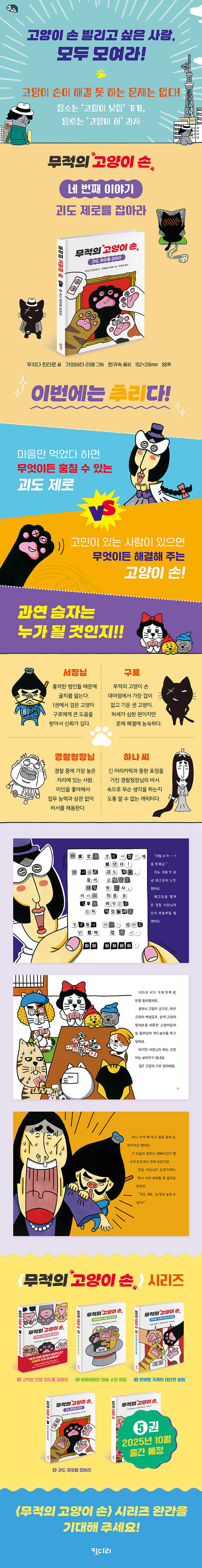괴도 제로의 정체는? ‘무적의 고양이 손’ 시리즈에는 매번 다른 사람을 괴롭히는 인물이 등장합니다. 1권에서는 어린아이를 인질로 삼는 은행 강도가 등장하고, 3권에서는 문어빵 가게의 영업을 망치려는 인물이 있습니다. 2권에서는 마술 쇼의 진행을 방해하는 어린이가 있죠. 1권에서 3권까지는 중심 인물을 방해하는 캐릭터가 전면에 드러났다면, 4권에서는 악당의 정체가 감춰져 있습니다. 오히려 눈에 띄는 것은 서장님과 구로를 함부로 대하며 어떤 것도 책임지지 않으려는 경찰청장님입니다. 눈 밝은 독자라면 미술관에서 가장 유명한 그림들을 훔쳐 가는 ‘괴도 제로’의 정체가 이 인물과 무관하지 않다는 것을 알 수 있습니다. 어린이가 읽고 또 읽는 〈무적의 고양이 손〉 시리즈 독서의 폭을 넓혀 주는 징검다리 동화! 초등학교 저학년 때는 그림책에서 동화책으로 독서의 폭을 서서히 넓혀 나갑니다. 이 시기에는 어린이가 자신의 힘으로 처음부터 끝까지 읽을 수 있는 책이 필요합니다. ‘무적의 고양이 손 시리즈’는 전체 88페이지 중 모든 페이지에 그림이 있고 글 원고의 분량이 적절할뿐더러, 어린이들이 좋아하는 ‘고양이 캐릭터’가 등장합니다. 이 시리즈를 실제로 접한 어린이이들은 “시간 가는 줄 모르고 읽었다.”고 반응했고, 양육자들 또한 “책을 좋아하지 않는 아이가 이 책은 읽고 또 읽는다.”는 리뷰를 남겼습니다. ‘고양이 손을 빌려 준다’는 〈무적의 고양이 손〉 시리즈는 일본의 유명 문학상 ‘소학관 아동출판문화상’을 수상한 작가, 우치다 린타로의 작품입니다. 실력을 인정받은 작가의 글, 어린이가 좋아하는 고양이 캐릭터 일러스트, 어린이책 전문 출판사의 편집이 어우러진 동화 시리즈는 그림책에서 동화책으로 자연스럽게 독서의 폭을 넓혀 주는 “징검다리” 역할을 합니다. |