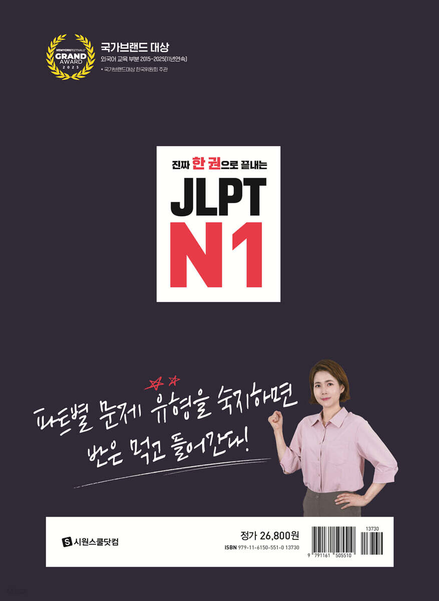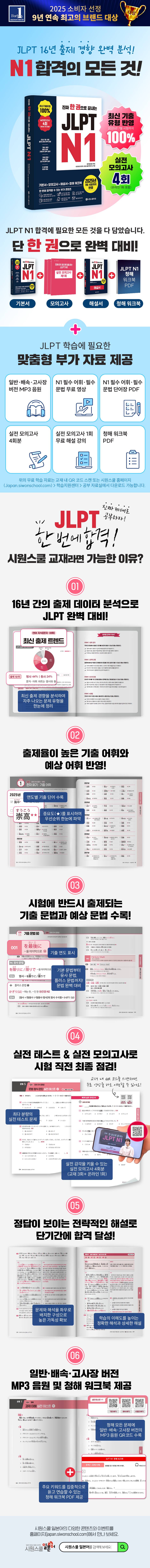 ① 16년 간의 출제 데이터 분석으로 JLPT 완벽 대비! 2010~2025년까지의 출제 경향을 철저히 분석하여, 자주 출제되는 문제 유형과 주제, 질문 등을 한눈에 파악할 수 있도록 제시하였습니다. 시험 유형과 동일한 기출 문제를 제공하여 빠르고 정확한 문제 풀이 요령까지 쉽게 이해할 수 있습니다. ② 출제율이 높은 어휘와 문법 반영! 16년간 출제되었던 기출 어휘와 문법을 연도별로 정리하고, 중요도까지 명확하게 표시하여 우선순위를 한눈에 파악할 수 있도록 구성하였습니다. 또한 출제 가능성이 높은 예상 어휘와 문법까지 함께 제시하여 보다 효과적으로 시험에 대비할 수 있습니다. ③ 실전 테스트 & 실전 모의고사로 시험 직전 최종 점검! 시험 유형에 익숙해질 수 있도록 최다 분량의 실전 테스트 문제를 수록하였으며, 각 테스트마다 제한 시간을 설정해 실제 시험과 같은 실전 감각을 키울 수 있도록 하였습니다. 또한 교재에 수록된 3회분과 온라인 제공 1회분을 포함한 총 4회분의 실전 모의고사를 풀어보며 시험 직전 최종 점검이 가능합니다. 1회 모의고사는 저자 직강의 무료 해설 강의도 함께 제공되어 이해도를 한층 높여줍니다. ④ 정답이 보이는 전략적인 해설로 단기간에 합격 달성! 정확한 해석과 함께 학습 이해도를 높이는 상세한 해설을 제공합니다. 정답뿐만 아니라 오답에 대한 이유까지 꼼꼼히 설명하여 실수를 줄이고 개념을 확실히 익힐 수 있도록 도우며, JLPT 문제 풀이 전략이 제시되어 있어 시험 노하우까지 습득할 수 있습니다. 학습의 편의를 위해 문제와 해석을 좌우 대칭으로 배치해 가독성을 높였으며, 모든 문제에 사용된 어휘를 상세히 정리하였습니다. ⑤ JLPT에 필요한 맞춤형 부가자료 제공! 청해 워크북을 제공하여 기본기를 탄탄히 다질 수 있을 뿐만 아니라 반복 학습을 통해 시험에 자주 출제되는 키워드를 자연스럽게 익힐 수 있습니다. 또한 실제 시험 속도와 동일한 MP3, 배속 버전, 고사장 소음 버전 등 다양한 음원으로 청해 실력을 한층 더 향상시킬 수 있으며, 2010년부터 2025년까지 매 시험마다 출제된 기출 어휘와 문법을 무료 영상으로 제공하여 이동 중이나 자투리 시간에도 효율적으로 학습할 수 있습니다. 「특별 부록」 ■ 다양한 버전의 MP3 음원 실제 시험 속도와 동일한 MP3 버전, 청해 실력을 끌어올리는 배속 버전, 실전 감각을 키우는 고사장 소음 버전까지, 다양한 버전의 MP3 음원으로 청해 실력을 효과적으로 향상시킬 수 있습니다. ■ N1 필수 어휘?필수 문법 무료 영상 및 PDF JLPT N1 시험에 자주 출제되는 필수 어휘 2,489개와 필수 문법 267개를 영상과 PDF로 제공합니다. 언제 어디서든 보고, 듣고, 따라 읽다 보면 어휘와 문법을 자연스럽게 익히고 시험에도 충분히 대비할 수 있습니다. ■ 실전 모의고사 4회분(교재 3회분 수록+온라인 1회분 제공) 실제 시험과 동일한 구성과 난이도로 제작된 실전 모의고사 4회분(교재 3회분 수록+온라인 1회분 제공)을 제공하여 실전 감각을 키울 수 있습니다. ■ 실전 모의고사 1회분 무료 해설 강의 모의고사 1회분에 대한 저자 직강 영상을 무료로 제공합니다. 직접 문제를 출제하고 분석한 저자가 출제 포인트를 정확히 짚어주는 강의로 단기간 내 고득점 달성이 가능합니다. ■ 청해 워크북 PDF 청해 영역에서 자주 출제되는 주요 키워드를 집중적으로 듣고 연습할 수 있는 워크북 PDF를 제공합니다. 음원을 들으며 받아쓰기를 반복하다 보면, 청해 기본기를 확실히 다질 수 있습니다. |