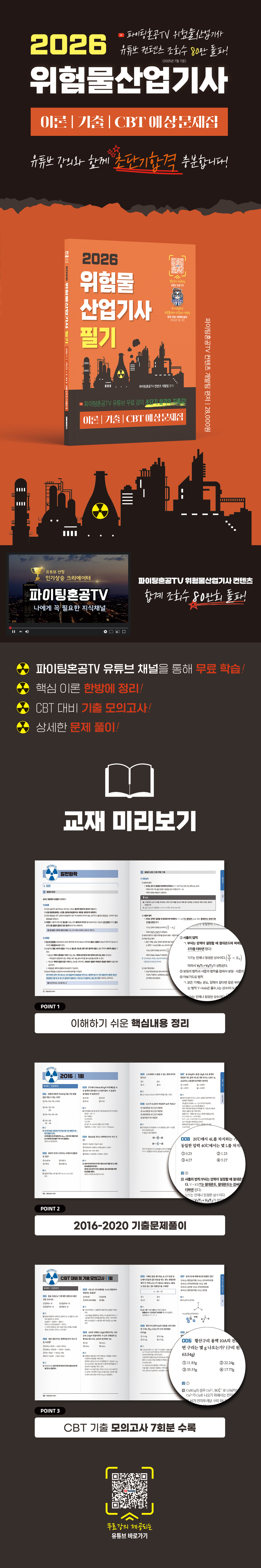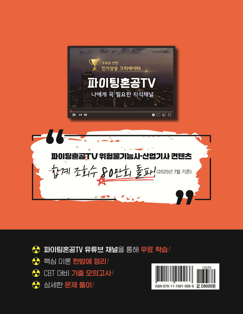 I. 일반화학 1. 물질 물질의 분류 012 물질의 상태: 고체, 액체, 기체 013 물질의 성질 015 용액 016 2. 주기율표와 원소의 주기적 성질 원자 019 주기율표 020 오비탈 전자 021 원소의 특성 023 팔전자 규칙(옥텟 규칙) 023 3. 화학물질의 단위인 몰과 화학반응식 원자량 024 몰 024 화학반응의 양적인 배수 관계 025 4. 화학결합 이온 결합 026 이온결합물질의 특성 027 다원자이온 027 금속결합 028 공유 결합 028 배위결합 030 결합에너지 030 전기음성도 030 극성 031 5. 분자의 구조 루이스 구조 033 결합의 구조 034 6. 화학평형 화학평형 035 평형 이동: 르 샤를리에 원리 035 촉매 036 7. 산과 염기 전해질/비전해질 036 산과 염기 037 pH척도 039 중화 반응 039 완충용액 041 8. 산화 환원반응 산화와 환원 041 산화수 041 9. 전기화학 화학 전지 043 전지의 종류 043 전기 분해 044 10. 탄소화합물 유/무기화합물 045 탄화수소 045 탄화 수소 유도체 047 II. 화재예방과 소화방법 1. 연소 연소의 3요소 051 연소의 종류 052 기타 개념 053 3. 화재 화재의 종류 054 화재의 특수현상 054 4. 폭발 폭발의 종류 055 폭발속도에 따른 분류 056 5. 소화(불을 끄는 것) 소화의 종류 056 소화약제 057 소화기 059 6. 소방시설 소화설비 060 경보설비 062 피난설비 063 7. 소화난이도 및 소방시설 적응성 소화난이도 064 소화설비의 적응성 068 III. 위험물 1. 위험물 정의 및 분류 071 기타 개념 071 위험물 종류 개관 072 각각의 위험물 082 2. 위험물의 저장, 운반, 취급 등의 관리 위험물의 저장/취급/운반 96 위험물 제조소 등의 시설 104 3. 위험물안전관리법령 사항 제조소 등의 설치 등 121 예방규정 122 정기점검 122 자체소방대 123 행정처분 124 벌칙 124 기출 문제 풀이 1. 2016년 1회 126 2. 2016년 2회 140 3. 2016년 3회 155 4. 2017년 1회 170 5. 2017년 2회 184 6. 2017년 3회 197 7. 2018년 1회 210 8. 2018년 2회 223 9. 2018년 3회 237 10. 2019년 1회 250 11. 2019년 2회 264 12. 2019년 3회 277 13. 2020년 1회 292 14. 2020년 2회 306 CBT 대비 및 기출 모의고사 1회 322 2회 336 3회 351 4회 364 5회 379 6회 393 7회 408 |