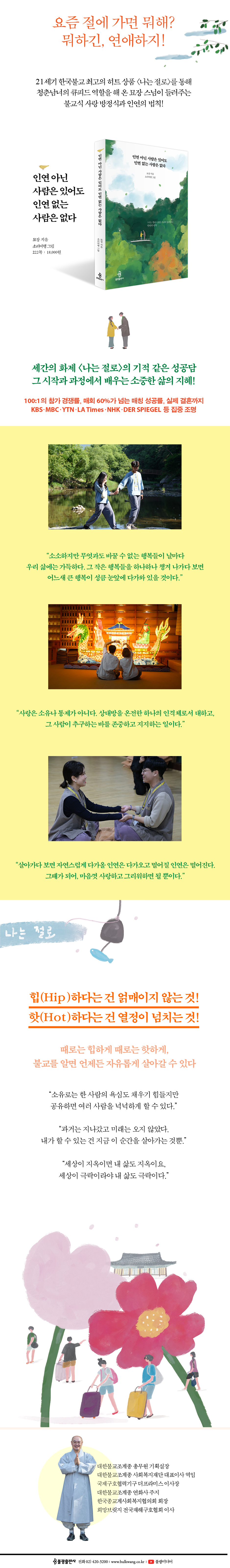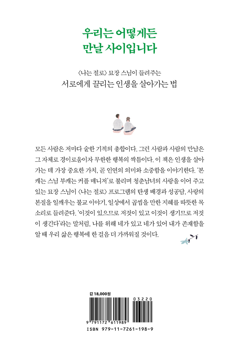 MZ세대를 사로잡은 불교문화콘텐츠 크리에이터, 묘장 스님이 전하는 팔만사천 가지 불교의 매력 요즘 가장 ‘핫’한 스님이 누구냐고 묻는다면 단연 묘장 스님이다. 스님은 〈나는 절로〉, 〈청년밥心〉, 〈부처님 생신 카페〉 등 전에 볼 수 없던 참신한 프로그램을 연이어 히트시키며 불교계를 넘어 전 국민의 마음을 사로잡은 트렌드세터(trend-setter)로 급부상했다. 특히 20~30세대에게 열렬한 지지를 받으며 ‘MZ 친화형 스님’, ‘힙한 불교의 프로듀서’, ‘본캐는 스님 부캐는 커플 매니저’ 등 재미난 별명이 생겨나기도 했다. 묘장 스님의 인기는 각종 방송과 언론을 통해서도 실감할 수 있다. MBC 예능 프로그램 〈선을 넘는 클래스〉와 〈놀면 뭐하니?〉에 출연한 것은 물론, 교계 안팎의 라디오 방송과 주요 신문사에서 섭외 요청이 끊이지 않고 있다. 정부와 지자체에서도 앞다퉈 스님이 기획한 프로그램에 협업을 제안하는 등 각계각층에서 러브콜을 보내고 있다. 심지어 『Los Angeles Times』, 『NHK』, 『DER SPIEGEL』 등 유력 해외 언론에서도 스님의 활약상을 소개했을 정도다. 묘장 스님이 만든 프로그램의 특징은 ‘근거 있는 힙(Hip)’이다. 부처님의 가르침으로 사람들의 어려움을 보살피되, 낡은 방식이 아닌 젊고 따뜻한 감각으로 다가간다. 누구나 거부감 없이 참여할 수 있는 재밌고 건전한 콘텐츠를 만들어 그 안에서 사람들이 각자의 고민을 조금씩 내려놓게 한다. 마치 부처님이 사람의 기질과 처한 상황에 따라 가르침을 펼쳤듯이 현대인의 눈높이, 사고방식, 생활방식에 맞게 불교를 각색한 맞춤 전략이다. 이로써 스님은 불교를 다시 삶과 연결시킨다. 탈종교화를 넘어 종교에 대한 부정적 인식이 커져 가는 이 시대에, 지금 여기서 살아 숨 쉬는 불교를 만들어 가고 있다. 한편 세간의 뜨거운 관심에도 불구하고 묘장 스님은 스스로를 낮춘다. ‘나’ 대신 ‘일’에 스포트라이트가 비치길 원한다. 자비(慈悲)를 실천함으로써 불교와 세상 사이의 벽을 허물고, 부처님 가르침으로 더 많은 사람이 행복해지도록 하는 데 뜻을 두고 있기 때문이다. “저에게 초점을 맞추지 마세요. 대신 저희가 하는 일과 그 안에 담긴 소중한 가치를 알렸으면 합니다.” 이 책을 기획할 때 거듭 스님이 당부했던 말이다. 출가 수행자로서 ‘잘나가는’ 스님이 되기보다 세상에 ‘꼭 필요한’ 스님이 되고 싶다는 게 묘장 스님의 바람이다. 나는 솔로? 나는 절로! MZ세대 마음을 훔친 역대급 히트 상품, 〈나는 절로〉 불교식 사랑 방정식으로 세상을 아름답게 물들이다 묘장 스님이 선보인 아이템 중 최고의 성과는 두말할 것 없이 〈나는 절로〉다. 인기 TV예능 ‘나는 솔로’에서 모티브를 얻어, 기존의 만남 템플스테이를 완전히 새롭게 재구성한 이 프로그램에 대중의 반응이 가히 폭발적이다. 최근 모집을 시작한 〈나는 절로, 강원도 신흥사〉 편은 이틀 만에 2,000명이 넘는 사람이 지원해 100:1이 넘는 경쟁률을 기록하기도 했다. 매회 커플 매칭 성공률이 60%를 웃돌고 실제로 결혼에 골인한 커플도 여럿 탄생했다. 잠시 즐기고 마는 일회성 이벤트가 아닌 신뢰도 높은 ‘이성 만남’ 콘텐츠로서 갈수록 사람들의 이목을 집중시키고 있다. “남녀의 결혼 인연을 만들어 주는 것이 수행자의 본분은 아니지만, 세상의 어려움을 보듬는 일이야말로 지극한 자비의 실천이기에 〈나는 절로〉를 운영하고 있습니다.” 묘장 스님의 말에서도 알 수 있듯이, 〈나는 절로〉는 단순한 연애 프로그램이 아니다. 최근 우리 사회의 화두 중 하나인 저출산 문제를 해결하는 데 그 목적이 있다. 현재 합계출산율이 0.7명에 불과한 대한민국은 장기적으로 심각한 인구 위기 상황에 놓여 있다. 이에 묘장 스님은 젊은 세대들의 만남을 장려하고, 결혼과 출산 그리고 양육에 대한 사회적 인식을 바꾸고자 애쓰고 있다. 말하자면 저출산, 인구 감소라는 사회적 문제에 대한 불교적 모색이자 응답이 바로 〈나는 절로〉이다. 이 책에는 〈나는 절로〉의 탄생 배경과 성공담, 불교의 사랑 이야기, 일상의 지혜를 담은 글이 실려 있다. 언뜻 동떨어져 보이는 이 주제들을 하나로 엮는 키워드는 ‘인연(因緣)’이다. 인연이라는 키워드로 그간 스님이 해 온 일들의 의미를 되짚어 보고, 삶에서 가장 중요한 가치인 인연의 참 의미와 소중함을 알려 준다. 또한 일상에서 어떻게 아름다운 인연을 쌓아갈 것인지에 대한 답을 들려준다. 30여 년간 출가자로 살면서 시대와 함께 호흡하고자 노력해 온 스님의 고민과 희망이 집약되어 있는 이 책은 불교가 현실과 만나는 방식에 대한 구체적인 제안이다. 관계를 지옥으로 만드는 욕심과 욕망, 우리에게 필요한 건 집착 없이 함께하는 지혜로운 동행의 기술이다! ‘옷깃만 스쳐도 인연’이라고 했다. 억겁의 시간을 지나 지금 나와 네가 존재하고, 억겁의 공간을 넘어 지금 이곳에서 함께한다는 건 그 자체로 경이로움이다. 하지만 언젠가부터 사람들은 관계를 버겁게 여기거나 성가셔하며, 남과 깊이 엮이지 않는 편이 안전하고 편안하게 사는 지름길이라고 믿기 시작했다. 왜일까? 갈수록 사람을 대하기가 힘들어지는 