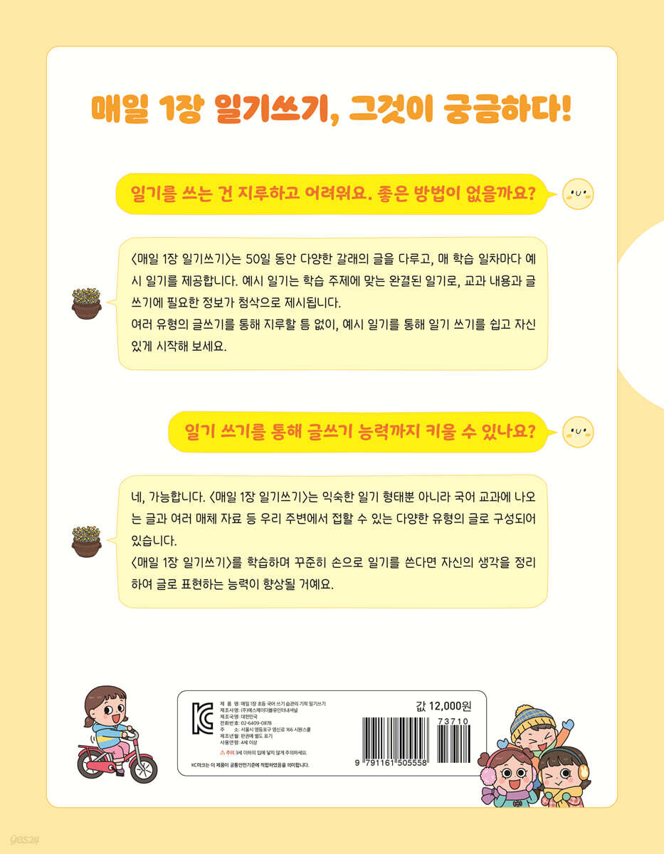 같은 일기 유형을 반복하지 않고, 매번 다른 주제와 예시 일기를 제시하여 지루하지 않은 일기 쓰기가 가능합니다. 뻔한 일기는 이제 그만! 신선한 소재의 일기와 다양한 종류의 글을 통해 ‘오늘은 어떤 내용으로 일기를 쓰지?’, ‘일기 쓰기는 너무 재미없어.’와 같은 고민할 필요 없이 즐겁게 일기를 쓸 수 있습니다. 첨삭과 예시 일기로 쉬운 일기 쓰기 가능 모든 학습 일차에 완결된 예시 일기 1편을 제시했고, 예시 일기에는 첨삭을 넣었습니다. 예시 일기는 학습 주제에 맞는 완결된 일기로, 글쓰기에 필요한 정보와 국어 교과에서 다루는 쓰기 관련 내용을 첨삭으로 제시했습니다. 이를 통해 아이들이 직접 일기를 쓸 때 도움을 받도록 하여, 어떤 구성과 방법으로 일기를 써야 할지에 관한 고민을 덜어 줍니다. 일기 쓰기를 통해 글쓰기 능력 향상 및 서?논술형 대비 설명문, 기행문, 논설문, 편지 등 초등학교 국어 교과에서 배우는 글의 유형과 기사문, 공익 광고, SNS 등 일상에서 접하는 유형의 글로 일기를 구성하여 학습 대상에 맞는 다양한 갈래의 글을 접하고 써 보게 됩니다. 따로 글쓰기 공부를 하지 않아도 매일 1장 일기쓰기를 통해 글쓰기 능력이 향상되고, 서?논술형 문제에도 대비할 수 있습니다. 국어 교과와 연계한 구성으로 교과 내용 습득 초등학교 국어 교과에서 주요하게 다루는 글의 유형을 본 도서의 일기 유형으로 다뤘고, 국어 교과 중 ‘쓰기’ 관련 내용을 예시 일기의 첨삭으로 제시했습니다. 매일 1장씩 50일간 예시 일기를 학습하고, 이를 참고하여 직접 손으로 일기를 쓰는 과정을 통해 교과 내용을 자연스레 익히게 됩니다. |