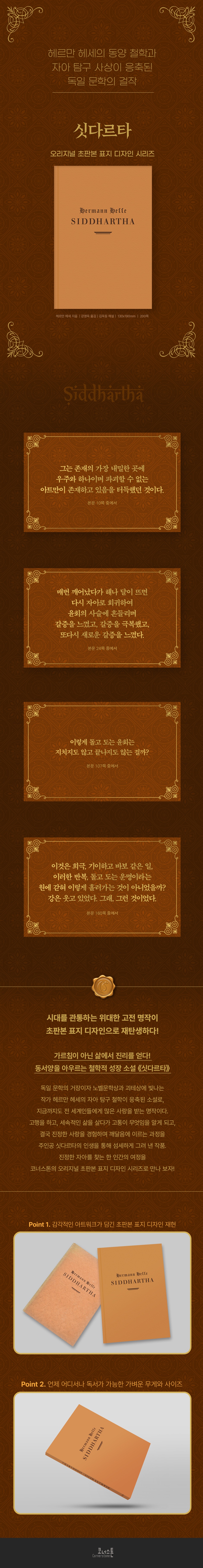 스스로 배우고, 스스로의 제자가 되어, 나 자신의 비밀을 알아 가다! 인도 카스트 제도에서 가장 높은 계급인 브라만의 아들로 태어난 싯다르타. 젊고 아름다운 청년인 그를 부모와 친구, 마을의 소녀들까지 모두가 사랑했지만 정작 싯다르타 자신은 스스로에게 만족하지 못했다. 그는 아버지와 스승들에게서 많은 것을 배워도 늘 채워지지 않는 갈증을 느꼈다. 그래서 결국 아버지의 반대를 뒤로하고 친구 고빈다와 함께 출가하여 사문의 무리에 들어가게 된다. 싯다르타는 사문이 되어 금욕적인 삶을 살며 고행을 하고, 끊임없이 새로운 것을 익히고, 명상을 통해 자신을 잊고 다른 존재가 되는 경지에까지 이르게 되지만 깨달음은 멀리 있으며 자신의 마음속에 여전히 채워지지 않은 것이 있음을 느낀다. 그 무렵 이미 깨달은 자인 가우타마의 소식을 듣게 된 싯다르타와 고빈다는 사문의 무리를 떠나 가우타마를 찾아 길을 나선다. 가우타마의 설법을 들은 고빈다는 깊이 감명받아 제자가 되기를 청하지만, 싯다르타는 가우타마의 가르침만으로는 해탈의 경지에 이를 수 없음을 깨닫게 된다. 스승의 가르침이 아닌 스스로 헤쳐 나가야만 깨달음에 이를 수 있음을 알게 된 싯다르타는 친구 고빈다와 헤어져 세상 속으로 그리고 한없이 이기적이면서도 욕망에 충실한 어린아이와도 같은 인간들 속으로 발을 내딛는다. 부딪치고 깨질지언정 앞으로 나아가 결국은 완성에 이르는 한 인간에 대한 이야기 헤르만 헤세의 삶이 녹아든 자전적 성장 소설 엄격하고 보수적인 기독교 집안에서 태어난 헤르만 헤세는 종교적으로 억압된 환경에서 자라야 했다. 그리고 이런 그에게 치유제가 되어준 것이 바로 인도학자이자 선교사였던 할아버지를 통해 접하게 된 동양 사상이었다. 맹목적인 믿음을 강요하는 가정과 신학교에서 괴로움과 권태를 느낀 헤세는 오랫동안 인간의 본성과 정체성을 탐구해 왔으며, 이 과정에서 겪게 되는 내적 갈등은 그의 작품을 관통하는 주제이기도 했다. 작가는 주인공 싯다르타의 삶을 보여 주며 기존의 규범이나 가르침이 아닌 스스로 경험하고 성찰하는 과정을 통해 깨달음을 이뤄내야 한다는 것을 알려준다. 주인공은 깨달음을 얻기 위해 늘 앞으로 나아간다. 벽에 부딪치면 새로운 길을 찾아 나서고, 절망해 주저앉더라도 다시 일어나 깨달음으로 가는 여정을 멈추지 않는다. 완벽한 무소유의 삶을 살면서 정신을 갈고 닦아도 보았고, 여인을 가까이하고 도박을 즐기며 오로지 감각만을 추구하는 삶을 살다가 마침내 깨달음에 이르는 싯다르타의 삶은 독자들에게 스스로를 탐구하고 자신만의 길을 찾아 앞으로 나아가라고 말해 준다. 시대를 초월한 가치와 철학적 통찰력으로 삶의 본질이란 과연 무엇인가라는 질문을 던지는 이 작품은 현대를 살아가는 우리에게 삶의 의미와 진정한 자신을 찾아가는 특별한 경험을 안겨 줄 것이다. 초판본 감성 그대로 읽고, 간직하고, 오래 기억되는 코너스톤 오리지널 초판본 표지 디자인 시리즈! 세월이 흐르고 시대가 변해도 진정한 고전은 사라지지 않는다. 그것은 단지 과거의 기록을 넘어, 여전히 현재의 우리에게 깊은 울림과 사유의 시간을 선물하는 살아 있는 이야기이기 때문이다. 코너스톤은 ‘오리지널 초판본 표지 디자인’ 시리즈를 통해, 헤르만 헤세의 대표작 《싯다르타》가 지닌 본연의 사색과 통찰을 되살려 오늘의 독자에게 더욱 깊고 따뜻한 감동으로 다가가고자 한다. 이번 판본은 《싯다르타》가 지닌 고요한 사유와 깊은 통찰을 시각적으로 담아내기 위해, 따뜻한 황토빛 커버 위에 절제된 타이포그래피가 돋보이는 초판본의 디자인을 그대로 살려냈다. 표지 중앙에 배치된 고딕체 영문 서체와 균형 잡힌 정렬은 작품이 지닌 철학적 무게감을 시각적으로 표현하며, 읽는 이로 하여금 작가와의 내밀한 만남을 상징적으로 경험하게 한다. 또한 초판본의 감각과 구성을 충실히 재현하여, 헤세가 전하고자 했던 메시지와 작품의 분위기를 온전히 보존하는 데 집중했다. 본문은 읽기 쉽도록 간결하고 정돈된 편집을 더했고, 한 손에 들리는 아담한 판형은 언제 어디서나 가볍게 펼쳐 사유의 여정을 시작할 수 있도록 돕는다. 이번 ‘오리지널 초판본 표지 디자인’ 시리즈는 단순한 재출간을 넘어, 문학이 시간을 넘어 여전히 살아 있다는 사실을 증명하는 한 권의 철학적 오브제가 될 것이다. 독자들이 이 특별한 판본을 통해 고전이 주는 깊이와 울림을 새롭게 발견하고, 삶의 본질을 향해 한 걸음 더 다가가는 지혜의 여정을 시작하게 되기를 기대한다. |