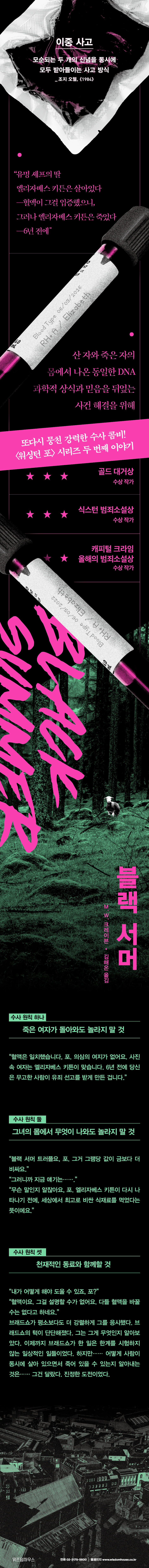 유명 셰프의 딸 엘리자베스 키튼은 살아 있다. 혈액이 그걸 입증했으니.그러나 엘리자베스 키튼은 죽었다. 6년 전에.독자의 부름에 더욱 강력해져 돌아온 수사 콤비!《퍼핏 쇼》의 폭풍을 이을 ‘워싱턴 포’ 두 번째 시리즈 출간★ 골드대거상 수상 작가★ 식스턴 범죄소설상 수상 작가★ 캐피털 크라임 올해의 범죄소설상 수상 작가미국의 대표 추리소설 작가 마이클 코넬리의 소설 속 형사 “해리 보슈에 대한 영국의 답”이라는 평을 받으며, “잔혹하면서도 스릴 넘치는 페이지터너”이자 “최고로 유쾌한 피투성이 이야기”(〈선데이 미러〉)로 각종 권위의 장르소설 상을 휩쓸어온 M. W. 크레이븐의 장편소설 《블랙 서머》가 위즈덤하우스에서 출간된다.《블랙 서머》는 2023년 출간된 《퍼핏 쇼》의 후속작이자 ‘워싱턴 포’ 시리즈 두 번째 책이다. 《퍼핏 쇼》를 읽은 독자들은 날카로운 감각의 형사 워싱턴 포와 천재 프로파일러 틸리 브래드쇼 “콤비의 활약에 얼른 다음 책이 나왔으면” 하고 바라면서, “후속작을 알리는 영리한 장치와 결말이 깊은 여운을 남긴다”며 시리즈에 대한 기대감을 아낌없이 밝혀왔다.산 자와 죽은 자의 몸속에서 나온 동일한 DNA과학적 상식과 믿음을 뒤엎는 이중 사고의 함정‘이중 사고’란 조지 오웰의 《1984》에서 파생된 개념으로 모순되는 두 개의 신념을 동시에 모두 받아들이는 사고를 말한다. 바야흐로 6년 전, 중범죄수사국 형사 워싱턴 포는 고급 레스토랑에서 벌어진 잔혹한 살인 사건의 신고를 받고 현장을 찾는다. 누구든 살아서 나갔을 리 없어 보이는 피투성이의 주방, 그리고 사라진 시신. 포는 당시 사건의 용의자로 피해자 엘리자베스 키튼의 친부이자 레스토랑 ‘벌리스 앤드 슬로’의 오너인 스타 셰프 재러드 키튼을 지목한다. 비록 엘리자베스의 시신은 찾을 수 없었지만 알리바이의 맹점과 치사량 이상의 혈흔을 증거로 키튼은 수감되고 6년이란 시간이 흐른 현재. 워싱턴 포의 눈앞에 자신이 죽은 엘리자베스 키튼이라고 주장하는 여성이 등장한다. 그녀의 혈액에서 엘리자베스 키튼의 DNA가 검출되고, 포는 집요한 수사 끝에 혈액 증거물은 결코 조작될 수 없었음을 확인한다.포는 태어나 처음으로 ‘이중 사고’라는 말을, 그가 좋아하는 책 조지 오웰 《1984》에서 처음 쓰인 그 문구를 이해하게 되었다. 그것은 두 가지 모순되는 생각을 동시에 믿는다는 뜻이었다. 엘리자베스 키튼은 살아 있었다 - 혈액이 그걸 입증했으니. 그러나 엘리자베스 키튼은 죽었다 - 그는 확신했다. _본문에서“블랙 서머 트러플요, 포. 그거 그램당 값이 금보다 더 비싸요.”사이코패스 살인마가 흘리고 간 단 하나의 단서를 추격하다수사를 거듭할수록 미궁에 빠져드는 포를 위해 그의 동료이자 천재적인 프로파일러 틸리 브래드쇼와 병리학자 에스텔 도일이 나서고 두 사람은 각각 맡은 과제를 풀기 위해 분투한다. 틸리 브래드쇼는 경찰 조사 이후 또다시 종적을 감춘 엘리자베스의 신원을 파악하고자 위장 수사를 감행하고, 에스텔 도일은 엘리자베스의 DNA가 숨기고 있는 실낱같은 무언가를 찾기 위해 혈액 속을 파고든다. 그러던 어느 날 에스텔 도일이 엘리자베스 키튼의 몸에서 나와서는 안 될 물질을 찾았다며 전화를 해오는데…….자신의 손으로 무고한 피해자를 만들었다는 포의 죄책감과 그럼에도 재러드 키튼에게서 풍기는 살인의 위화감 사이 사건의 진실을 향한 치열한 공방이 시작된다.“그래요, 포. 능력이 부족한 병리학자였다면 알아채지 못했을지 모르지만, 전에도 얘기했듯이 나는 그런 병리학자가 아니에요. 그건 THC가 아니라 전혀 다른 물질이었어요. 투버 아에스티붐(Tuber asestivum)에서만 발견되는 화학물질이었어요.”“투버 아에스티붐?”“블랙 서머 트러플요, 포. 그거 그램당 값이 금보다 더 비싸요.”“그러니까 지금 얘기는…….”“무슨 말인지 알잖아요, 포. 엘리자베스 키튼이 앨스턴 도서관에 나타나기 전에 세상에서 최고로 비싼 식재료를 먹었다는 뜻이에요.” _본문에서참신하고 통쾌한 문학적 체험, 위즈덤하우스 ‘워싱턴 포’ 시리즈2018년 출간 즉시 다음해 영국추리작가협회(CWA)에서 주관하는 영미 범죄문학 최고의 영광 ‘골드 대거상’을 수상한 《퍼핏 쇼》는 ‘포&틸리’ 시리즈라 불리며, 《셜록 홈즈》의 셜록&왓슨 이후 새로운 듀오의 탄생을 기다려온 독자에게 신선하고 유쾌한 경험을 선사했다. ‘워싱턴 포’ 시리즈의 매력은 지금껏 다뤄진 적 없는 참신한 사건과 추리 기법이라 할 수 있는데, 1편 《퍼핏 쇼》가 선사 유물인 ‘환상 열석’으로 불타 죽은 시신들과 연쇄살인을 연결지었다면, 2편 《블랙 서머》는 고급 식재료인 트러플과 피해자의 혈액에 천착하며 고도의 긴장과 재미를 꾀한다. 또한 이어서 출간될 3편 《큐레이터》에서는 미술관처럼 전시된 시체들과 아트 넘버링의 상관관계를 집요하게 파헤치며 크레이븐만의 발칙하고 영리한 추리의 세계로 독자를 초대할 예정이다.성탄절, 컴브리아 곳곳에 시체가 전시되기 시작한다. 그리고 현장에 남겨진 이상한 메시지. #BSC6. 워싱턴 포와 틸리 브래드쇼는 사건