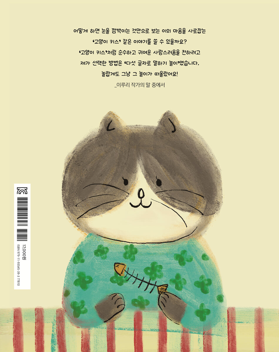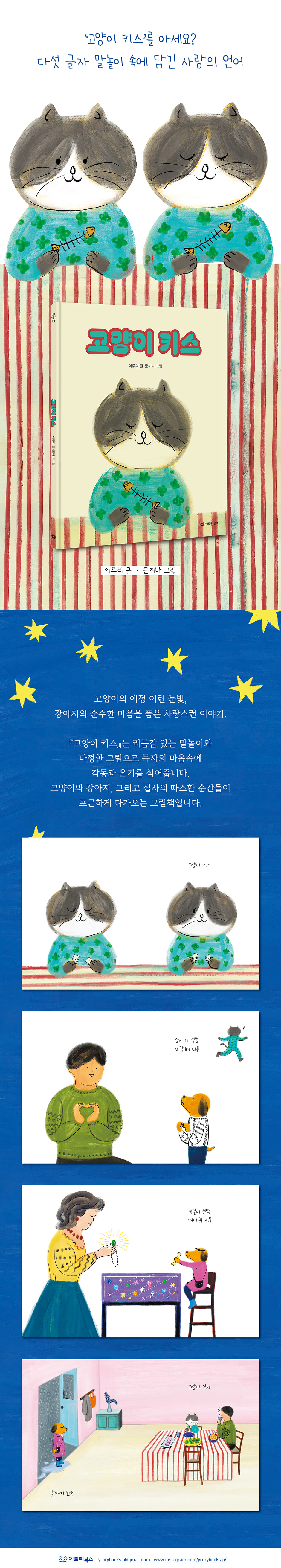 ‘고양이 키스’란 고양이가 눈을 천천히 깜박여 상대에게 사랑을 전하는 눈짓입니다. 이루리 작가는 이 귀여운 애정표현을 ‘다섯 글자 말놀이’로 풀어냈습니다. 다섯 글자 말놀이 한 줄마다 사랑이 피어납니다. 통통 튀는 리듬감이 이야기를 더 유쾌하게 만듭니다. 그런데 다 읽고 나면 유쾌하지만 깊은 울림을 줍니다. 화이트 레이븐스 선정 작가 문지나의 신작 그림책 문지나 작가는 『버찌잼 토스트』, 『고요한 나라를 찾아서』 등으로 서정적인 드라마와 감각적인 표현력을 인정받았습니다. 이번 작품에서는 특별히 다정하고도 사랑스러운 캐릭터를 만들어냈습니다. 어떻게 이렇게 사랑스러운 고양이와 강아지 캐릭터를 만들었을까요? 문지나 작가가 만든 고양이와 강아지 배우 덕분에 독자들은 그림책 ‘고양이 키스’의 매력 속으로 푹 빠져듭니다. 꿈을 이루어 주는 그림책 『고양이 키스』 탄생! 이 책은 영화 〈고양이 키스〉의 소품 그림책으로부터 출발했습니다. 영화 속 인물이 그림책 작가로 등장하는데, 문지나 작가가 영화 속 그림을 그렸습니다. 이루리 작가는 소품이 아닌 진짜 『고양이 키스』 그림책을 만들고 싶었습니다. 그리고 마침내 이루리가 쓴 글로 문지나 작가가 그림책을 만들었습니다. 꿈이 현실이 된 것입니다. 그림책 『고양이 키스』는 사랑의 그림책이자, 모든 이의 꿈을 이루어 주는 그림책입니다. ★누리과정 및 교과연계★ · 누리과정: 의사소통 (듣기와 말하기) 사회관계 (더불어 생활하기) · 교과연계: 1학년 1학기 국어 5. 다정하게 인사해요. 2학년 1학기 국어 1. 시를 즐겨요 2학년 1학기 국어 3. 마음을 나누어요 2학년 1학기 국어 4. 말놀이를 해요 작가의 말 윙크 한 번으로 마음을 사로잡는 방법 그림책 『고양이 키스』는 영화 〈고양이 키스〉 덕분에 쓰게 된 작품입니다. 어느 날 오랜 친구인 아토 영화사 김순모 대표에게서 연락이 왔습니다. 새로 제작하는 영화의 주인공 역할이 그림책 작가인데 영화 속에 사용할 그림과 그림책을 그려줄 그림책 작가를 소개해 달라고 했습니다. 북극곰 출판사에서 나온 그림책을 여러 권 보여 주었습니다. 영화 제작자와 감독이 선택한 작가가 바로 『고요한 나라를 찾아서』, 『엄마가 낮잠을 잘 때』, 『버찌잼 토스트』를 만든 문지나 작가였습니다. 그렇게 영화 〈고양이 키스〉 덕분에 눈을 깜박이는 것만으로, 보는 이의 마음을 사로잡는 ‘고양이 키스’의 매력을 알게 되었습니다. 그리고 불현듯 아이디어가 떠올랐지요. ‘그래! 영화 속에 들어 갈 소품 그림책 『고양이 키스』 말고 진짜 그림책 『고양이 키스』를 만들어 보자!’ 저는 곧 바로 『고양이 키스』의 초고를 쓰기 시작했습니다. 어떻게 하면 눈을 깜박이는 것만으로 보는 이의 마음을 사로잡는 ‘고양이 키스’ 같은 이야기를 쓸 수 있을까요? ‘고양이 키스’처럼 순수하고 귀여운 사랑스러움을 전하려고 제가 선택한 방법은 ‘다섯 글자로 말하기 놀이’였습니다. 놀랍게도 그냥 그 놀이가 떠올랐어요! 그리고 정말 장난처럼 순식간에 『고양이 키스』 이야기를 썼습니다. 고양이 키스, 강아지 궁금 집사가 설명, 사랑해 너를 강아지 감동, 꼬리를 살랑 온몸을 팔짝, 고양이 쿨쿨 강아지 결심, 쇼핑몰 도착 목걸이 선택, 뼈다귀 지불 뼈다귀 거절, 목걸이 반납 강아지 귀가, 고양이 식사 강아지 빈손, 고양이 궁금 강아지 미안, 고양이 키스 강아지 기절, 집사가 꼬옥 저는 원고를 문지나 작가에게 보냈고 작가님은 흔쾌히 작업을 수락했습니다. 보수적인 편집자들의 요청에 따라 다르게도 써보았지만, 다시 초고의 다섯 글자 놀이로 돌아오고 말았습니다. 말놀이가 주는 순순한 재미가 그림책 『고양이 키스』를 탄생시켰기 때문입니다. 재미가 없으면 진정한 아름다움도, 진정한 의미도 없습니다. 예술가는 독자를 가르치는 사람이 아니라 독자를 행복하게 만드는 사람입니다. 그리고 독자는 재미있는 것을 보고 스스로 배우고 성장합니다. 이것이 예술이 사람의 마음을 어루만지고 키우는 방식입니다. _이루리(작가/세종사이버대학교 교수 |