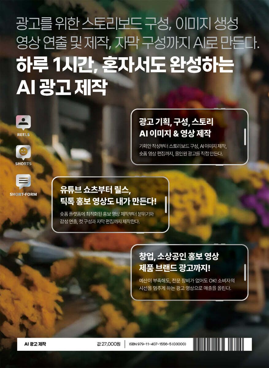 광고 실무자가 알려주는 AI 홍보·광고 제작! 광고 실무자가 직접 전하는 AI 홍보·광고 제작의 모든 노하우를 한 권에 담았습니다. 창업 및 소상공인의 홍보 영상부터 제품 브랜드 광고까지, 최신 챗GPT-5와 소라 AI를 비롯해 미드저니, 런웨이, 루마 AI, 딥페이크 광고 등 다양한 AI 도구를 완벽히 연동하여, 전문 장비나 높은 예산 없이도 소비자의 시선을 사로잡는 유튜브 쇼츠, 인스타 릴스, 틱톡 숏폼 영상을 직접 제작할 수 있습니다. 감성적인 분위기 연출, 효과적인 컷 구성, 세련된 자막 편집, 광고 기획과 스토리보드 작성, AI 이미지·영상 생성, 영상 편집 전 과정을 상세히 소개하여 누구나 쉽고 빠르게 매출 상승으로 이어지는 AI 기반 홍보·광고 콘텐츠를 직접 만들어낼 수 있도록 안내합니다. 광고 기획, 구성, 스토리, AI 이미지&영상 제작 기획안 작성부터 스토리보드 구성, AI 이미지 제작, 숏폼 영상 편집까지 올인원 광고를 직접 만든다. 유튜브 쇼츠부터 릴스, 틱톡 홍보 영상도 내가 만든다! 숏폼 플랫폼에 최적화된 홍보 영상 제작부터 분위기와 감성 연출, 컷 구성과 자막 편집까지 제작한다. 창업, 소상공인 홍보 영상 제품 브랜드 광고까지! 예산이 부족해도, 전문 장비가 없어도 OK! 소비자의 시선을 멈추게 하는 광고 영상으로 매출을 올린다. |