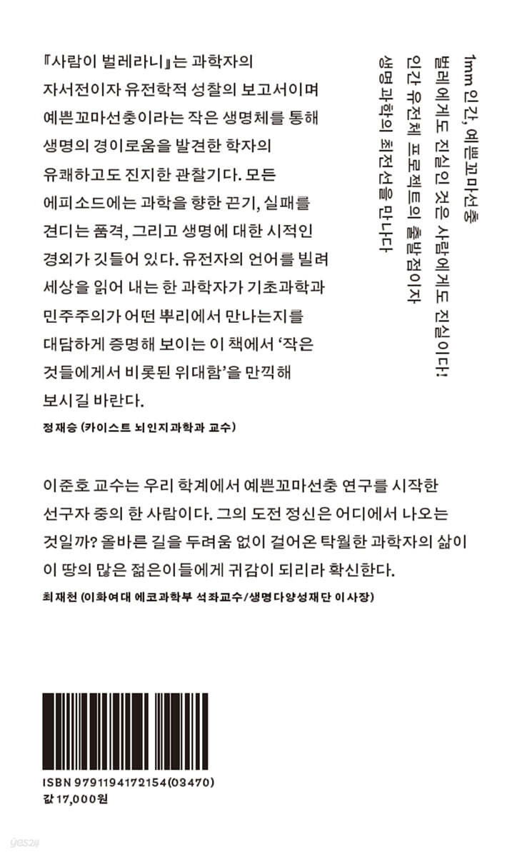 『사람이 벌레라니』는 과학자의 자서전이자 유전학적 성찰의 보고서이며, 예쁜꼬마선충이라는 작은 생명체를 통해 생명의 경이로움을 발견한 학자의 유쾌하고도 진지한 관찰기다. 저자 이준호 교수는 30년에 걸친 연구자의 시간을 단단한 서사로 풀어내며, 독자에게 놀라운 과학적 사실들과 깊은 공감과 웃음의 이야기들을 절묘하게 선사한다. 닉테이션이라는 생소한 행동양식에서 암세포의 텔로미어 유지 기전까지, 그리고 주당(jud) 유전자에 이어 소주(soj) 유전자를 찾는 실험실의 해학적 순간까지, 모든 에피소드에는 과학을 향한 끈기, 실패를 견디는 품격, 그리고 생명에 대한 시적인 경외가 깃들어 있다. 유전자의 언어를 빌려 세상을 읽어 내는 한 과학자가 기초과학과 민주주의가 어떤 뿌리에서 만나는지를 대담하게 증명해 보이는 이 책에서 ‘작은 것들에게서 비롯된 위대함’을 만끽해 보시길 바란다. - 정재승 (카이스트 뇌인지과학과 교수)