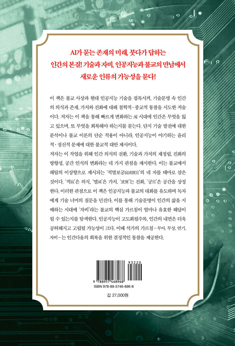 인공지능과 불교의 자비를 전면에 내세운 이 책은 불교 사상과 현대 인공지능 기술을 접목시켜 기술문명 속 인간의 의식과 존재, 가치와 진화에 대해 철학적·종교적 통찰을 시도한 저술이다. 저자는 빠르게 변화하는 AI 시대에 인간은 무엇을 잃고 있으며, 또 무엇을 회복해야 하는지를 묻는다. 이 책은 기술 발전에 대한 분석이나 불교 이론의 단순 적용이 아니며, 인공지능이 야기하는 윤리적·정신적 문제에 대한 불교적 대안을 제시하고 있다. 저자는 이 작업을 위해 인간 의식의 전환, 기술과 가치의 재정립, 진화의 방향성, 공간 인식의 변화라는 네 가지 관점을 제시한다. 즉 불교에서 해탈의 이상향으로 제시되는 ‘적멸보궁(寂滅寶宮)’의 네 글자를 테마로 삼았으며, ‘적’은 의식, ‘멸’은 가치, ‘보’는 진화, ‘궁’은 공간을 상징한다. 이를 중심으로 저자는 인공지능과 불교의 대화를 유도하며 독자에게 기술 너머의 질문을 던진다.