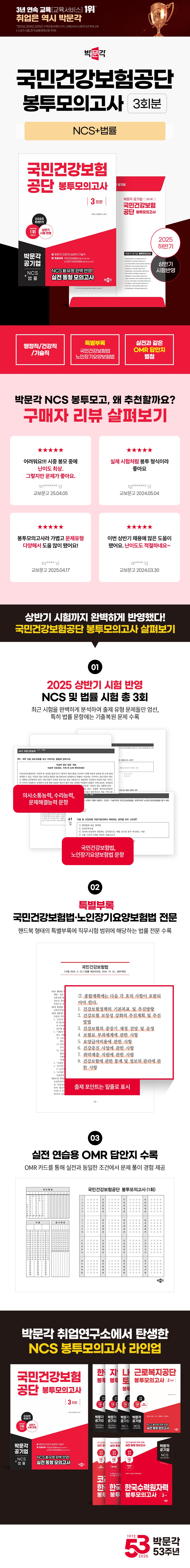 제2회 모의고사_ NCS 직업기초능력+법률(국민건강보험법, 노인장기요양보험법) 제3회 모의고사_ NCS 직업기초능력+법률(국민건강보험법, 노인장기요양보험법) 정답 및 해설 특별부록(국민건강보험법 / 노인장기요양보험법) |