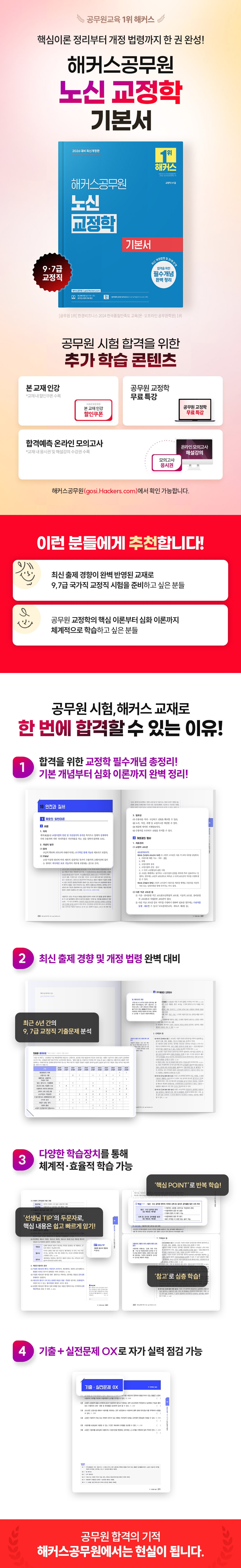 합격을 위한 필수개념 총정리 [이런 분에게 추천합니다] 1. 최신 출제 경향이 완벽 반영된 교재로 9, 7급 국가직 교정직 시험을 준비하고 싶은 분들 2. 공무원 교정학의 핵심 이론부터 심화 이론까지 체계적으로 학습하고 싶은 분들 [해커스 교재만의 특장점] 1. 합격을 위한 교정학 필수개념 총정리! 기본 개념부터 심화 이론까지 완벽 정리! 공무원 시험 합격을 위한 기본서로, 반드시 알아두어야 할 기본 개념부터 고득점을 위한 심화 이론까지 체계적으로 수록하여 교정학을 공부하는 학습자들이 기초를 다지고 실력을 쌓을 수 있습니다. 2. 최신 출제 경향 및 개정 법령 완벽 대비 1) 최근 6년 간의 9, 7급 교정직 기출문제를 분석하여 파악한 출제 경향과 주요 키워드를 대단원 도입부에 제시하고 교재 내에 수록된 모든 이론에 이를 반영하였습니다. 최신의 출제 경향 및 흐름에 맞추어 공무원 교정학을 학습하실 수 있습니다. 2) 최근 제/개정된 법령과 최신 판례들을 전면 반영하여, 정확한 내용으로 시험을 대비할 수 있습니다. 3. 다양한 학습장치를 통해 체계적이고 효율적인 학습 가능 1) 반드시 암기가 필요한 내용은 '선생님 TIP'으로 두문자를 함께 수록하여 핵심 내용을 보다 쉽고 빠르게 암기할 수 있습니다. 2) 비교하여 자주 출제되는 개념들은 ‘핵심 POINT’에 표로 정리하여 효율적으로 반복 학습할 수 있고, 본문과 함께 알아두어야 할 이론은 ‘참고’에 담아 심층적인 학습이 가능합니다. 4. 기출+실전문제 OX로 스스로 실력 점검 가능 9, 7급 교정학 기출문제 중 재출제 가능성이 높은 기출지문과 예상지문을 엄선하여 OX문제로 수록하였습니다. 이를 통해 학습한 이론을 다시 한번 점검할 수 있습니다. [공무원 시험 합격을 위한 해커스공무원만의 추가 학습 자료 (해커스공무원 gosi.Hackers.com)] 1. 본 교재 인강(할인쿠폰 수록) 2. 공무원 교정학 무료 특강 3. 합격예측 온라인 모의고사(응시권 및 해설강의 수강권 수록) [공무원 교육 1위] 한경비즈니스 2024 한국품질만족도 교육(온, 오프라인 공무원학원) 1위 |
