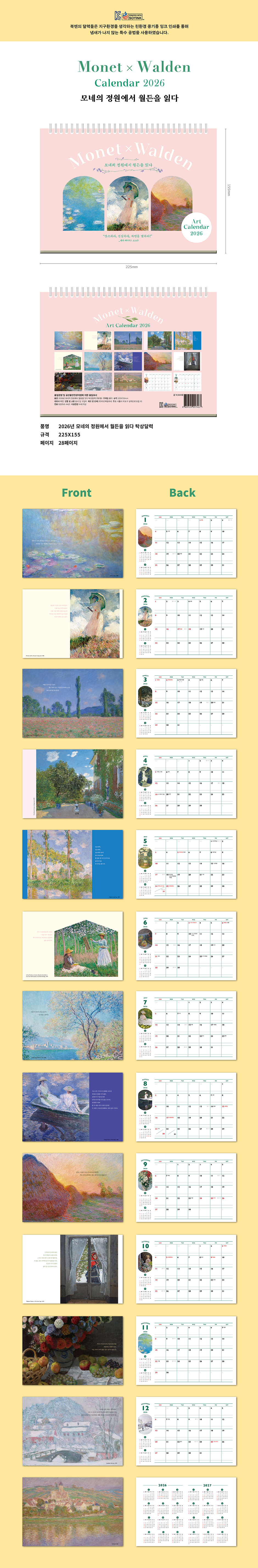 ‘살롱전 입선’이라는 목표만 남고 정작 ‘예술’은 실종되어 버린 세태에 반발, 자연으로 뛰쳐나가 직접 햇살과 대기 안에서 눈에 보이는 대로의 풍경을 어떤 각색도 없이 그려서 ‘인상주의’라는 새로운 길을 개척한 화가, 클로드 모네! ‘돈도 능력’이라는 자본주의적 시스템이 장밋빛 청사진만을 제시하며 전 세계로 퍼져가던 초창기에 자연에 종속되는 인간, 자연을 파괴하는 문명의 위험성을 일찌감치 꿰뚫어보고 《월든》이라는 강력한 경고의 메시지를 남겼던 사상가, 헨리 데이비드 소로! 두 거장의 예술과 사상이 어우러진 2026년 모네의 정원에서 월든을 읽다 탁상달력 가 나왔다. 모네의 아름다운 그림에, 《월든》의 깊이 있는 글을 더해서 1년 내내 오랫동안 바라보며 감상하고 사색할 수 있는 매력적인 달력이다. 앱을 이용한 효율적인 일정 관리를 강조하며 줄어들던 종이달력 사용이 다시 늘고 있는 이유는 시간을, 하루를, 1년을, 삶을 관리하는 데에는 ‘빠른 속도’보다 ‘느린 사색’이 더 중요하기 때문이다. 북엔 2026년 달력은, 지구환경을 생각하는 친환경 콩기름 잉크로 인쇄하였다.