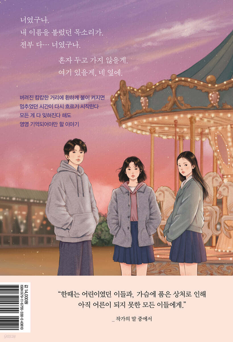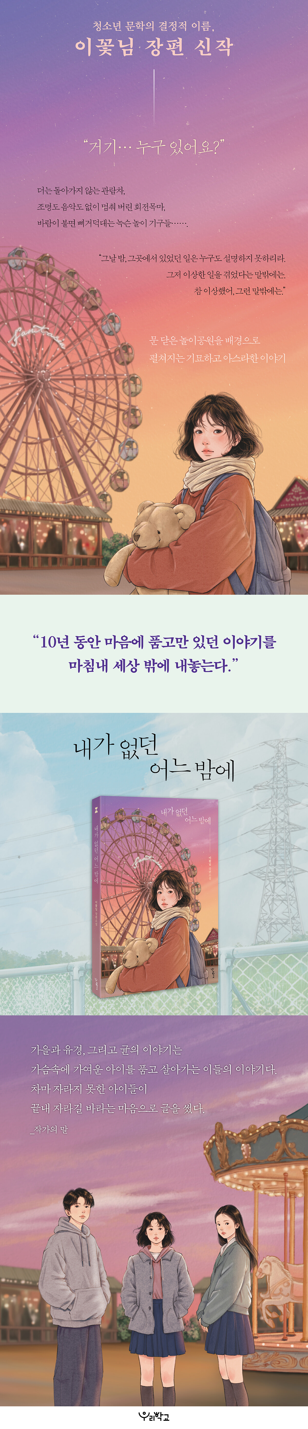 “부디 이 이야기의 끝에 평안이 있기를” 더 이상 돌아가지 않는 불 꺼진 관람차, 바람이 불면 삐거덕대는 녹슨 철문과 놀이 기구들. 더는 어떤 즐거운 비명도 들리지 않는 폐쇄된 놀이공원 판타지아. 3년 전 문을 닫은 놀이공원은 그곳에 기대 살아가던 지방 소도시의 작은 동네를 서서히 불안과 무기력의 늪으로 끌고 들어간다. 새해가 시작되었지만 썰렁하기만 한 거리에서 미심쩍은 일들이 하나둘씩 일어나고, 만 열일곱 소녀의 실종 사건을 계기로 묻어 두었던 10년 전 사건의 비밀이 밝혀지기 시작하는데……. 우리 청소년 문학의 결정적 이름이 된, 밀리언셀러 이꽃님 작가가 10년 동안 가슴속에 품어 온 이야기를 풀어놓은 장편소설 『내가 없던 어느 밤에』가 출간되었다. 문 닫은 놀이공원을 배경으로 펼쳐지는 기묘하고 아스라한 이야기 버려진 캄캄한 거리에 환하게 불이 켜지며 멈추었던 시간이 다시 흐르기 시작하는데… 새 작품을 집필하고 있다는 작가의 연락만큼 편집자의 심장을 뛰게 만드는 일이 또 있을까? 그러나 작품을 집필하는 동안 작가는 줄곧 낮은 목소리로 소식을 전해 왔다. 초고를 받아 작품의 마지막 문장을 읽었을 때에야, 작가의 마음을 조금은 짐작할 수 있었다. 아파하지 않고서는 쓸 수 없는 이야기였다. 이꽃님 작가는 이 이야기를 무려 10년 동안이나 가슴속에 품어 왔다고 했다. “저는 지금도…… 하나도 괜찮지 않아요.” 작품을 위한 취재 과정에서 인터뷰했던 학생의 덤덤한 말은, 작가의 마음에 무거운 돌을 하나 얹어 두었다. “차마 자라지 못한 아이들이 끝내 자라길 바라는 마음으로 글을 썼다. 한때는 어렸던 이들과, 가슴에 품은 상처로 어른이 되지 못하는 이들이 더는 아프지 않기를, 부디 힘차게 나아가기를. 온 마음을 다해 응원한다.” _ 작가의 말 중에서 그러니 누구라도 이 작품을 읽어 나가기 시작하면 간절히 바랄 수밖에 없을 것이다. 부디 이 이야기의 끝에 평안과 희망이 있기를. “너였구나. 내 이름을 불렀던 목소리가. 전부 다… 너였구나. 혼자 두고 가지 않을게. 여기 있을게, 네 옆에.” 상실을 딛고 치유와 희망으로 나아가는 비밀스럽고 가슴 뭉클한 성장담 슬픔을 공유한 사람들만이 나눌 수 있는 이야기가 있다. 상실을 겪은 이들만이 가지는 아픔과 후회가 있다. 문 닫은 한겨울의 놀이공원에서 일어난 기묘하고 아스라한 사건은, 주인공들이 각자 감춰 온 슬픔과 죄책감을 한자리에서 나누는 시간을 만들어 준다. 서로의 진심을 솔직하게 마주한 주인공들은, 마침내 과거와 현재를 연결하며 새로운 삶의 출발선에 선다. 그러면서 아직 어른이 되지 않은 십 대들의 목소리로 작가는 묻는다. “다들 그냥 이렇게 어른이 된 걸까. 그렇게 어른이 되어도 되는 건가? 그래서 세상이 엉망진창인 건가. 진짜 어른도 아닌 사람들이 어른인 척 살고 있어서.” 차가운 세계를 정면으로 응시하며 삶의 중요한 문제들을 놓치지 않는 서사 이꽃님 작가는 한번 펼치면 눈을 뗄 수 없는 전개로 셀 수 없는 독자에게 사랑받는 이야기꾼인 동시에, 우리 세계의 문제들을 정면으로 응시하는 작가다. 발표하는 작품마다 공전의 베스트셀러가 된 것은 재미 너머에 시대정신을 비껴가지 않는 메시지가 늘 존재했기 때문일 것이다. 『내가 없던 어느 밤에』는 그런 작가적 역량이 특히 빛을 발하는 작품이다. 기억과 책임, 치유와 성장의 의미를 묻는 이 책은 이꽃님의 문학 세계를 이해하기 위해 반드시 읽어야 하는 작품이다. 어떤 이야기는 잊지 않는 것만으로도 모두의 삶을 나아가게 만든다. 그래서 이꽃님의 이야기는 내일을 위한 문학이다. 책을 들추기 싫어하는 청소년들을 문학의 세계로 이끌기에, 그렇게 펼친 책에서 자신과 세계를 새롭게 만나도록 하기에. |