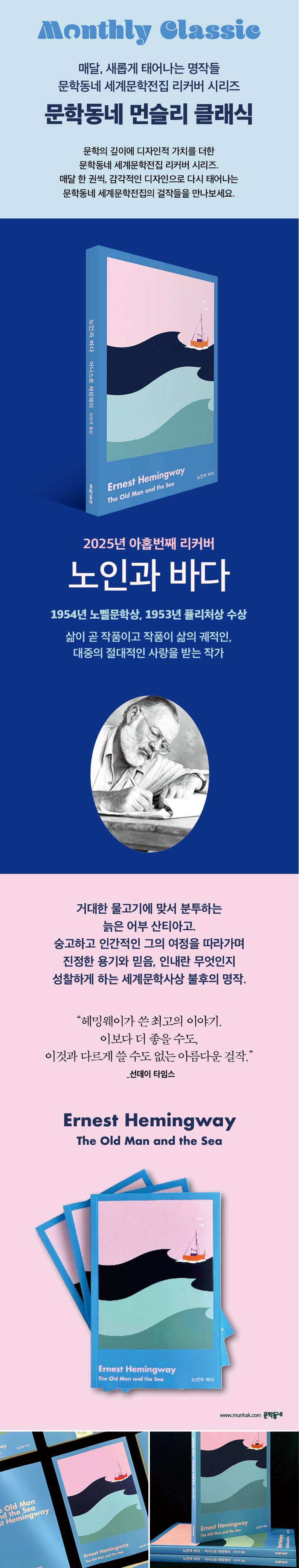 다시 만나는 세계문학 ‘먼슬리 클래식’ 그 아홉번째 책은 어니스트 헤밍웨이의 대표작 『노인과 바다』다. 쿠바 연안에서 고기잡이를 하며 살아가는 한 노인의 이야기를 강렬한 이미지와 간결한 문체로 그려낸 이 작품은 1952년 『라이프』지 9월호에 처음 발표되어 열광적인 호응을 불러일으키면서 곧바로 단행본으로 출간되었고, 이듬해인 1953년 헤밍웨이에게 퓰리처상을 안겨주었다. “서사 기법에 정통하고 현대문학의 스타일에 간과할 수 없는 영향을 미쳤다”는 평가를 받으며 헤밍웨이가 1954년 노벨문학상을 수상하는 데도 큰 역할을 했다.