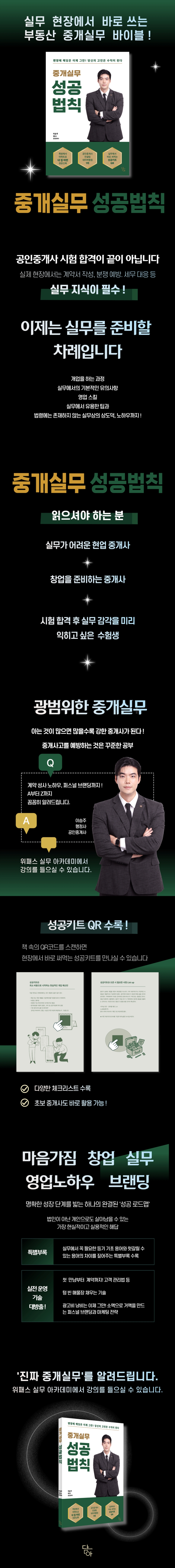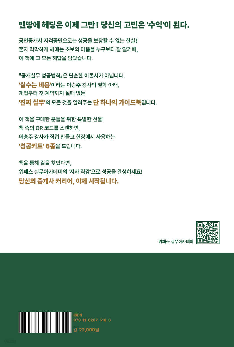 치열한 경쟁 속 공인중개사로 살아남기 위해서는 단순히 경험만으로는 부족하다. 『중개실무 성공법칙』은 저자 이승주의 현장 경험과 법적 통찰을 바탕으로 개업 준비부터 성공적인 자리 잡기까지의 과정을 알차게 담아냈다. 고객의 신뢰를 얻고자 하는 이에게 꼭 필요한 실무 가이드이다. 이 책을 통해 공인중개사로서 나아가야 할 길이 명확히 보일 것이다.